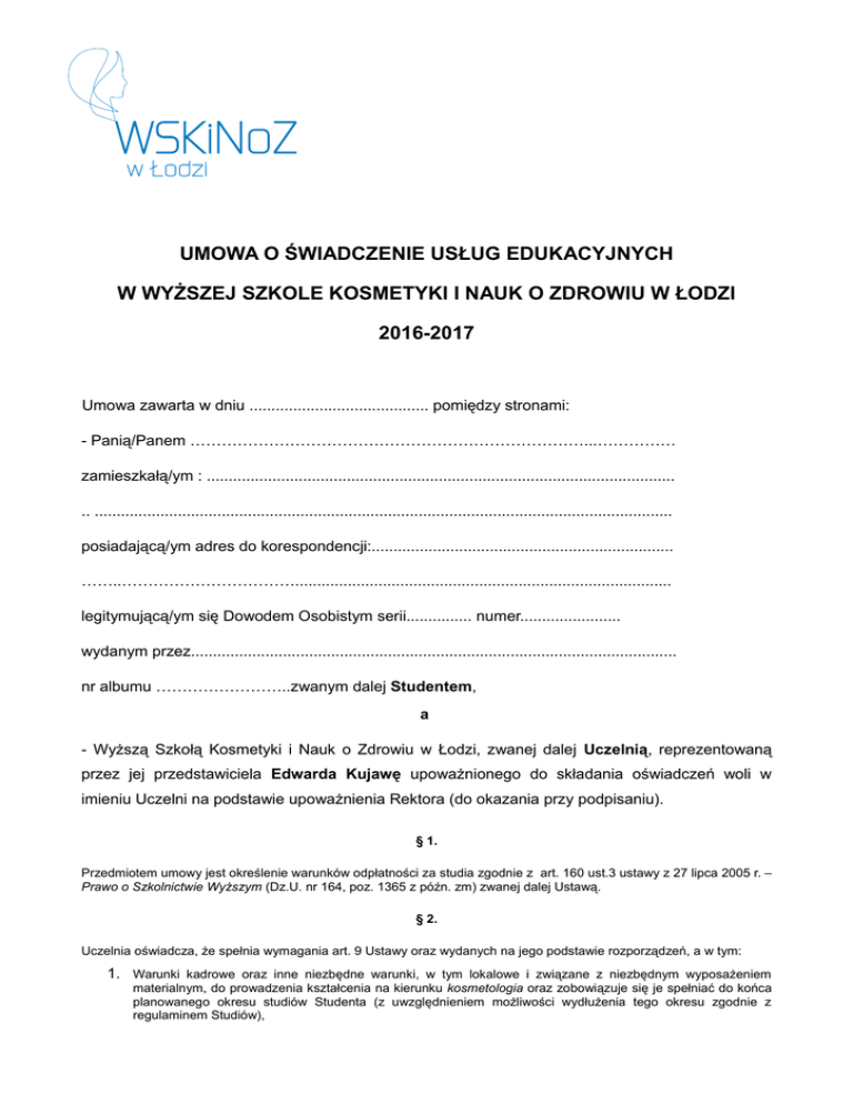 UMOWA O ŚWIADCZENIE USŁUG EDUKACYJNYCH W WYŻSZEJ SZKOLE KOSMETYKI I NAUK O ZDROWIU W ŁODZI 2016-2017 Umowa zawarta w dniu ......................................... pomiędzy stronami: - Panią/Panem …………………………………………………………………...…………… zamieszkałą/ym : ........................................................................................................... .. .................................................................................................................................... posiadającą/ym adres do korespondencji:..................................................................... ……..……………………………...................................................................................... legitymującą/ym się Dowodem Osobistym serii............... numer....................... wydanym przez............................................................................................................... nr albumu ……………………..zwanym dalej Studentem, a - Wyższą Szkołą Kosmetyki i Nauk o Zdrowiu w Łodzi, zwanej dalej Uczelnią, reprezentowaną przez jej przedstawiciela Edwarda Kujawę upoważnionego do składania oświadczeń woli w imieniu Uczelni na podstawie upoważnienia Rektora (do okazania przy podpisaniu). § 1. Przedmiotem umowy jest określenie warunków odpłatności za studia zgodnie z art. 160 ust.3 ustawy z 27 lipca 2005 r. – Prawo o Szkolnictwie Wyższym (Dz.U. nr 164, poz. 1365 z późn. zm) zwanej dalej Ustawą. § 2. Uczelnia oświadcza, że spełnia wymagania art. 9 Ustawy oraz wydanych na jego podstawie rozporządzeń, a w tym: 1. Warunki kadrowe oraz inne niezbędne warunki, w tym lokalowe i związane z niezbędnym wyposażeniem materialnym, do prowadzenia kształcenia na kierunku kosmetologia oraz zobowiązuje się je spełniać do końca planowanego okresu studiów Studenta (z uwzględnieniem możliwości wydłużenia tego okresu zgodnie z regulaminem Studiów), § 3. 1. Uczelnia oświadcza, że: a) warunki studiów są określone zgodnie z wymienionymi w art. 160 i 161 Ustawy, a szczegółowe warunki studiowania w kolejnym semestrze/roku akademickim, zawierające: wykaz przedmiotów wraz z liczba godzin wykładów, ćwiczeń, laboratoriów i praktyk, miejsce, czas i sposób ich prowadzenia oraz warunki zaliczenia poszczególnych przedmiotów, będą podawane do wiadomości Studenta za pośrednictwem strony internetowej www.wyzszaszkolakosmetyki.pl oraz na tablicy ogłoszeniowej przed rozpoczęciem każdego semestru/roku akademickiego. b) podjęte przez studenta studia kończą się uzyskaniem tytułu zawodowego licencjata, do nadawania którego Uczelnia ma uprawnienia i zobowiązuje się utrzymywać je do końca okresu wskazanego w § 2. pkt.1 2. Student oświadcza, że zapoznał się i akceptuje postanowienia niniejszej Umowy o świadczenie usług edukacyjnych w WSKiNoZw Łodzi a także Statut Uczelni oraz Regulamin Studiów obowiązujący w Uczelni, których treść znajduje się na stronie www.wyzszaszkolakosmetyki.pl., 1. Za świadczone usługi edukacyjne Student zobowiązuje się uiścić czesne: § 4. a) za studia stacjonarne w wysokości 2400,00 zł za semestr (semestry I, II, III, IV, V) – 3000,00 zł za semestr VI - płatne : • jednorazowo w terminie do dnia 31 października za semestr zimowy i do 31 marca o za semestr letni lub • ratalnie – w 6 ratach miesięcznych po 400,00 zł/m-c i 500,00 zł/m-c rata w ostatnim semestrze studiów, płatnych w terminie do dnia 10 każdego miesiąca, z tym że za pierwszy miesiąc nauki w danym semestrze czesne jest płatne najpóźniej do dnia rozpoczęcia danego semestru jak w pkt. 2, b) za studia niestacjonarne (zaoczne) w wysokości 2580,00 zł za semestr (semestry I, II, III, IV, V) – 3180,00 zł za semestr VI - płatne: a) jednorazowo do dnia 31 października za semestr zimowy i do dnia 28 lutego za semestr letni lub b) ratalnie – w 6 ratach miesięcznych po 430,00 zł/m-c i 530,00 zł/m-c rata w ostatnim semestrze studiów, płatnych w terminie do dnia 10 każdego miesiąca, z tym że za pierwszy miesiąc nauki w danym semestrze czesne jest płatne do dnia rozpoczęcia danego semestru jak w pkt. 2, 2. Wpłaty czesnego należy dokonywać na konto bankowe w: Pekao S.A. XI O/Łódź numer konta: 19 1240 3073 1111 0010 2160 8477 O zachowaniu terminu wpłaty decyduje data stempla pocztowego na dowodzie wpłaty, a w wypadku wpłaty przelewem data wpływu kwoty czesnego na rachunek szkoły. 3. W przypadku opóźnienia w zapłacie czesnego Student zobowiązany jest do zapłaty odsetek ustawowych. Jednocześnie Uczelnia ma prawo dochodzić od Studenta naprawienia szkody wynikłej z nieterminowej zapłaty czesnego. Niewniesienie czesnego lub wymagalnej raty czesnego może ponadto skutkować skreśleniem Studenta z listy studentów. 4. Wysokość opłat może ulec zmianie w przypadku zmian kosztów kształcenia. Zmiana zostanie wprowadzona aneksem do niniejszej umowy z miesięcznym okresem wyprzedzenia. Student, który nie wyrazi zgody na zmienioną wysokość opłat może odstąpić od umowy. Oświadczenie o odstąpieniu od umowy winno być złożone najpóźniej w 14 dni od otrzymania projektu aneksu do umowy. 5. W przypadku złożenia przez Studenta rezygnacji/skreślenia Studenta z listy studentów, obowiązek zapłaty czesnego ustaje od pierwszego dnia miesiąca następującego po miesiącu, w którym złożona została rezygnacja/decyzja o skreśleniu z listy studentów stała się ostateczna. 6. Skreślenie Studenta z listy studentów nie zwalnia go z obowiązku zapłaty zaległych opłat oraz opłat dodatkowych za opóźnienia w zapłacie. 7. Jeżeli opłata czesnego została dokonana jednorazowo za cały semestr lub rok akademicki, w przypadku złożenia przez Studenta rezygnacji/skreślenia Studenta Szkoła zwróci Studentowi część czesnego w wysokości proporcjonalnej do czasu jaki po