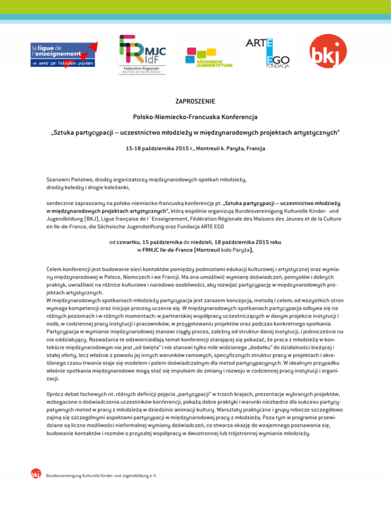 ZAPROSZENIE Polsko-Niemiecko-Francuska Konferencja „Sztuka partycypacji – uczestnictwo młodzieży w międzynarodowych projektach artystycznych“ 15-18 października 2015 r., Montreuil k. Paryża, Francja Szanowni Państwo, drodzy organizatorzy międzynarodowych spotkań młodzieży, drodzy koledzy i drogie koleżanki, serdecznie zapraszamy na polsko-niemiecko-francuską konferencję pt. „Sztuka partycypacji – uczestnictwo młodzieży w międzynarodowych projektach artystycznych“, którą wspólnie organizują Bundesvereinigung Kulturelle Kinder- und Jugendbildung (BKJ), Ligue française de l´Enseignement, Fédération Régionale des Maisons des Jeunes et de la Culture en Ile-de-France, die Sächsische Jugendstiftung oraz Fundacja ARTE EGO od czwartku, 15 października do niedzieli, 18 października 2015 roku w FRMJC Ile-de-France (Montreuil koło Paryża)). Celem konferencji jest budowanie sieci kontaktów pomiędzy podmiotami edukacji kulturowej i artystycznej oraz wymiany międzynarodowej w Polsce, Niemczech i we Francji. Ma ona umożliwić wymianę doświadczeń, pomysłów i dobrych praktyk, uwrażliwić na różnice kulturowe i narodowe osobliwości, aby rozwijać partycypację w międzynarodowych projektach artystycznych. W międzynarodowych spotkaniach młodzieży partycypacja jest zarazem koncepcją, metodą i celem; od wszystkich stron wymaga kompetencji oraz inicjuje procesy uczenia się. W międzynarodowych spotkaniach partycypacja odbywa się na różnych poziomach i w różnych momentach: w partnerskiej współpracy uczestniczących w danym projekcie instytucji i osób, w codziennej pracy instytucji i pracowników, w przygotowaniu projektów oraz podczas konkretnego spotkania. Partycypacja w wymianie międzynarodowej stanowi ciągły proces, zależny od struktur danej instytucji, i jednocześnie na nie oddziałujący. Rozważania te odzwierciedlają temat konferencji starającej się pokazać, że praca z młodzieżą w kontekście międzynarodowym nie jest „od święta” i nie stanowi tylko mile widzianego „dodatku” do działalności bieżącej i stałej oferty, lecz właśnie z powodu jej innych warunków ramowych, specyficznych struktur pracy w projektach i określonego czasu trwania staje się modelem i polem doświadczalnym dla metod partycypacyjnych. W idealnym przypadku właśnie spotkania międzynarodowe mogą stać się impulsem do zmiany i rozwoju w codziennej pracy instytucji i organizacji. Oprócz debat fachowych nt. różnych definicji pojęcia „partycypacji” w trzech krajach, prezentacje wybranych projektów, wzbogacone o doświadczenia uczestników konferencji, pokażą dobre praktyki i warunki niezbędne dla sukcesu partycypatywnych metod w pracy z młodzieżą w dziedzinie animacji kultury. Warsztaty praktyczne i grupy robocze szczegółowo zajmą się szczególnymi aspektami partycypacji w międzynarodowej pracy z młodzieżą. Poza tym w programie przewidziane są liczne możliwości nieformalnej wymiany doświadczeń, co stwarza okazję do wzajemnego poznawania się, budowanie kontaktów i rozmów o przyszłej współpracy w dwustronnej lub trójstronnej wymianie młodzieży. Do Francji zapraszamy specjalistów z zakresu pracy z dziećmi i z młodzieżą, edukacji kulturowej i animacji kultury, multiplikatorów i organizatorów międzynarodowych spotkań młodzieży, którzy są zainteresowani poznaniem partycypacyjnych metod i koncepcji w międzynarodowej pracy z młodzieżą oraz dyskusją nad nimi z kolegami z Francji, Polski i Niemiec. Języki robocze to niemiecki, polski i francuski (ze tłumaczeniem). Uczestnicy otrzymują dotację do kosztów podróży lub ich zwrot na podstawie wytycznych Francusko-Niemieckiej Współpracy Młodzieży. W przypadku późniejszego przyjazdu lub wcześniejszego wyjazdu nie ma możliwości wypłacenia zwrotu lub dotacji do kosztów podróży. Wkład własny uczestników za udział w całym programu konferencyjnym wynosi 80 Euro od osoby. Uczestnicy będą zakwaterowani w pokojach dwuosobowych niedaleko miejsca konferencji. Zakwaterowanie w pokojach jednoosobowych jest możliwe za dopłatą w wysokości 30 Euro od osoby. Prosimy o zaznaczeniu odpowiedniej opcji na formularzu zgłoszeniowym pod adresem http://machform.bkj.de/view.php?id=25684 Nabór uczestników trwa do 31 sierpnia 2015 r. Zgłoszenie jest możliwe tylko za pomocą formularza online. Liczba uczestników z jednej organizacji jest ograniczona do dwóch osób. Przy dużym zainteresowaniu organizatorzy zastrzegają sobie prawo do ograniczenia tej liczby do jednej osoby, o czym zostaną Państwo poinformowani w odpowiednim czasie. Po upływie terminu rekrutacji utrzymają Państwo potwierdzenie rejestracji oraz wszystkie informacje niezbędne do przyjazdu na miejsce konferencji. Prosimy nie kupować wcześniej żadnych biletów! Prosimy o przekazanie informacji o konferencji potencjalnym uczestnikom oraz instytucjom i organizacjom, z którymi Państwo współpracują. Cieszymy się z Państwa zainteresowania i mamay nadzieję, że przybędą Państwo licznie na nasza konferencje, będą prowadzić ożywione dyskusje i owocną wymianę zdań, doświadczeń i opinii! Z wyrazami szacunku Zespól BKJ, Ligue française de l´Enseignement, Fédération Régionale des Maisons des Jeunes et de la Culture en Ile-deFrance, Sächsischen Jugendstiftung oraz Fundacji ARTE EGO Konferencja współfinansowana przez: