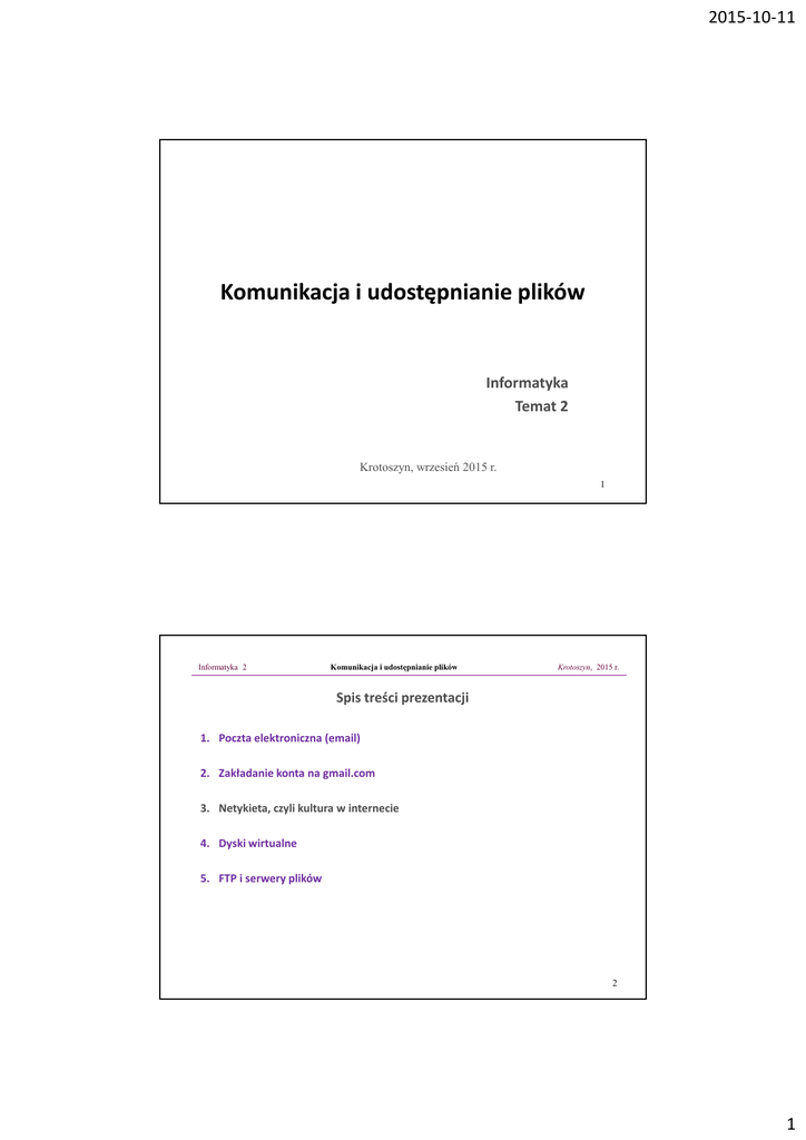 2015-10-11 Komunikacja i udostępnianie plików Informatyka Temat 2 Krotoszyn, wrzesień 2015 r. 1 Informatyka 2 Komunikacja i udostępnianie plików Krotoszyn, 2015 r. Spis treści prezentacji 1. Poczta elektroniczna (email) 2. Zakładanie konta na gmail.com 3. Netykieta, czyli kultura w internecie 4. Dyski wirtualne 5. FTP i serwery plików 2 1 2015-10-11 1. Poczta elektroniczna Informatyka 2 1. Poczta elektroniczna Jakie parametry ma konto pocztowe? - pojemność - maksymalna wielkość załącznika - czy posiada dysk wirtualny (do dużych załączników) - reklamy / spam - czy w przypadku nie logowania się na poczcie przez pewien czas, usuwane są wiadomości? 3 1. Poczta elektroniczna Informatyka 2 Parametry bezpłatnej poczty elektronicznej Pojemność [GB] Maksymalna wielkość załącznika [MB] Poczta.onet.pl Poczta.wp.pl Poczta.interia.pl Poczta.o2.pl Gmail.com Outlook.com Uzupełnij tabelę 4 2 2015-10-11 2. Zakładanie konta Informatyka 2 2. Zakładanie konta na gmail.com Przed założeniem konta należy przygotować: unikalną nazwę oraz hasło 2.1. Unikalna nazwa konta Najlepszym adresem jest konto o nazwie imię[email protected] jednak ze względu na popularność konta gmail.com zapewne będzie już zajęty. Dla zajęć lekcyjnych utworzymy konto o nazwie, która będzie zawierała słowo erudio15 lub erudio2015 oraz nazwisko np.: [email protected] lub [email protected] erudio2015.imię[email protected] lub imię[email protected] UWAGA: przy nazwie konta email nie są rozróżniane duże i małe litery . 5 2. Zakładanie konta Informatyka 2 2.2. Hasło Hasło do konta Google musi mieć co najmniej osiem znaków. Mogą to być: - wielkie i małe litery )wielkość liter w hasłach ma znaczenie, więc „G” różni się od „g”) - Cyfry: 0 1 2 3 4 5 6 7 8 9 - symbole: ! " # $ % & ‘ ( ) * + , - . / : ; < = > ? @ [ \ ] ^ { | } ~ - spacje: nie mogą występować na początku ani na końcu hasła, a jedynie w środku Przy zmianie hasła nie można ponownie użyć już wcześniej wybranego. Zablokowano też pewne hasła, które łatwo odgadnąć, np. „12345678”. BEZPIECZNE HASŁA WG GOOGLE: https://support.google.com/accounts/answer/32040?hl=pl Więcej informacji o bezpiecznych hasłach : http://podyplomowe.edu.o12.pl/?p=162 PRZYKŁAD (zazwyczaj 8 znaków – w tym cyfry i znaki specjalne) Pierwsze dwie litery imienia lub nazwiska Zamienione litery imienia (Robert) lub nazwiska oraz znaki specjalne i rok Ro.2015poczta R.b@rt_2o15 6 3 2015-10-11 Informatyka 2 1. Poczta elektroniczna 2.3. Poczta elektroniczna – kontakty 7 Informatyka 2 1. Poczta elektroniczna 2.4. Poczta elektroniczna – grupa kontaktów 8 4 2015-10-11 Informatyka 2 2.5. Poczta elektroniczna – grupa kontaktów 9 Informatyka 2 3. Netykieta, czyli kultura w internecie https://pl.wikipedia.org/wiki/Netykieta https://edukacjamedialna.edu.pl/lekcje/netykieta-czyli-o-kulturze-w-internecie/ https://pomoc.home.pl/baza-wiedzy/netykieta/ E-mail • Pamiętaj o tym, żeby nadawać każdej wysyłanej wiadomości e-mail tytuł, najlepiej odzwierciedlający zawartość wiadomości. • Nie pisz bez potrzeby dużymi literami, gdyż oznaczają one w Internecie krzyk i odbiorca Twojej wiadomości będzie mógł uznać, że na niego krzyczysz. • Poczty elektronicznej używaj „z głową”. Sprawdzaj skrzynkę e-mail codziennie, tak jak zaglądasz codziennie do skrzynki na listy z pocztą tradycyjną, szczególnie, gdy podajesz swój adres e-mail znajomym lub swoim kontrahentom. Twoi znajomi i kontrahenci pisząc do Ciebie na Twój adres e-mail oczekują, że odczytasz wiadomości od nich w krótkim czasie. Między innymi po to powstała poczta elektroniczna, aby ułatwić i przyspieszyć komunikację. Jeśli z jakichś powodów odbierasz pocztę elektroniczną średnio raz na miesiąc, to przekazując komuś adres swojej skrzynki e-mail poinformuj go o tym fakcie. •Jeśli wstawiasz stopkę w swoich mailach, to postaraj się żeby nie była ona dłuższa niż 3-4 linijki. 10 5 2015-10-11 Informatyka 2 •Nie rozsyłaj łańcuszków szczęścia. •Nie cytuj całej wiadomości, chyba że jest to niezbędne. Gdy cytujesz słowa „przedmówcy” to odpowiadaj pod każdym akapitem z osobna – cytuj fragmenty, do których się odnosisz (poniżej) i tak kolejno, jeśli email ma dłuższą treść lub dotyczącą kilku tematów. Gdy cytujesz większą część wiadomości, nie odnosząc się do jej konkretnych fragmentów – odpowiadaj powyżej cytatu, oddzielając przy tym odpowiedź od oryginalnej wiadomości kilkoma liniami odstępu. Jeśli nie jest to konieczne to nie cytuj nic z poprzedniego listu i tylko ewentualnie w temacie do otrzymanego tematu wiadomości dodaj „RE: ” jeśli nie zrobi tego za Ciebie program obsługi poczty, co się chyba nie zdarza. Dobrze widziane jest przytaczanie tylko tych słów adresata, które są ważne w naszej wypowiedzi, a pozostałe usuwajmy, tak samo jak reklamy (stopki) dodawane automatycznie do wszystkich wiadomości na wielu serwerach z darmowymi kontami. •Gdy rozsyłasz pocztę do grupy osób, np. spoza firmy czy do znajmoych, korzystaj z pola „BCC” czyli „UDW” („Ukryty do Wiadomości”), gdyż nie każdy musi sobie życzyć, by jego adres e-mail został ujawniony pozostałym Twoim adresatom. •Sprawdzaj swój komputer w celu usuwania wirusów, byś nie przesyłał wirusów innym internautom. •Nie rozsyłaj spamu (niechcianej poczty: reklam zazwyczaj) – to grozi wyklęciem na wieki, jedno z najbardziej znienawidzonych przez wszystkich niepożądane działanie w Internecie. 11 4. Dyski wirtualne Informatyka 2 4. Dyski wirtualne Dyski wirtualne powstały w celu możliwości przysyłania/udostępniania dużych plików (kota email miały wcześniej a niektóre mają do dzisiaj ograniczenie do ok. 25 MB) oraz gromadzenia plików w tzw. chmurze Najpopularniejsze usługi to Dropbox, OneDrive, Google Drive. Pojemność [GB] Maksymalna wielkość pliku [MB] 