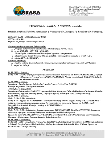 Biuro Usług Turystycznych BARBARA 00 - 216 Warszawa ul. Konwiktorska 9 tel. / fax. (22) 635 55 54 e–mail: [email protected] www.barbara-travel.eu WYCIECZKA - ANGLIA I SZKOCJA – autokar Istnieje możliwość dolotu samolotem z Warszawy do Londynu i z Londynu do Warszawy. TERMIN: 11.08 – 22.08.2015r. (12 DNI). CENA: 3.950 ZŁ Dopłata do pokoju 1 osobowego: 950 zł. Cena obejmuje następujące świadczenia: 1. przejazd komfortowym autokarem z klimatyzacją, barem, video. 2. prom CALAIS – DOVER – CALAIS. 3. 11 noclegów ze śniadaniami i kolacjami zgodnie z programem. 4. ubezpieczenie koszty leczenia (10 tys. EURO) i nieszczęśliwe wypadki w TUiR AXA. 5. pilota BUT „BARBARA”. Cena nie obejmuje: 1. biletów wstępu do zwiedzanych obiektów i przewodników miejscowych około 100 funtów. 2. napoi do kolacji. PROGRAM 11.08.2015 r. (wtorek). Godz. 7.00 - zbiórka przed głównym wejściem na Stadion Polonii od ul. BONIFRATERSKIEJ, wyjazd z Warszawy. Przejazd przez POZNAŃ, BERLIN. Nocleg w okolicach KOLONII. Kolacja we własnym zakresie. 12.08.2015 r. (środa). Śniadanie . Przejazd przez Belgię, do Francji. Prom z CALAIS do DOVER. Kolacja na promie. Nocleg w Londynie. 13.08.2015 r. (czwartek). Śniadanie. Zwiedzanie LONDYNU z przewodnikiem lokalnym: Pałac Bukingham, Parlament, Katedra Westminster, Big Ben, Dowing Street, Trafalgar Squar, Picadilly Circus. Kolacja i nocleg. 14.08.2015. r. (piątek). Godz. 7.30 – 8.30 - śniadanie. Godz. 8.45 - wyjazd do WINDSORU - zwiedzanie siedziby królów Anglii. Postój w STONEHENGE miejscu ceremonialnym czczącym słońce i wyznaczającym pory roku. Spacer po BATH – perle brytyjskich uzdrowisk. Kolacja i nocleg w BIRMINGHAM. 15.08.2015 r. (sobota). Godz. 7.30 – 8.30 – śniadanie . Spacer po centrum BIRMINGHAM. Postój w CHESTER. Spacer po ulicach ze słynnymi arkadami i sklepami unikalnymi w Wielkiej Brytanii. Spacer po ulicy BEATELSÓW w LIVERPOOL. Zwiedzanie GLASGOW: Dzielnica Uniwersytecka, Centrum z Ratruszem i Domem Kupców. kolacja i nocleg. 16.08.2015 r. (niedziela). Godz.7.00 – 8.00 – śniadanie. Przejazd do STIRLING. Zwiedzanie Królewskiego ZAMKUnajwiększego w Szkocji. Przejazd przez Wielką Dolinę, Dolinę Łez, Kanał Kaledoński, Fort William. Spacer po INVERNESS. kolacja i nocleg. .................................................. Konto bankowe: 2312 40288 71111 0000 3388 2323, Bank PKO S. A.; NIP: 526 – 005 – 53 – 31; Koncesja nr 0168; Polisa SIGNAL IDUNA M 37627 17.08.2015 r. (poniedziałek. Godz. 7.00 – 8.00 – śniadanie. Przejazd do ZAMKU BLAIR. Zwiedzanie zamku białej warowni z 1269r. siedziby książąt ATHOLL i destylatorni whisky Blair Atholl. Zwiedzanie ZAMKU GLAMIS zbudowanego w XI w., domu dzieciństwa Królowej Anglii. Przejazd przez DUNDEE i PERTH. Kolacja i nocleg. 18.08.2015 r. (wtorek). Godz. 7.00 – 8.00 – śniadanie. Godz. 8.30 - wyjazd do EDYNBURGA stolicy SZKOCJI. Zwiedzanie miasta – Zamek, Pałac Holyroodhouse z parkiem w którym podziwiać można dzikie krajobrazy Szkocji, Szkockie Muzeum Królewskie. Kolacja i nocleg w Newcastle. 19.08.2015 r. (środa). Godz.7.30 – 8.30 – śniadanie. Godz. 8.45 - zwiedzanie DURHAM – Katedra i Kaplica Dziewięciu Ołtarzy, widoki na rzekę WEAR z mostu PREBEND. Przejazd do YORKU - zwiedzanie KATEDRY YORK MINSTER. Spacer po centrum miasta. Kolacja i nocleg w Daventry. 20.08.2015 r. (czwartek). Po śniadaniu przejazd do CANTERBURY – jednego z piękniejszych średniowiecznych miast Anglii. Zwiedzanie KATEDRY z XI w, spacer po centrum miasta i dzielnicy WEAWERS z malowniczymi domami z epoki TUDORÓW. Przejazd do DOVER. Godz. 15.30 - prom do CALAIS. Godz. 17.00 – przybicie do CALAIS. Kolacja i nocleg w okolicach LIEGE. 21.08.2015 r. (piątek). Godz. 7.00 – 7.45 śniadanie bufet. Godz. 8.00 - wyjazd do CZECH. Kolacja i nocleg. 22.08.2015 r. (sobota). Godz. 7.00 – 8.00 śniadanie bufet. Godz. 8.15 – wyjazd do POLSKI. Obiad w Polsce na koszt uczestników wycieczki. Około godz. 20.00 przyjazd do Warszawy. - Przy zapisie wpłata zaliczki w wysokości 30% ceny wycieczki. Całość wpłaty do dnia 10.07.2015 r. - Miejsca w autobusie numerowane i wybierane przy podpisaniu umowy i wpłacie zaliczki. -Organizator zastrzega sobie prawo zmiany kolejności zwiedzania. Cena wycieczki może ulec zmianie w wyniku zmiany kursu walut (EURO , FUNTA). -W autobusie obowiązuje całkowity zakaz palenia, postoje na papierosa i toaletę mniej więcej co 3 godziny. -Wycieczka rozpoczyna się i kończy na ul. BONIFRATERSKIEJ. Wsiadanie i wysiadanie do autobusu w innym miejscu na terenie Warszawy jest niemożliwe. Z A P R A S Z A M Y!!!!! -