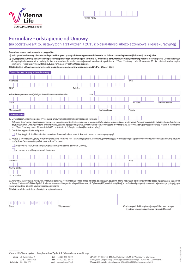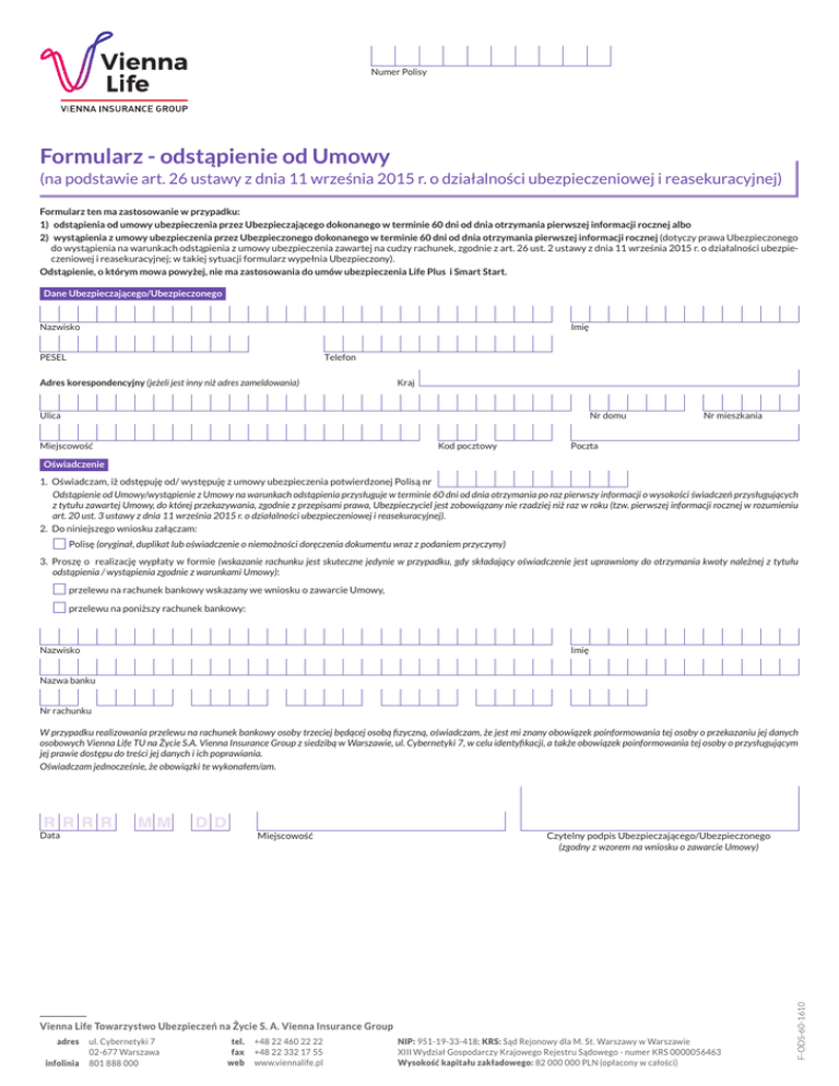 Numer Polisy Formularz - odstąpienie od Umowy (na podstawie art. 26 ustawy z dnia 11 września 2015 r. o działalności ubezpieczeniowej i reasekuracyjnej) Formularz ten ma zastosowanie w przypadku: 1) odstąpienia od umowy ubezpieczenia przez Ubezpieczającego dokonanego w terminie 60 dni od dnia otrzymania pierwszej informacji rocznej albo 2) wystąpienia z umowy ubezpieczenia przez Ubezpieczonego dokonanego w terminie 60 dni od dnia otrzymania pierwszej informacji rocznej (dotyczy prawa Ubezpieczonego do wystąpienia na warunkach odstąpienia z umowy ubezpieczenia zawartej na cudzy rachunek, zgodnie z art. 26 ust. 2 ustawy z dnia 11 września 2015 r. o działalności ubezpieczeniowej i reasekuracyjnej; w takiej sytuacji formularz wypełnia Ubezpieczony). Odstąpienie, o którym mowa powyżej, nie ma zastosowania do umów ubezpieczenia Life Plus i Smart Start. Dane Ubezpieczającego/Ubezpieczonego Nazwisko Imię Telefon PESEL Adres korespondencyjny (jeżeli jest inny niż adres zameldowania) Kraj Ulica Nr domu Miejscowość Kod pocztowy Nr mieszkania Poczta Oświadczenie 1. Oświadczam, iż odstępuję od/ występuję z umowy ubezpieczenia potwierdzonej Polisą nr Odstąpienie od Umowy/wystąpienie z Umowy na warunkach odstąpienia przysługuje w terminie 60 dni od dnia otrzymania po raz pierwszy informacji o wysokości świadczeń przysługujących z tytułu zawartej Umowy, do której przekazywania, zgodnie z przepisami prawa, Ubezpieczyciel jest zobowiązany nie rzadziej niż raz w roku (tzw. pierwszej informacji rocznej w rozumieniu art. 20 ust. 3 ustawy z dnia 11 września 2015 r. o działalności ubezpieczeniowej i reasekuracyjnej). 2. Do niniejszego wniosku załączam: £ Polisę (oryginał, duplikat lub oświadczenie o niemożności doręczenia dokumentu wraz z podaniem przyczyny) 3. Proszę o realizację wypłaty w formie (wskazanie rachunku jest skuteczne jedynie w przypadku, gdy składający oświadczenie jest uprawniony do otrzymania kwoty należnej z tytułu odstąpienia / wystąpienia zgodnie z warunkami Umowy): £ przelewu na rachunek bankowy wskazany we wniosku o zawarcie Umowy, £ przelewu na poniższy rachunek bankowy: Nazwisko Imię Nazwa banku Nr rachunku W przypadku realizowania przelewu na rachunek bankowy osoby trzeciej będącej osobą fizyczną, oświadczam, że jest mi znany obowiązek poinformowania tej osoby o przekazaniu jej danych osobowych Vienna Life TU na Życie S.A. Vienna Insurance Group z siedzibą w Warszawie, ul. Cybernetyki 7, w celu identyfikacji, a także obowiązek poinformowania tej osoby o przysługującym jej prawie dostępu do treści jej danych i ich poprawiania. Oświadczam jednocześnie, że obowiązki te wykonałem/am. Miejscowość Czytelny podpis Ubezpieczającego/Ubezpieczonego (zgodny z wzorem na wniosku o zawarcie Umowy) Vienna Life Towarzystwo Ubezpieczeń na Życie S. A. Vienna Insurance Group adres infolinia ul. Cybernetyki 7 02-677 Warszawa 801 888 000 tel. fax web +48 22 460 22 22 +48 22 332 17 55 www.viennalife.pl NIP: 951-19-33-418; KRS: Sąd Rejonowy dla M. St. Warszawy w Warszawie XIII Wydział Gospodarczy Krajowego Rejestru Sądowego - numer KRS 0000056463 Wysokość kapitału zakładowego: 82 000 000 PLN (opłacony w całości) F-ODS-60-1610 Data