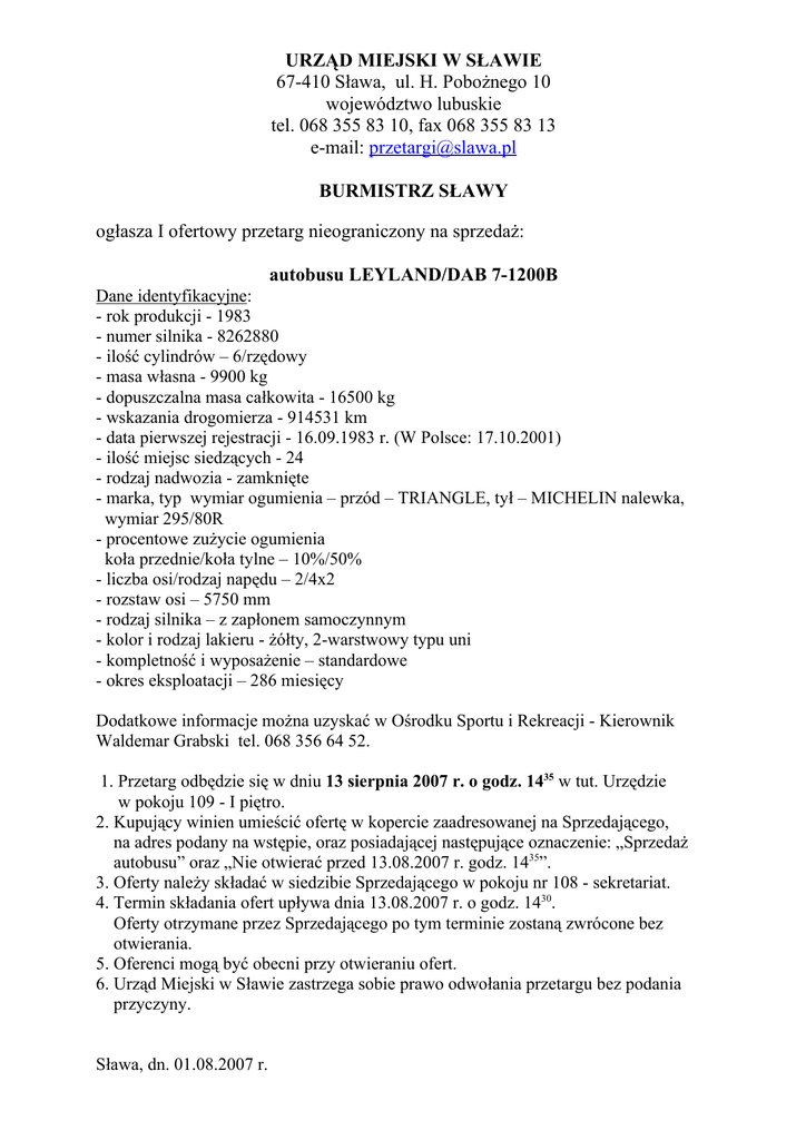 URZĄD MIEJSKI W SŁAWIE 67-410 Sława, ul. H. Pobożnego 10 województwo lubuskie tel. 068 355 83 10, fax 068 355 83 13 e-mail: [email protected] BURMISTRZ SŁAWY ogłasza I ofertowy przetarg nieograniczony na sprzedaż: autobusu LEYLAND/DAB 7-1200B Dane identyfikacyjne: - rok produkcji - 1983 - numer silnika - 8262880 - ilość cylindrów – 6/rzędowy - masa własna - 9900 kg - dopuszczalna masa całkowita - 16500 kg - wskazania drogomierza - 914531 km - data pierwszej rejestracji - 16.09.1983 r. (W Polsce: 17.10.2001) - ilość miejsc siedzących - 24 - rodzaj nadwozia - zamknięte - marka, typ wymiar ogumienia – przód – TRIANGLE, tył – MICHELIN nalewka, wymiar 295/80R - procentowe zużycie ogumienia koła przednie/koła tylne – 10%/50% - liczba osi/rodzaj napędu – 2/4x2 - rozstaw osi – 5750 mm - rodzaj silnika – z zapłonem samoczynnym - kolor i rodzaj lakieru - żółty, 2-warstwowy typu uni - kompletność i wyposażenie – standardowe - okres eksploatacji – 286 miesięcy Dodatkowe informacje można uzyskać w Ośrodku Sportu i Rekreacji - Kierownik Waldemar Grabski tel. 068 356 64 52. 1. Przetarg odbędzie się w dniu 13 sierpnia 2007 r. o godz. 1435 w tut. Urzędzie w pokoju 109 - I piętro. 2. Kupujący winien umieścić ofertę w kopercie zaadresowanej na Sprzedającego, na adres podany na wstępie, oraz posiadającej następujące oznaczenie: „Sprzedaż autobusu” oraz „Nie otwierać przed 13.08.2007 r. godz. 1435”. 3. Oferty należy składać w siedzibie Sprzedającego w pokoju nr 108 - sekretariat. 4. Termin składania ofert upływa dnia 13.08.2007 r. o godz. 1430. Oferty otrzymane przez Sprzedającego po tym terminie zostaną zwrócone bez otwierania. 5. Oferenci mogą być obecni przy otwieraniu ofert. 6. Urząd Miejski w Sławie zastrzega sobie prawo odwołania przetargu bez podania przyczyny. Sława, dn. 01.08.2007 r.