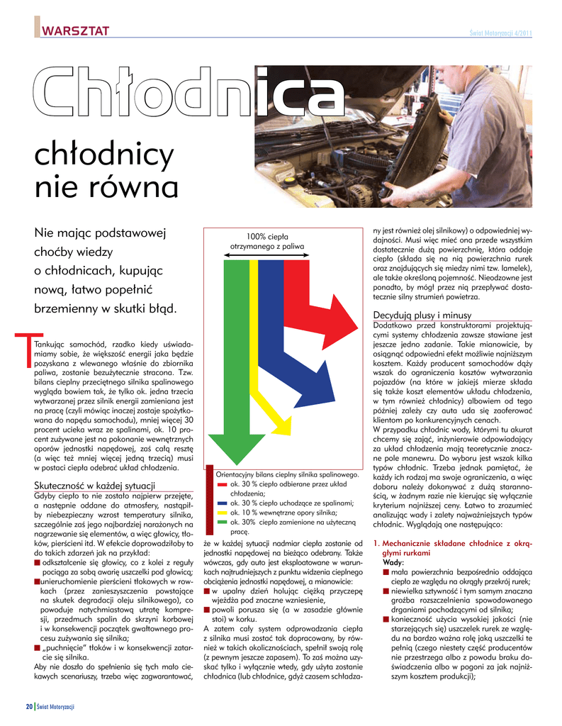 WARSZTAT Świat Motoryzacji 4/2011 Chłodnica chłodnicy nie równa Nie mając podstawowej choćby wiedzy o chłodnicach, kupując nową, łatwo popełnić brzemienny w skutki błąd. 100% ciepła otrzymanego z paliwa Decydują plusy i minusy T Tankując samochód, rzadko kiedy uświadamiamy sobie, że większość energii jaka będzie pozyskana z wlewanego właśnie do zbiornika paliwa, zostanie bezużytecznie stracona. Tzw. bilans cieplny przeciętnego silnika spalinowego wygląda bowiem tak, że tylko ok. jedna trzecia wytwarzanej przez silnik energii zamieniana jest na pracę (czyli mówiąc inaczej zostaje spożytkowana do napędu samochodu), mniej więcej 30 procent ucieka wraz ze spalinami, ok. 10 procent zużywane jest na pokonanie wewnętrznych oporów jednostki napędowej, zaś całą resztę (a więc też mniej więcej jedną trzecią) musi w postaci ciepła odebrać układ chłodzenia. Skuteczność w każdej sytuacji Gdyby ciepło to nie zostało najpierw przejęte, a następnie oddane do atmosfery, nastąpiłby niebezpieczny wzrost temperatury silnika, szczególnie zaś jego najbardziej narażonych na nagrzewanie się elementów, a więc głowicy, tłoków, pierścieni itd. W efekcie doprowadziłoby to do takich zdarzeń jak na przykład: to dkształcenie się głowicy, co z kolei z reguły pociąga za sobą awarię uszczelki pod głowicą; tunieruchomienie pierścieni tłokowych w rowkach (przez zanieszyszczenia powstające na skutek degradacji oleju silnikowego), co powoduje natychmiastową utratę kompresji, przedmuch spalin do skrzyni korbowej i w konsekwencji początek gwałtownego procesu zużywania się silnika; t „puchnięcie” tłoków i w konsekwencji zatarcie się silnika. Aby nie doszło do spełnienia się tych mało ciekawych scenariuszy, trzeba więc zagwarantować, 20 Świat Motoryzacji ny jest również olej silnikowy) o odpowiedniej wydajności. Musi więc mieć ona przede wszystkim dostatecznie dużą powierzchnię, która oddaje ciepło (składa się na nią powierzchnia rurek oraz znajdujących się miedzy nimi tzw. lamelek), ale także określoną pojemność. Nieodzowne jest ponadto, by mógł przez nią przepływać dostatecznie silny strumień powietrza. Orientacyjny bilans cieplny silnika spalinowego. ok. 30 % ciepło odbierane przez układ chłodzenia; ok. 30 % ciepło uchodzące ze spalinami; ok. 10 % wewnętrzne opory silnika; ok. 30% ciepło zamienione na użyteczną pracę. że w każdej sytuacji nadmiar ciepła zostanie od jednostki napędowej na bieżąco odebrany. Także wówczas, gdy auto jest eksploatowane w warunkach najtrudniejszych z punktu widzenia cieplnego obciążenia jednostki napędowej, a mianowicie: t w upalny dzień holując ciężką przyczepę wjeżdża pod znaczne wzniesienie, t powoli porusza się (a w zasadzie głównie stoi) w korku. A zatem cały system odprowadzania ciepła z silnika musi zostać tak dopracowany, by również w takich okolicznościach, spełnił swoją rolę (z pewnym jeszcze zapasem). To zaś można uzyskać tylko i wyłącznie wtedy, gdy użyta zostanie chłodnica (lub chłodnice, gdyż czasem schładza- Dodatkowo przed konstruktorami projektującymi systemy chłodzenia zawsze stawiane jest jeszcze jedno zadanie. Takie mianowicie, by osiągnąć odpowiedni efekt możliwie najniższym kosztem. Każdy producent samochodów dąży wszak do ograniczenia kosztów wytwarzania pojazdów (na które w jakiejś mierze składa się także koszt elementów układu chłodzenia, w tym również chłodnicy) albowiem od tego później zależy czy auta uda się zaoferować klientom po konkurencyjnych cenach. W przypadku chłodnic wody, którymi tu akurat chcemy się zająć, inżynierowie odpowiadający za układ chłodzenia mają teoretycznie znaczne pole manewru. Do wyboru jest wszak kilka typów chłodnic. Trzeba jednak pamiętać, że każdy ich rodzaj ma swoje ograniczenia, a więc doboru należy dokonywać z dużą starannością, w żadnym razie nie kierując się wyłącznie kryterium najniższej ceny. Łatwo to zrozumieć analizując wady i zalety najważniejszych typów chłodnic. Wyglądają one następująco: 1. Mechanicznie składane chłodnice z okrągłymi rurkami Wady: tm ała powierzchnia bezpośrednio oddająca ciepło ze względu na okrągły przekrój rurek; t niewielka sztywność i tym samym znaczna groźba rozszczelnienia spowodowanego drganiami pochodzącymi od silnika; t konieczność użycia wysokiej jakości (nie starzejących się) uszczelek rurek ze względu na bardzo ważna rolę jaką uszczelki te pełnią (czego niestety część producentów nie przestrzega albo z powodu braku doświadczenia albo w pogoni za jak najniższym kosztem produkcji); WARSZTAT Świat Motoryzacji 4/2011 Zalety: tn iski koszt wytwarzania (okrągłe rurki są tańsze od owalnych, można zastosować prostsze, a więc i tańsze urządzenia produkcyjne, produkcja może być prowadzona w niedużych pomieszczeniach). niż uszczelki stosowane podczas montażu chlodnic składanych mechanicznie. Godzi się ponadto wspomnieć, iż powszechnie niegdyś używanych lutowanych chłodnic wykonywanych z miedzi firmy samochodowe od ładnych już paru lat praktycznie nie stosują ze względu na przestarzałą, w dużej mierze opartą na pracy ręcznej, technologię ich produkcji oraz zawrotną cenę miedzi. Na wzór i podobieństwo 2. Mechanicznie składane chłodnice z owalnymi rurkami Wady: t również niewielka sztywność; t także wysokie wymagania co do jakości uszczelek; t zastrzeżenia patentowe sprawiające, że chłodnice tego typu w zgodzie z prawem wytwarzać może tylko kilku producentów; Zalety: t znaczna powierzchnia bezpośrednio oddająca ciepło ze względu na owalny (spłaszczony) przekrój rurek; t niższa cena niż chłodnic wykonywanych technologią spiekania; 3. Chłodnice produkowane przy użyciu technologii spiekania Wady: t stosunkowo wysokie koszty wytwarzania (produkcja wymaga drogich, specjalist