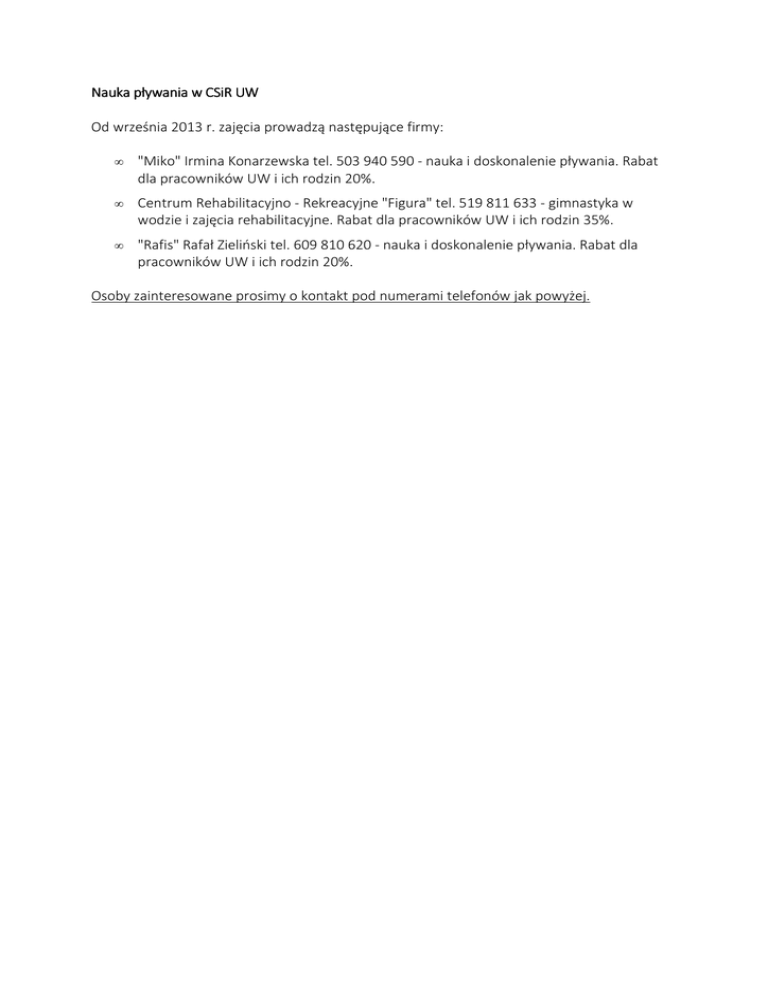 Nauka pływania w CSiR UW Od września 2013 r. zajęcia prowadzą następujące firmy: • "Miko" Irmina Konarzewska tel. 503 940 590 - nauka i doskonalenie pływania. Rabat dla pracowników UW i ich rodzin 20%. • Centrum Rehabilitacyjno - Rekreacyjne "Figura" tel. 519 811 633 - gimnastyka w wodzie i zajęcia rehabilitacyjne. Rabat dla pracowników UW i ich rodzin 35%. • "Rafis" Rafał Zieliński tel. 609 810 620 - nauka i doskonalenie pływania. Rabat dla pracowników UW i ich rodzin 20%. Osoby zainteresowane prosimy o kontakt pod numerami telefonów jak powyżej.