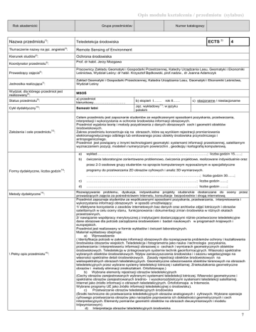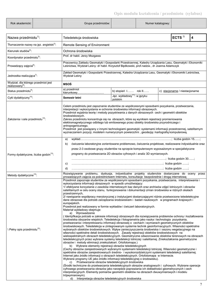 Opis modułu kształcenia / przedmiotu (sylabus) Rok akademicki: Grupa przedmiotów: Nazwa przedmiotu1): Teledetekcja środowiska Tłumaczenie nazwy na jęz. angielski3): Remote Sensing of Environment 4) Numer katalogowy: ECTS 2) 4 Kierunek studiów : Ochrona środowiska Koordynator przedmiotu5): Prof. dr habil. Jerzy Mozgawa Prowadzący zajęcia6): Pracownicy Zakładu Geomatyki i Gospodarki Przestrzennej, Katedry Urządzania Lasu, Geomatyki i Ekonomiki Leśnictwa, Wydział Leśny: dr habil. Krzysztof Będkowski, prof.nadzw., dr Joanna Adamczyk Jednostka realizująca7): Zakład Geomatyki i Gospodarki Przestrzennej, Katedra Urządzania Lasu, Geomatyki i Ekonomiki Leśnictwa, Wydział Leśny Wydział, dla którego przedmiot jest realizowany8): MSOŚ Status przedmiotu9): a) przedmiot kierunkowy………………………. b) stopień I……. rok II…… c) stacjonarne / niestacjonarne 11) Jęz. wykładowy : w języku polskim Cykl dydaktyczny10): Semestr letni Założenia i cele przedmiotu12): Celem przedmiotu jest zapoznanie studentów ze współczesnymi sposobami pozyskania, przetwarzania, interpretacji i wykorzystania w ochronie środowiska informacji obrazowych. Przedmiot wyjaśnia teorię i metody pozyskiwania z danych obrazowych cech i geometrii obiektów środowiskowych. Zakres przedmiotu koncentruje się na obrazach, które są wynikiem rejestracji promieniowania elektromagnetycznego odbitego lub emitowanego przez obiekty środowiska przyrodniczego i antropogenicznego. Przedmiot jest powiązany z innymi technologiami geomatyki: systemami informacji przestrzennej, satelitarnym wyznaczaniem pozycji, modelem numerycznym powierzchni , geodezją i kartografią komputerową. a) wykład……………………………………………………………………………………; liczba godzin 15.......; b) ćwiczenia laboratoryjne zorientowane problemowo, ćwiczenia projektowe, realizowane indywidualnie oraz przez 2-3 osobowe grupy studentów na sprzęcie komputerowym wyposażonym w specjalistyczne programy do przetwarzania 2D obrazów cyfrowych i analiz 3D wymiarowych. 13) Formy dydaktyczne, liczba godzin : ………………………………………………………………………………………; liczba godzin 30.......; Metody dydaktyczne14): \ Pełny opis przedmiotu15): c) ……………………………………………………………………………………; liczba godzin .......; d) ……………………………………………………………………………………; liczba godzin .......; Rozwiązywanie problemu, dyskusja, indywidualne projekty studenckie dostarczane do oceny przez prowadzących zajęcia za pośrednictwem Internetu, konsultacje bezpośrednie i drogą internetową Przedmiot zapoznaje studentów ze współczesnymi sposobami pozyskania, przetwarzania, interpretowania i wykorzystania informacji obrazowych w sposób umożliwiający: 1/ efektywne korzystanie z zasobów internetowych baz danych oraz archiwów zdjęć lotniczych i obrazów satelitarnych w celu oceny stanu, funkcjonowania i dokumentacji zmian środowiska w różnych skalach przestrzennych, 2/ nawiązanie współpracy merytorycznej z instytucjami dostarczającymi różnie przetworzone teledetekcyjne dane obrazowe dla potrzeb zarządzania środowiskiem i badań naukowych w programach krajowych i europejskich. Przedmiot jest realizowany w formie wykładów i ćwiczeń laboratoryjnych. Materiał wykładowy obejmuje: a) Wprowadzenie ( Identyfikacja potrzeb w zakresie informacji obrazowych dla rozwiązywania problemów ochrony i kształtowania środowiska obszarów wiejskich. Teledetekcja i fotogrametria jako nauka i technologia pozyskania, przetwarzania i interpretowaniu informacji obrazowej o cechach i wymiarach geometrycznych obiektów środowiskowych. Teledetekcja w zintegrowanym systemie technik geoinformacyjnych. Własności spektralne wybranych obiektów środowiskowych. Wpływ zanieczyszczenia środowiska i i sezonu wegetacyjnego na własności spektralne detali środowiskowych. Zasady rejestracji obiektów środowiskowych na wielospektralnych obrazach teledetekcyjnych. Geometryczne odwzorowanie obiektów terenowych na obrazach teledetekcyjnych przez wybrane systemy teledetekcji lotniczej i satelitarnej. Zniekształcenia geometryczne obrazów i metody eliminacji zniekształceń. Ortofotomapa.) b) Wybrane elementy rejestracji obrazów teledetekcyjnych (Cechy obrazów zarejestrowanych wybranymi systemami teledetekcji lotniczej. Własności geometryczne i spektralne obrazów zarejestrowanych średnio- i wysokorozdzielczymi systemami teledetekcji satelitarnej. Internet jako źródło informacji o obrazach teledetekcyjnych. Ortofotomapa w Internecie. Wybrane programy UE jako źródło informacji teledetekcyjnej o środowisku). c) Przetwarzanie obrazów teledetekcyjnych środowiska (Środki techniczne do przetwarzania teledetekcyjnych obrazów analogowych i cyfrowych. Wybrane operacje cyfrowego przetwarzania obrazów jako narzędzie poprawiania ich dokładności geometrycznych i cech interpretacyjnych. Elementy pomiarów geometrii obiektów na obrazach dwuwymiarowych i modelu trójwymiarowym). d) Interpretacja obrazów teledetekcyjnych środowiska 7 (Kierunki praktycznego wykorzystania rezultatów interpretacji do rozpoznania stanu i zmian środowiska obszarów wiejskich. Specyfika monitorowania środowiska na serii czasowej obrazów. Wykorzystanie rezultatów interpretacji obrazów lotniczych i satelitarnych do zasilania baz danych systemów informacji przestrzennej. Aspekty techniczne i ekonomiczne stosowania w ochronie środowiska wybranych współczesnych technik teledetekcji poziomu lotniczego i satelitarnego. Podejście ekologiczno – krajobrazowe do interpretacji na obrazach lotniczych i satelitarnych elementów strukturalnych krajobrazów obszarów wiejskich. Kwantyfikacja stanu krajobrazów ekologicznych poprzez wybrane wskaźniki struktury przestrzennej krajobrazów.