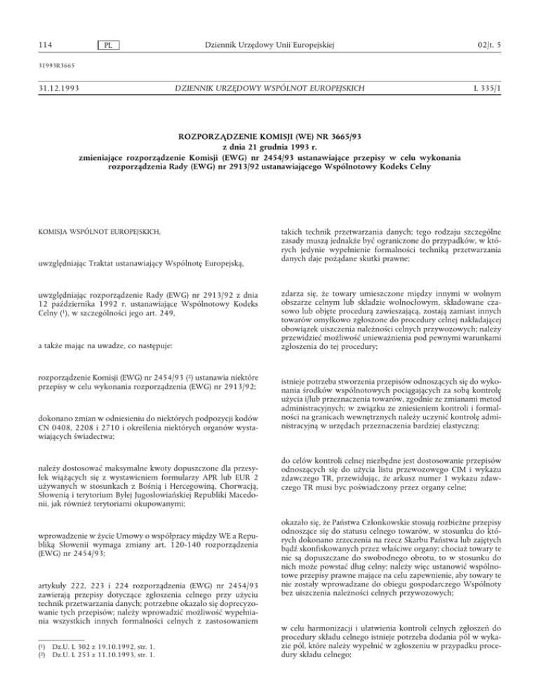 114 PL Dziennik Urzędowy Unii Europejskiej 02/t. 5 DZIENNIK URZĘDOWY WSPÓLNOT EUROPEJSKICH L 335/1 31993R3665 31.12.1993 ROZPORZĄDZENIE KOMISJI (WE) NR 3665/93 z dnia 21 grudnia 1993 r. zmieniające rozporządzenie Komisji (EWG) nr 2454/93 ustanawiające przepisy w celu wykonania rozporządzenia Rady (EWG) nr 2913/92 ustanawiającego Wspólnotowy Kodeks Celny KOMISJA WSPÓLNOT EUROPEJSKICH, uwzględniając Traktat ustanawiający Wspólnotę Europejską, uwzględniając rozporządzenie Rady (EWG) nr 2913/92 z dnia 12 października 1992 r. ustanawiające Wspólnotowy Kodeks Celny (1), w szczególności jego art. 249, a także mając na uwadze, co następuje: rozporządzenie Komisji (EWG) nr 2454/93 (2) ustanawia niektóre przepisy w celu wykonania rozporządzenia (EWG) nr 2913/92; dokonano zmian w odniesieniu do niektórych podpozycji kodów CN 0408, 2208 i 2710 i określenia niektórych organów wystawiających świadectwa; należy dostosować maksymalne kwoty dopuszczone dla przesyłek wiążących się z wystawieniem formularzy APR lub EUR 2 używanych w stosunkach z Bośnią i Hercegowiną, Chorwacją, Słowenią i terytorium Byłej Jugosłowiańskiej Republiki Macedonii, jak również terytoriami okupowanymi; wprowadzenie w życie Umowy o współpracy między WE a Republiką Słowenii wymaga zmiany art. 120-140 rozporządzenia (EWG) nr 2454/93; artykuły 222, 223 i 224 rozporządzenia (EWG) nr 2454/93 zawierają przepisy dotyczące zgłoszenia celnego przy użyciu technik przetwarzania danych; potrzebne okazało się doprecyzowanie tych przepisów; należy wprowadzić możliwość wypełniania wszystkich innych formalności celnych z zastosowaniem (1) Dz.U. L 302 z 19.10.1992, str. 1. (2) Dz.U. L 253 z 11.10.1993, str. 1. takich technik przetwarzania danych; tego rodzaju szczególne zasady muszą jednakże być ograniczone do przypadków, w których jedynie wypełnienie formalności techniką przetwarzania danych daje pożądane skutki prawne; zdarza się, że towary umieszczone między innymi w wolnym obszarze celnym lub składzie wolnocłowym, składowane czasowo lub objęte procedurą zawieszającą, zostają zamiast innych towarów omyłkowo zgłoszone do procedury celnej nakładającej obowiązek uiszczenia należności celnych przywozowych; należy przewidzieć możliwość unieważnienia pod pewnymi warunkami zgłoszenia do tej procedury; istnieje potrzeba stworzenia przepisów odnoszących się do wykonania środków wspólnotowych pociągających za sobą kontrolę użycia i/lub przeznaczenia towarów, zgodnie ze zmianami metod administracyjnych; w związku ze zniesieniem kontroli i formalności na granicach wewnętrznych należy uczynić kontrolę administracyjną w urzędach przeznaczenia bardziej elastyczną; do celów kontroli celnej niezbędne jest dostosowanie przepisów odnoszących się do użycia listu przewozowego CIM i wykazu zdawczego TR, przewidując, że arkusz numer 1 wykazu zdawczego TR musi byc poświadczony przez organy celne; okazało się, że Państwa Członkowskie stosują rozbieżne przepisy odnoszące się do statusu celnego towarów, w stosunku do których dokonano zrzeczenia na rzecz Skarbu Państwa lub zajętych bądź skonfiskowanych przez właściwe organy; chociaż towary te nie są dopuszczane do swobodnego obrotu, to w stosunku do nich może powstać dług celny; należy więc ustanowić wspólnotowe przepisy prawne mające na celu zapewnienie, aby towary te nie zostały wprowadzane do obiegu gospodarczego Wspólnoty bez uiszczenia należności celnych przywozowych; w celu harmonizacji i ułatwienia kontroli celnych zgłoszeń do procedury składu celnego istnieje potrzeba dodania pól w wykazie pól, które należy wypełnić w zgłoszeniu w przypadku procedury składu celnego; 02/t. 5 Dziennik Urzędowy Unii Europejskiej PL należy dostosować przepisy dotyczące zabezpieczeń w celu uwzględnienia zwiększonego ryzyka oszustw w przypadku niektórych kategorii towarów, aby stały się one w większym stopniu wiążące; b) 115 wprowadzenie do celnych systemów przetwarzania danych informacji niezbędnych do wypełnienia odpowiednich formalności; — określenie »EDI (Electronic Data Interchange)« oznacza przekaz danych drogą elektroniczną w formie zgodnej z ustalonymi standardami przesyłania wiadomości między dwoma systemami komputerowymi, należy przed wejściem w życie rozporządzenia (EWG) nr 2454/93 włączyć do tego rozporządzenia przepisy zmieniające przepisy wspólnotowe obowiązujące przed terminem stosowania tego rozporządzenia; — określenie »znormalizowana wiadomość« oznacza wcześniej zdefiniowaną formę uznaną do celów elektronicznego przesyłania danych. należy skorygować błędy i pominięcia, które nastąpiły w trakcie transpozycji obowiązujących przepisów do przepisów wykonawczych Kodeksu; 2. Warunki ustalone dla wypełniania formalności przy użyciu technik przetwarzania danych muszą uwzględniać między innymi środki kontroli źródła, jak również zabezpieczenie danych przed niedozwolonym użyciem, utratą, zmianą lub zniszczeniem. środki przewidziane w niniejszym rozporządzeniu są zgodne z opinią Komitetu Kodeksu Celnego, Artykuł 4b Jeżeli formalności wypełniane są przy użyciu technik przetwarzania danych, organy celne określają zasady, na jakich podpis odręczny może zostać zastąpiony inną techniką mogącą opierać się na zastosowaniu kodów.”; PRZYJMUJE NINIEJSZE ROZPORZĄDZENIE: Artykuł 1 3) w tabeli w art. 16 numer porządkowy 1 zastępuje się załącznikiem 1; W rozporządzeniu (EWG) nr 2454/93 wprowadza się następujące zmiany: 4) w art. 26 wprowadza się następujące zmiany: — tabelę zmienia się zgodnie z załącznikiem 2, 1) dodaje się art. 1a w brzmieniu: — w ust. 3 skreśla się zdanie drugie, „Artykuł 1a — dodaje się ust. 3a w brzmieniu: „3a. Świadectwo takie dla tytoniu wymienionego pod numerem porządkowym 6 poniższej tabeli