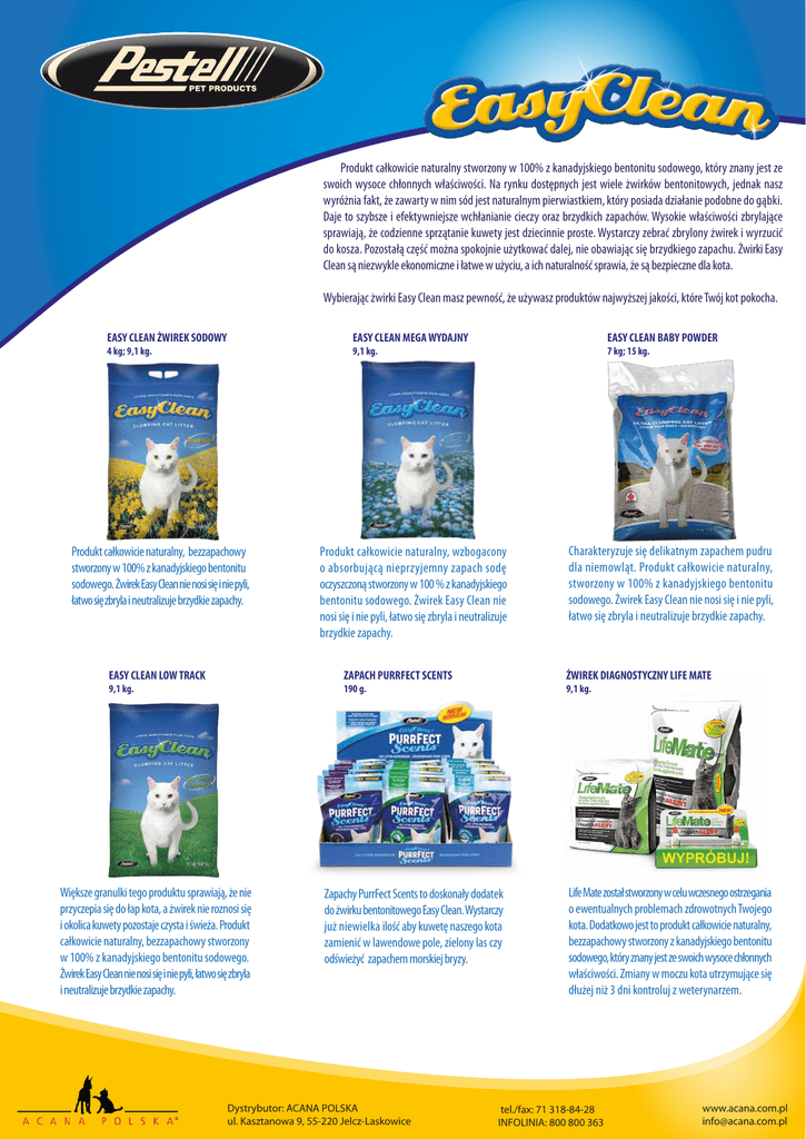 Produkt całkowicie naturalny stworzony w 100% z kanadyjskiego bentonitu sodowego, który znany jest ze swoich wysoce chłonnych właściwości. Na rynku dostępnych jest wiele żwirków bentonitowych, jednak nasz wyróżnia fakt, że zawarty w nim sód jest naturalnym pierwiastkiem, który posiada działanie podobne do gąbki. Daje to szybsze i efektywniejsze wchłanianie cieczy oraz brzydkich zapachów. Wysokie właściwości zbrylające sprawiają, że codzienne sprzątanie kuwety jest dziecinnie proste. Wystarczy zebrać zbrylony żwirek i wyrzucić do kosza. Pozostałą część można spokojnie użytkować dalej, nie obawiając się brzydkiego zapachu. Żwirki Easy Clean są niezwykle ekonomiczne i łatwe w użyciu, a ich naturalność sprawia, że są bezpieczne dla kota. Wybierając żwirki Easy Clean masz pewność, że używasz produktów najwyższej jakości, które Twój kot pokocha. EASY CLEAN ŻWIREK SODOWY EASY CLEAN MEGA WYDAJNY EASY CLEAN BABY POWDER 4 kg; 9,1 kg. 9,1 kg. 7 kg; 15 kg. Produkt całkowicie naturalny, bezzapachowy stworzony w 100% z kanadyjskiego bentonitu sodowego. Żwirek Easy Clean nie nosi się i nie pyli, łatwo się zbryla i neutralizuje brzydkie zapachy. Produkt całkowicie naturalny, wzbogacony o absorbującą nieprzyjemny zapach sodę oczyszczoną stworzony w 100 % z kanadyjskiego bentonitu sodowego. Żwirek Easy Clean nie nosi się i nie pyli, łatwo się zbryla i neutralizuje brzydkie zapachy. Charakteryzuje się delikatnym zapachem pudru dla niemowląt. Produkt całkowicie naturalny, stworzony w 100% z kanadyjskiego bentonitu sodowego. Żwirek Easy Clean nie nosi się i nie pyli, łatwo się zbryla i neutralizuje brzydkie zapachy. EASY CLEAN LOW TRACK ZAPACH PURRFECT SCENTS ŻWIREK DIAGNOSTYCZNY LIFE MATE 9,1 kg. 190 g. 9,1 kg. WYPRÓBUJ! Większe granulki tego produktu sprawiają, że nie przyczepia się do łap kota, a żwirek nie roznosi się i okolica kuwety pozostaje czysta i świeża. Produkt całkowicie naturalny, bezzapachowy stworzony w 100% z kanadyjskiego bentonitu sodowego. Żwirek Easy Clean nie nosi się i nie pyli, łatwo się zbryla i neutralizuje brzydkie zapachy. Zapachy PurrFect Scents to doskonały dodatek do żwirku bentonitowego Easy Clean. Wystarczy już niewielka ilość aby kuwetę naszego kota zamienić w lawendowe pole, zielony las czy odświeżyć zapachem morskiej bryzy. Dystrybutor: ACANA POLSKA ul. Kasztanowa 9, 55-220 Jelcz-Laskowice Life Mate został stworzony w celu wczesnego ostrzegania o ewentualnych problemach zdrowotnych Twojego kota. Dodatkowo jest to produkt całkowicie naturalny, bezzapachowy stworzony z kanadyjskiego bentonitu sodowego, który znany jest ze swoich wysoce chłonnych właściwości. Zmiany w moczu kota utrzymujące się dłużej niż 3 dni kontroluj z weterynarzem. tel./fax: 71 318-84-28 INFOLINIA: 800 800 363 www.acana.com.pl [email protected]