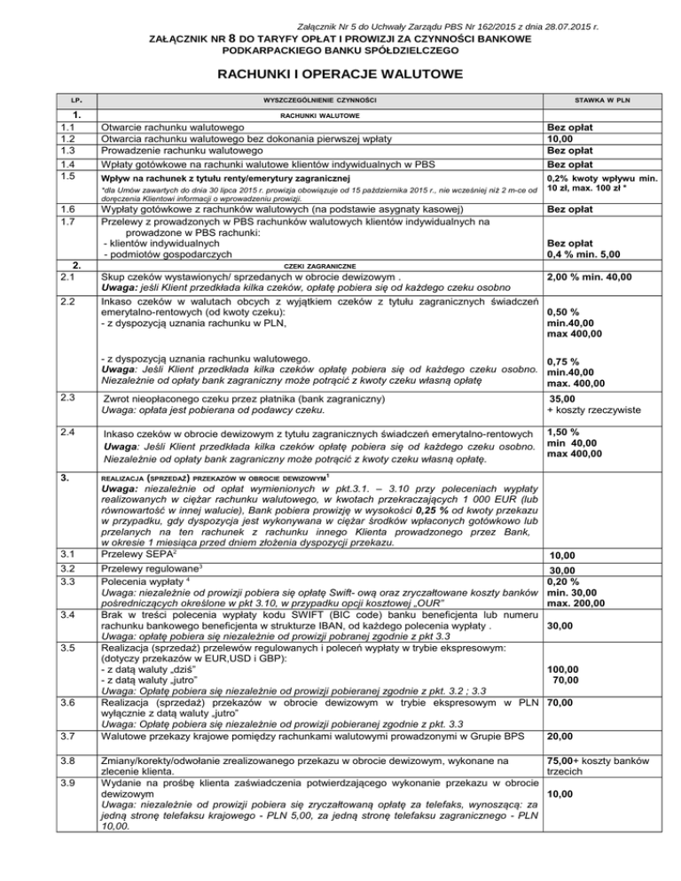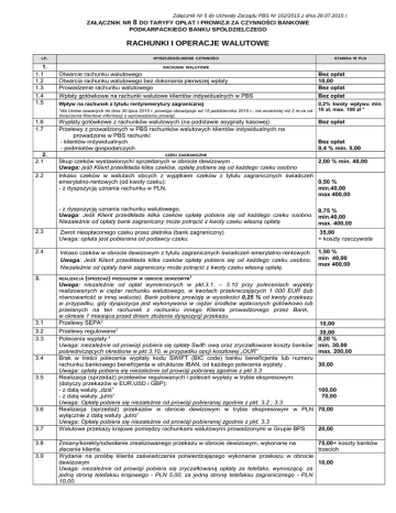 Załącznik Nr 5 do Uchwały Zarządu PBS Nr 162/2015 z dnia 28.07.2015 r. ZAŁĄCZNIK NR 8 DO TARYFY OPŁAT I PROWIZJI ZA CZYNNOŚCI BANKOWE PODKARPACKIEGO BANKU SPÓŁDZIELCZEGO RACHUNKI I OPERACJE WALUTOWE LP. 1. 1.1 1.2 1.3 1.4 1.5 WYSZCZEGÓLNIENIE CZYNNOŚCI RACHUNKI WALUTOWE Otwarcie rachunku walutowego Otwarcia rachunku walutowego bez dokonania pierwszej wpłaty Prowadzenie rachunku walutowego Bez opłat 10,00 Bez opłat Wpłaty gotówkowe na rachunki walutowe klientów indywidualnych w PBS Bez opłat Wpływ na rachunek z tytułu renty/emerytury zagranicznej 0,2% kwoty wpływu min. 10 zł, max. 100 zł * *dla Umów zawartych do dnia 30 lipca 2015 r. prowizja obowiązuje od 15 października 2015 r., nie wcześniej niż 2 m-ce od doręczenia Klientowi informacji o wprowadzeniu prowizji. 1.6 1.7 2. 2.1 2.2 STAWKA W PLN Wypłaty gotówkowe z rachunków walutowych (na podstawie asygnaty kasowej) Przelewy z prowadzonych w PBS rachunków walutowych klientów indywidualnych na prowadzone w PBS rachunki: - klientów indywidualnych - podmiotów gospodarczych Bez opłat Bez opłat 0,4 % min. 5,00 CZEKI ZAGRANICZNE Skup czeków wystawionych/ sprzedanych w obrocie dewizowym . 2,00 % min. 40,00 Uwaga: jeśli Klient przedkłada kilka czeków, opłatę pobiera się od każdego czeku osobno Inkaso czeków w walutach obcych z wyjątkiem czeków z tytułu zagranicznych świadczeń emerytalno-rentowych (od kwoty czeku): 0,50 % - z dyspozycją uznania rachunku w PLN, min.40,00 max 400,00 - z dyspozycją uznania rachunku walutowego. 0,75 % Uwaga: Jeśli Klient przedkłada kilka czeków opłatę pobiera się od każdego czeku osobno. min.40,00 Niezależnie od opłaty bank zagraniczny może potrącić z kwoty czeku własną opłatę max. 400,00 2.3 Zwrot nieopłaconego czeku przez płatnika (bank zagraniczny) Uwaga: opłata jest pobierana od podawcy czeku. 35,00 + koszty rzeczywiste 2.4 Inkaso czeków w obrocie dewizowym z tytułu zagranicznych świadczeń emerytalno-rentowych Uwaga: Jeśli Klient przedkłada kilka czeków opłatę pobiera się od każdego czeku osobno. Niezależnie od opłaty bank zagraniczny może potrącić z kwoty czeku własną opłatę. 1,50 % min 40,00 max 400,00 1 3. REALIZACJA (SPRZEDAŻ ) PRZEKAZÓW W OBROCIE DEWIZOWYM 3.1 Uwaga: niezależnie od opłat wymienionych w pkt.3.1. – 3.10 przy poleceniach wypłaty realizowanych w ciężar rachunku walutowego, w kwotach przekraczających 1 000 EUR (lub równowartość w innej walucie), Bank pobiera prowizję w wysokości 0,25 % od kwoty przekazu w przypadku, gdy dyspozycja jest wykonywana w ciężar środków wpłaconych gotówkowo lub przelanych na ten rachunek z rachunku innego Klienta prowadzonego przez Bank, w okresie 1 miesiąca przed dniem złożenia dyspozycji przekazu. Przelewy SEPA2 3.2 3.3 3.4 3.5 3.6 3.7 3.8 3.9 Przelewy regulowane3 Polecenia wypłaty 4 Uwaga: niezależnie od prowizji pobiera się opłatę Swift- ową oraz zryczałtowane koszty banków pośredniczących określone w pkt 3.10, w przypadku opcji kosztowej „OUR” Brak w treści polecenia wypłaty kodu SWIFT (BIC code) banku beneficjenta lub numeru rachunku bankowego beneficjenta w strukturze IBAN, od każdego polecenia wypłaty . Uwaga: opłatę pobiera się niezależnie od prowizji pobranej zgodnie z pkt 3.3 Realizacja (sprzedaż) przelewów regulowanych i poleceń wypłaty w trybie ekspresowym: (dotyczy przekazów w EUR,USD i GBP): - z datą waluty „dziś” - z datą waluty „jutro” Uwaga: Opłatę pobiera się niezależnie od prowizji pobieranej zgodnie z pkt. 3.2 ; 3.3 Realizacja (sprzedaż) przekazów w obrocie dewizowym w trybie ekspresowym w PLN wyłącznie z datą waluty „jutro” Uwaga: Opłatę pobiera się niezależnie od prowizji pobieranej zgodnie z pkt. 3.3 Walutowe przekazy krajowe pomiędzy rachunkami walutowymi prowadzonymi w Grupie BPS 10,00 30,00 0,20 % min. 30,00 max. 200,00 30,00 100,00 70,00 70,00 20,00 Zmiany/korekty/odwołanie zrealizowanego przekazu w obrocie dewizowym, wykonane na 75,00+ koszty banków zlecenie klienta. trzecich Wydanie na prośbę klienta zaświadczenia potwierdzającego wykonanie przekazu w obrocie dewizowym 10,00 Uwaga: niezależnie od prowizji pobiera się zryczałtowaną opłatę za telefaks, wynoszącą: za jedną stronę telefaksu krajowego - PLN 5,00, za jedną stronę telefaksu zagranicznego - PLN 10,00. Załącznik Nr 5 do Uchwały Zarządu PBS Nr 162/2015 z dnia 28.07.2015 r. ZAŁĄCZNIK NR 8 DO TARYFY OPŁAT I PROWIZJI ZA CZYNNOŚCI BANKOWE PODKARPACKIEGO BANKU SPÓŁDZIELCZEGO RACHUNKI I OPERACJE WALUTOWE 3.10 Zryczałtowane koszty banków pośredniczących pobierane „z góry” od poleceń wypłaty: 3.10.1 Przy kwotach nie przekraczających EUR 5000,00 lub jej równowartości w innej walucie wymienialnej Przy kwotach od EUR 5000,01 do EUR 50.000,00 włącznie lub ich równowartości w innej walucie wymienialnej Przy kwotach od EUR 50.000,01 do „bez ograniczeń” lub ich równowartości w innej walucie wymienialnej Reklamacja przekazu w obrocie dewizowym. 3.10.2 3.10.3 3.11 4. 4.1 4.2 4.3 4.4 4.5 4.6 4.7 4.8 5. 5.1. 5.2 5.3 5.4 5.5 5.6 50,00 60,00 70,00 75,00 zł + koszty banków trzecich REALIZACJA PRZEKAZÓW W OBROCIE DEWIZOWYM, OTRZYMYWANYCH Z BANKÓW KRAJOWYCH I ZAGRANICZNYCH, W TYM ŚWIADCZENIA EMERYTALNO-RENTOWE Przelewy SEPA/ polecenia wypłaty/przelewy regulowane/świadczenia emerytalno-rentowe na kwoty nie przekraczające równowartości 10,00 EUR Przelewy SEPA Uwaga: nie dotyczy świadczeń emerytalno-rentowych Przelewy regulowane Uwaga: nie dotyczy świadczeń emerytalno-rentowych Polecenia wypłaty Uwaga: nie dotyczy świadczeń emerytalno-rentowych Brak w treści polecenia wypłaty numeru rachunku odbiorcy w standardzie IBAN lub kodu SWIFT (BIC code) banku beneficjenta, od każdego polecenia wypłaty. Uwaga: opłatę pobiera się niezależnie od prowizji pobranej zgodnie z pkt 4.4 ; 4.8 Zwrot kwoty polecenia wypłaty/ przelewu regulowanego w związku z błędami uniemożliw