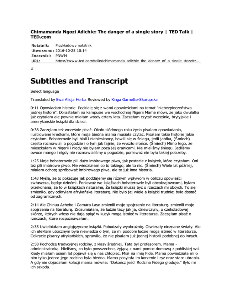 Chimamanda Ngozi Adichie: The danger of a single story | TED Talk | TED.com No tatn ik : Utw o rzo n o : Zn ac zn iki : URL: Przykładow y notatnik 2016-10-25 10:14 PNWM https://ww w.ted.com/talks/chimamanda_adichie_the_danger_of_a_single_story/tr… 2 Subtitles and Transcript Select language Translated by Ewa Alicja Herba Reviewed by Kinga Garnette-Skorupska 0:11 Opowiadam historie. Podzielę się z wami opowieściami na temat "niebezpieczeństwa jednej historii". Dorastałam na kampusie we wschodniej Nigerii Mama mówi, że jako dwulatka już czytałam ale pewnie miałam wtedy cztery lata. Zaczęłam czytać wcześnie, brytyjskie i amerykańskie książki dla dzieci. 0:38 Zaczęłam też wcześnie pisać. Około siódmego roku życia pisałam opowiadania, ilustrowane kredkami, które moja biedna mama musiała czytać. Pisałam takie historie jakie czytałam. Bohaterowie byli biali i niebieskoocy, bawili się w śniegu, jedli jabłka, (Śmiech) często rozmawiali o pogodzie i o tym jak fajnie, że wyszło słońce. (Śmiech) Mimo tego, że mieszkałam w Nigerii i nigdy nie byłam poza jej granicami. Nie mieliśmy śniegu. Jedliśmy owoce mango i nigdy nie rozmawialiśmy o pogodzie, ponieważ nie było takiej potrzeby. 1:25 Moje bohaterowie pili dużo imbirowego piwa, jak postacie z książek, które czytałam. Oni też pili imbirowe piwo. Nie wiedziałam co to takiego, ale to nic. (Śmiech) Wiele lat później, miałam ochotę spróbować imbirowego piwa, ale to już inna historia. 1:43 Myślę, że to pokazuje jak poddajemy się różnym wpływom w obliczu opowieści zwłaszcza, będąc dziećmi. Ponieważ we książkach bohaterowie byli obcokrajowcami, byłam przekonana, że to w książkach naturalne, Że książki muszą być o rzeczach mi obcych. To się zmieniło, gdy odkryłam afrykańską literaturę. Nie było jej wiele a książki trudniej było dostać od zagranicznych. 2:14 Ale Chinua Achebe i Camara Laye zmienili moje spojrzenie na literaturę. zmienili moje spojrzenie na literaturę. Zrozumiałam, że ludzie tacy jak ja, dziewczyny, o czekoladowej skórze, których włosy nie dają spiąć w kucyk mogą istnieć w literaturze. Zaczęłam pisać o rzeczach, które rozpoznawałam. 2:35 Uwielbiałam anglojęzyczne książki. Pobudzały wyobraźnię. Otwierały nieznane światy. Ale ich efektem ubocznym była niewiedza o tym, że mi podobni ludzie mogą istnieć w literaturze. Odkrycie pisarzy afrykańskich, sprawiło, że nie pisałam już jednej historii podobnej do innych. 2:58 Pochodzę tradycyjnej rodziny, z klasy średniej. Tata był profesorem. Mama administratorką. Mieliśmy, co było powszechne, żyjącą z nami pomoc domową z pobliskiej wsi. Kiedy miałam osiem lat pojawił się u nas chłopiec. Miał na imię Fide. Mama powiedziała mi o nim tylko jedno: jego rodzina była biedna. Mama posyłała im korzenie i ryż oraz stare ubrania. A gdy nie dojadałam kolacji mama mówiła: "Dokończ jeść! Rodzina Fidego głoduje." Było mi ich szkoda. 3:42 Raz poszliśmy do jego wioski w odwiedziny. A jego mama pokazała nam wzorzysty koszyk zrobiony z wysuszonej rafi przez brata Fidiego. Byłam zdumiona. Nie przyszło mi na myśl, że ktoś z jego rodziny może coś takiego zrobić. Słyszałam tylko o tym, że byli biedni. Nie byłam w stanie dojrzeć czegoś innego niż bieda. Bieda była jedyną historią na ich temat. 4:12 Wiele lat później, myślałam o tym jadąc na studia do Ameryki. Miałam 19 lat. Moja współlokatorka była zdziwiona. Pytała, gdzie nauczyłam się tak dobrze mówić, i była zmieszana, gdy odpowiedziałam jej, że angielski jest językiem urzędowym Nigerii. Chciała posłuchać "muzyki plemiennej" i była równie zawiedziona gdy puściłam jej Mariah Carey. (Śmiech) Założyła, że nie wiem jak używać kuchenki... 4:49 "Uderzyło" mnie to, że współczuła mi, zanim jeszcze mnie zobaczyła. Jej postawa wobec mnie jako Afrykanki, była pełna protekcjonalności i dobrodusznego żalu. Ta dziewczyna znała tylko jedną historię Afryki. Historię nieszczęścia. W tej historii nie było możliwości aby Afrykanie mogli być podobni. Jedyne co mogła czuć to żal. Nie widziała mnie jako podobnego człowieka. 5:20 Zanim pojechałam do Ameryki nie identyfikowałam się świadomie jako Afrykanka. Ale w USA miałam być ekspertem od Afryki. Mimo tego, że nie wiedziałam nic o np. Namibii. Udało mi się "objąć" swoją nową tożsamość. Dziś, myślę o sobie jako o Afrykance. Ale nadal irytuje mnie kiedy określa się Afrykę mianem państwa. Najświeższym przykładem jest cudowny lot z Lagos, dwa dni temu. Na pokładzie linii Virgin podano komunikat o działalności charytatywnej w "Indiach, Afryce i innych krajach" (Śmiech) 5:55 Dzięki latach spędzonych w USA jako Afrykanka zaczęłam rozumieć reakcję mojej współlokatorki. Gdyby nie dzieciństwo w Nigerii, moja wiedza o Afryce pochodziłaby z popularnych obrazków. Myślałabym, że Afryka to ląd pięknych krajobrazów i zwierząt, niezrozumiałych ludzi, bezsensowne wojen, głodu i AIDS, ludzi bez własnego głosu, czekających na ocalenie, przez "białego obcokrajowca". Postrzegałabym Afrykanów jak rodzinę Fidela jako dziecko. 6:34 Pojedyncza wizja Afryki pochodzi z literatury zachodniej Zacytuję fragment z zapisków kupca Johna Locka z Londynu, który przypłynął do Afryki w 1561 roku. To z jego dziennika podróży. Po nazwaniu czarnych Afrykanów "bestiami bez domów" pisze dalej: "są to również ludzie bez głów, mający usta i oczy na klatce piersiowej." 7:04 Czytając to śmieję się za każdym razem. Wyobraźnia Johna Locka jest godna podziwu. Jego relacja jest ważna bo reprezentuje początek tradycji opowiadania historii o Afryce na Zachodzie. Tradycji opisywania tych rejonów w negatywnym świetle, jako innych. Pisania o ludziach, którzy według Rudyarda Kiplinga, są "pół diabłami, pół dziećmi". 7:31 Moja Amerykańska współlokatorka musiała przez 