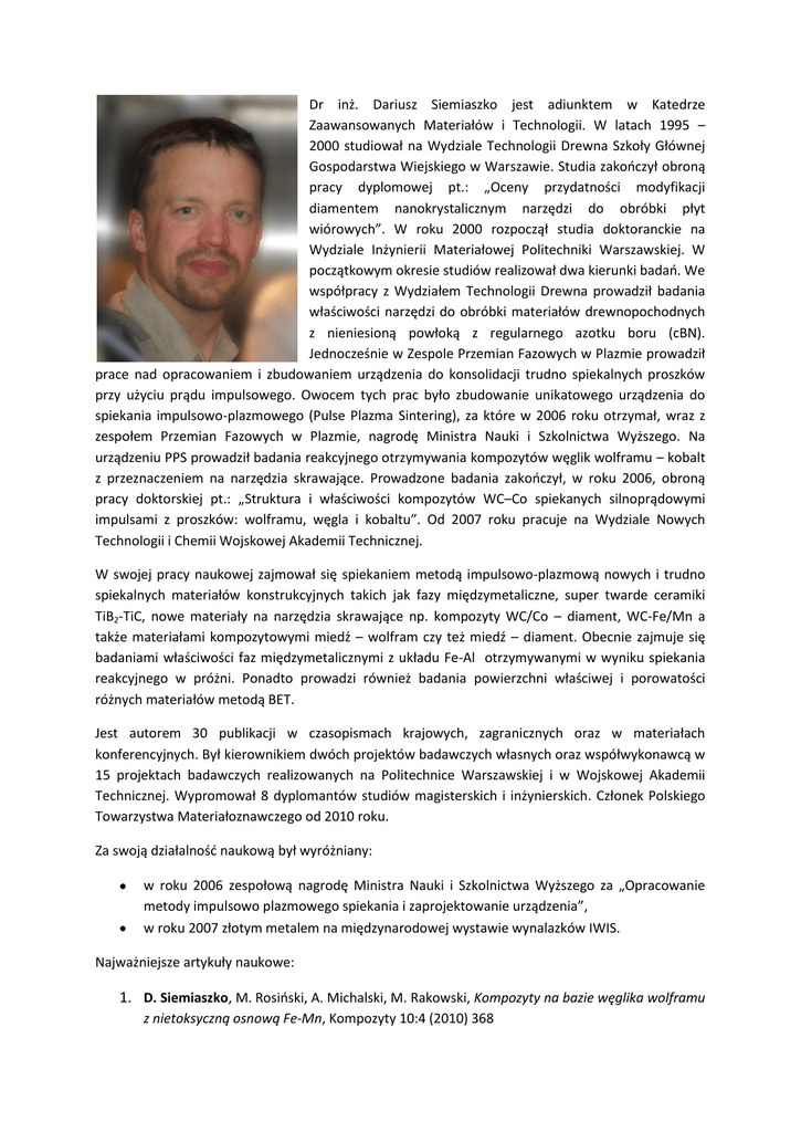 Dr inż. Dariusz Siemiaszko jest adiunktem w Katedrze Zaawansowanych Materiałów i Technologii. W latach 1995 – 2000 studiował na Wydziale Technologii Drewna Szkoły Głównej Gospodarstwa Wiejskiego w Warszawie. Studia zakończył obroną pracy dyplomowej pt.: „Oceny przydatności modyfikacji diamentem nanokrystalicznym narzędzi do obróbki płyt wiórowych”. W roku 2000 rozpoczął studia doktoranckie na Wydziale Inżynierii Materiałowej Politechniki Warszawskiej. W początkowym okresie studiów realizował dwa kierunki badań. We współpracy z Wydziałem Technologii Drewna prowadził badania właściwości narzędzi do obróbki materiałów drewnopochodnych z nieniesioną powłoką z regularnego azotku boru (cBN). Jednocześnie w Zespole Przemian Fazowych w Plazmie prowadził prace nad opracowaniem i zbudowaniem urządzenia do konsolidacji trudno spiekalnych proszków przy użyciu prądu impulsowego. Owocem tych prac było zbudowanie unikatowego urządzenia do spiekania impulsowo-plazmowego (Pulse Plazma Sintering), za które w 2006 roku otrzymał, wraz z zespołem Przemian Fazowych w Plazmie, nagrodę Ministra Nauki i Szkolnictwa Wyższego. Na urządzeniu PPS prowadził badania reakcyjnego otrzymywania kompozytów węglik wolframu – kobalt z przeznaczeniem na narzędzia skrawające. Prowadzone badania zakończył, w roku 2006, obroną pracy doktorskiej pt.: „Struktura i właściwości kompozytów WC–Co spiekanych silnoprądowymi impulsami z proszków: wolframu, węgla i kobaltu”. Od 2007 roku pracuje na Wydziale Nowych Technologii i Chemii Wojskowej Akademii Technicznej. W swojej pracy naukowej zajmował się spiekaniem metodą impulsowo-plazmową nowych i trudno spiekalnych materiałów konstrukcyjnych takich jak fazy międzymetaliczne, super twarde ceramiki TiB2-TiC, nowe materiały na narzędzia skrawające np. kompozyty WC/Co – diament, WC-Fe/Mn a także materiałami kompozytowymi miedź – wolfram czy też miedź – diament. Obecnie zajmuje się badaniami właściwości faz międzymetalicznymi z układu Fe-Al otrzymywanymi w wyniku spiekania reakcyjnego w próżni. Ponadto prowadzi również badania powierzchni właściwej i porowatości różnych materiałów metodą BET. Jest autorem 30 publikacji w czasopismach krajowych, zagranicznych oraz w materiałach konferencyjnych. Był kierownikiem dwóch projektów badawczych własnych oraz współwykonawcą w 15 projektach badawczych realizowanych na Politechnice Warszawskiej i w Wojskowej Akademii Technicznej. Wypromował 8 dyplomantów studiów magisterskich i inżynierskich. Członek Polskiego Towarzystwa Materiałoznawczego od 2010 roku. Za swoją działalność naukową był wyróżniany: w roku 2006 zespołową nagrodę Ministra Nauki i Szkolnictwa Wyższego za „Opracowanie metody impulsowo plazmowego spiekania i zaprojektowanie urządzenia”, w roku 2007 złotym metalem na międzynarodowej wystawie wynalazków IWIS. Najważniejsze artykuły naukowe: 1. D. Siemiaszko, M. Rosiński, A. Michalski, M. Rakowski, Kompozyty na bazie węglika wolframu z nietoksyczną osnową Fe-Mn, Kompozyty 10:4 (2010) 368 2. D. Siemiaszko, M. Rosiński, A. Michalski, Nanocrystalline WC with non-toxic Fe-Mn binder, 3. 4. 5. 6. 7. 8. 9. Physica Status Solidi C, A207 (2010) 1376 Ł. Ciupiński, D. Siemiaszko, M. Rosiński, A. Michalski, K.J. Kurzydłowski, Heat Sink Materials Processing by Pulse Plasma Sintering, Advanced Materials Research, 59 (2009) 120 M. Rosiński, A. Michalski, D. Siemiaszko, TiB2-TiC sinters produced from B4C and titanium powders using pulse plasma sintering, Ceramics 103 (2008) 412 A. Michalski, D. Siemiaszko, M. Rosiński, Diamond-WC composite sintered by the pulse plasma method, Ceramics 103 (2008) D. Siemiaszko, A. Michalski, M. Rosiński, Mechanical properties of WC-Co sinters consolidated by classical sintering and pulse plasma sintering, Ceramics 103 (2008) 407 M. Rosiński, E. Fortuna, A. Michalski, D. Siemiaszko, K. J. Kurzydłowski, Functionally graded W-Cu composites produced by the Pulse Plasma Sintering method, Inżynieria Materiałowa, 34 (2007) 593 A. Michalski, D. Siemiaszko, Nanocrystalline cemented carbides sintered by the pulse plasma method, International Journal of Refractory Metals and Hard Materials, 25 (2007) 153. A. Michalski, J. Jaroszewicz, M. Rosiński, D. Siemiaszko, NiAl-Al2O3 composites produced by pulse plasma sintering with the participation of the SHS reaction, Intermetalic, 14, 2006, 603.