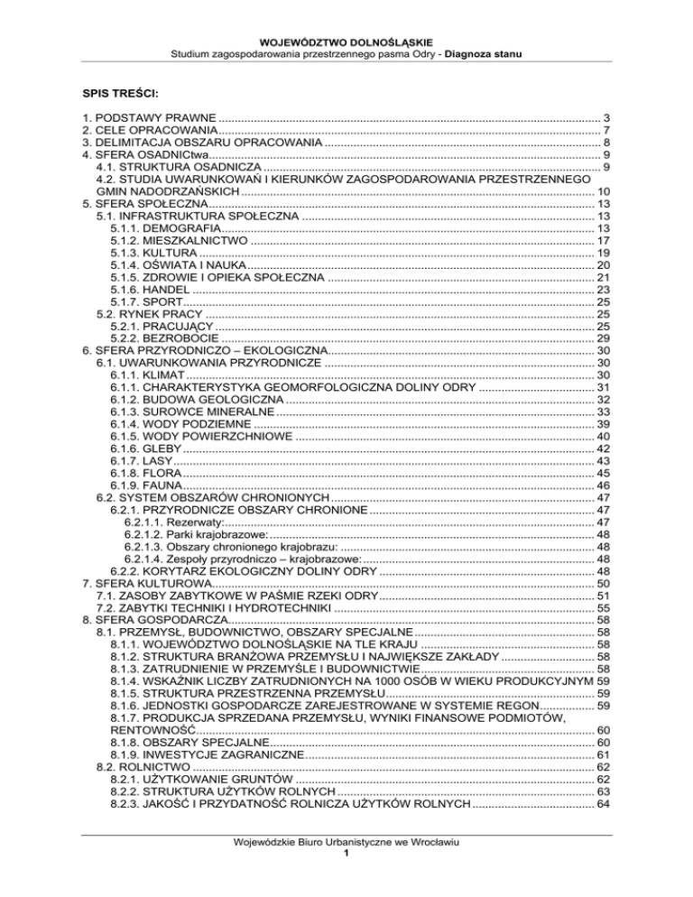 WOJEWÓDZTWO DOLNOŚLĄSKIE Studium zagospodarowania przestrzennego pasma Odry - Diagnoza stanu SPIS TREŚCI: 1. PODSTAWY PRAWNE ....................................................................................................................... 3 2. CELE OPRACOWANIA....................................................................................................................... 7 3. DELIMITACJA OBSZARU OPRACOWANIA ...................................................................................... 8 4. SFERA OSADNICtwa.......................................................................................................................... 9 4.1. STRUKTURA OSADNICZA ......................................................................................................... 9 4.2. STUDIA UWARUNKOWAŃ I KIERUNKÓW ZAGOSPODAROWANIA PRZESTRZENNEGO GMIN NADODRZAŃSKICH .............................................................................................................. 10 5. SFERA SPOŁECZNA........................................................................................................................ 13 5.1. INFRASTRUKTURA SPOŁECZNA ........................................................................................... 13 5.1.1. DEMOGRAFIA.................................................................................................................... 13 5.1.2. MIESZKALNICTWO ........................................................................................................... 17 5.1.3. KULTURA ........................................................................................................................... 19 5.1.4. OŚWIATA I NAUKA............................................................................................................ 20 5.1.5. ZDROWIE I OPIEKA SPOŁECZNA ................................................................................... 21 5.1.6. HANDEL ............................................................................................................................. 23 5.1.7. SPORT................................................................................................................................ 25 5.2. RYNEK PRACY ......................................................................................................................... 25 5.2.1. PRACUJĄCY ...................................................................................................................... 25 5.2.2. BEZROBOCIE .................................................................................................................... 29 6. SFERA PRZYRODNICZO – EKOLOGICZNA................................................................................... 30 6.1. UWARUNKOWANIA PRZYRODNICZE .................................................................................... 30 6.1.1. KLIMAT ............................................................................................................................... 30 6.1.1. CHARAKTERYSTYKA GEOMORFOLOGICZNA DOLINY ODRY .................................... 31 6.1.2. BUDOWA GEOLOGICZNA ................................................................................................ 32 6.1.3. SUROWCE MINERALNE ................................................................................................... 33 6.1.4. WODY PODZIEMNE .......................................................................................................... 39 6.1.5. WODY POWIERZCHNIOWE ............................................................................................. 40 6.1.6. GLEBY ................................................................................................................................ 42 6.1.7. LASY................................................................................................................................... 43 6.1.8. FLORA ................................................................................................................................ 45 6.1.9. FAUNA................................................................................................................................ 46 6.2. SYSTEM OBSZARÓW CHRONIONYCH .................................................................................. 47 6.2.1. PRZYRODNICZE OBSZARY CHRONIONE ...................................................................... 47 6.2.1.1. Rezerwaty:................................................................................................................... 47 6.2.1.2. Parki krajobrazowe:..................................................................................................... 48 6.2.1.3. Obszary chronionego krajobrazu: ............................................................................... 48 6.2.1.4. Zespoły przyrodniczo – krajobrazowe:........................................................................ 48 6.2.2. KORYTARZ EKOLOGICZNY DOLINY ODRY ................................................................... 48 7. SFERA KULTUROWA....................................................................................................................... 50 7.1. ZASOBY ZABYTKOWE W PAŚMIE RZEKI ODRY................................................................... 51 7.2. ZABYTKI TECHNIKI I HYDROTECHNIKI ................................................................................. 55 8. SFERA GOSPODARCZA.................................................................................................................. 58 8.1. PRZEMYSŁ, BUDOWNICTWO, OBSZARY SPECJALNE........................................................ 58 8.1.1. WOJEWÓDZTWO DOLNOŚLĄSKIE NA TLE KRAJU ...................................................... 58 8.1.2. STRUKTURA BRANŻOWA PRZEMYSŁU I NAJWIĘKSZE ZAKŁADY ............................. 58 8.1.3. ZATRUDNIENIE W PRZEMYŚLE I BUDOWNICTWIE...................................................... 5