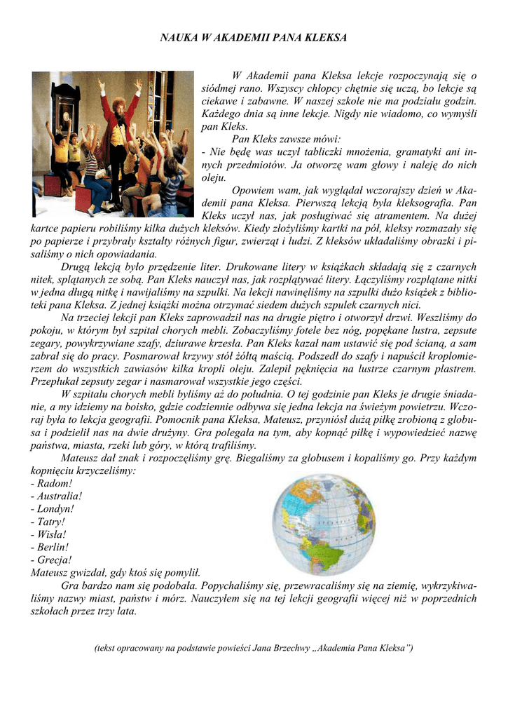 NAUKA W AKADEMII PANA KLEKSA W Akademii pana Kleksa lekcje rozpoczynają się o siódmej rano. Wszyscy chłopcy chętnie się uczą, bo lekcje są ciekawe i zabawne. W naszej szkole nie ma podziału godzin. Każdego dnia są inne lekcje. Nigdy nie wiadomo, co wymyśli pan Kleks. Pan Kleks zawsze mówi: - Nie będę was uczył tabliczki mnożenia, gramatyki ani innych przedmiotów. Ja otworzę wam głowy i naleję do nich oleju. Opowiem wam, jak wyglądał wczorajszy dzień w Akademii pana Kleksa. Pierwszą lekcją była kleksografia. Pan Kleks uczył nas, jak posługiwać się atramentem. Na dużej kartce papieru robiliśmy kilka dużych kleksów. Kiedy złożyliśmy kartki na pół, kleksy rozmazały się po papierze i przybrały kształty różnych figur, zwierząt i ludzi. Z kleksów układaliśmy obrazki i pisaliśmy o nich opowiadania. Drugą lekcją było przędzenie liter. Drukowane litery w książkach składają się z czarnych nitek, splątanych ze sobą. Pan Kleks nauczył nas, jak rozplątywać litery. Łączyliśmy rozplątane nitki w jedna długą nitkę i nawijaliśmy na szpulki. Na lekcji nawinęliśmy na szpulki dużo książek z biblioteki pana Kleksa. Z jednej książki można otrzymać siedem dużych szpulek czarnych nici. Na trzeciej lekcji pan Kleks zaprowadził nas na drugie piętro i otworzył drzwi. Weszliśmy do pokoju, w którym był szpital chorych mebli. Zobaczyliśmy fotele bez nóg, popękane lustra, zepsute zegary, powykrzywiane szafy, dziurawe krzesła. Pan Kleks kazał nam ustawić się pod ścianą, a sam zabrał się do pracy. Posmarował krzywy stół żółtą maścią. Podszedł do szafy i napuścił kroplomierzem do wszystkich zawiasów kilka kropli oleju. Zalepił pęknięcia na lustrze czarnym plastrem. Przepłukał zepsuty zegar i nasmarował wszystkie jego części. W szpitalu chorych mebli byliśmy aż do południa. O tej godzinie pan Kleks je drugie śniadanie, a my idziemy na boisko, gdzie codziennie odbywa się jedna lekcja na świeżym powietrzu. Wczoraj była to lekcja geografii. Pomocnik pana Kleksa, Mateusz, przyniósł dużą piłkę zrobioną z globusa i podzielił nas na dwie drużyny. Gra polegała na tym, aby kopnąć piłkę i wypowiedzieć nazwę państwa, miasta, rzeki lub góry, w którą trafiliśmy. Mateusz dał znak i rozpoczęliśmy grę. Biegaliśmy za globusem i kopaliśmy go. Przy każdym kopnięciu krzyczeliśmy: - Radom! - Australia! - Londyn! - Tatry! - Wisła! - Berlin! - Grecja! Mateusz gwizdał, gdy ktoś się pomylił. Gra bardzo nam się podobała. Popychaliśmy się, przewracaliśmy się na ziemię, wykrzykiwaliśmy nazwy miast, państw i mórz. Nauczyłem się na tej lekcji geografii więcej niż w poprzednich szkołach przez trzy lata. (tekst opracowany na podstawie powieści Jana Brzechwy „Akademia Pana Kleksa”) 1.Gdzie dzieją się opisane wydarzenia? Napisz pełnym zdaniem. ………………………………………………………………………………………………………………… ………………………………………………………………………………………………………………… 2. Jakich przedmiotów uczył Pan Kleks w swojej szkole? ………………………………………………………………………………………………………………… ………………………………………………………………………………………………………………… ……………………………………………………………………………………………………………..…. 3. Kto był pomocnikiem Pana Kleksa? ………………………………………………………………………………………………………………… …………………………………………………………………………………………………………..……. 4. Co robił Mateusz gdy ktoś się pomylił? ………………………………………………………………………………………………………………… ………………………………………………………………………………………………………………… 5. Jakie sprzęty były w szpitalu chorych mebli? ………………………………………………………………………………………………………………… ………………………………………………………………………………………………………………… ………………………………………………………………………………………………………………… ……………………………………………………………………………………………………………..…. 6. Podane zwroty i wyrażenia dopasuj do ich znaczeń. zrobić kleksa - rozpocząć pracę lekcja na świeżym powietrzu - stanąć przy czymś zabrać się do pracy - lekcja na boisku ustawić się przy czymś - zrobić plamę z atramentu 7. Podaj formę Narzędnika liczby mnogiej rzeczownika globus. …………………………………………………………………………………………………….…………... 8. Słowo ,,akademia” nie zastąpisz wyrazem: a. szkoła b. apel c. wycieczka d. uczelnia 9. Z jakiej powieści pochodzi fragment tekstu, który czytałeś? ………………………………………………………………………………………………………………… ………………………………………………………………………………………………………………… 10. Opisz swój ulubiony przedmiot szkolny. ………………………………………………………………………………………………………………… ………………………………………………………………………………………………………………… ……………………………………………