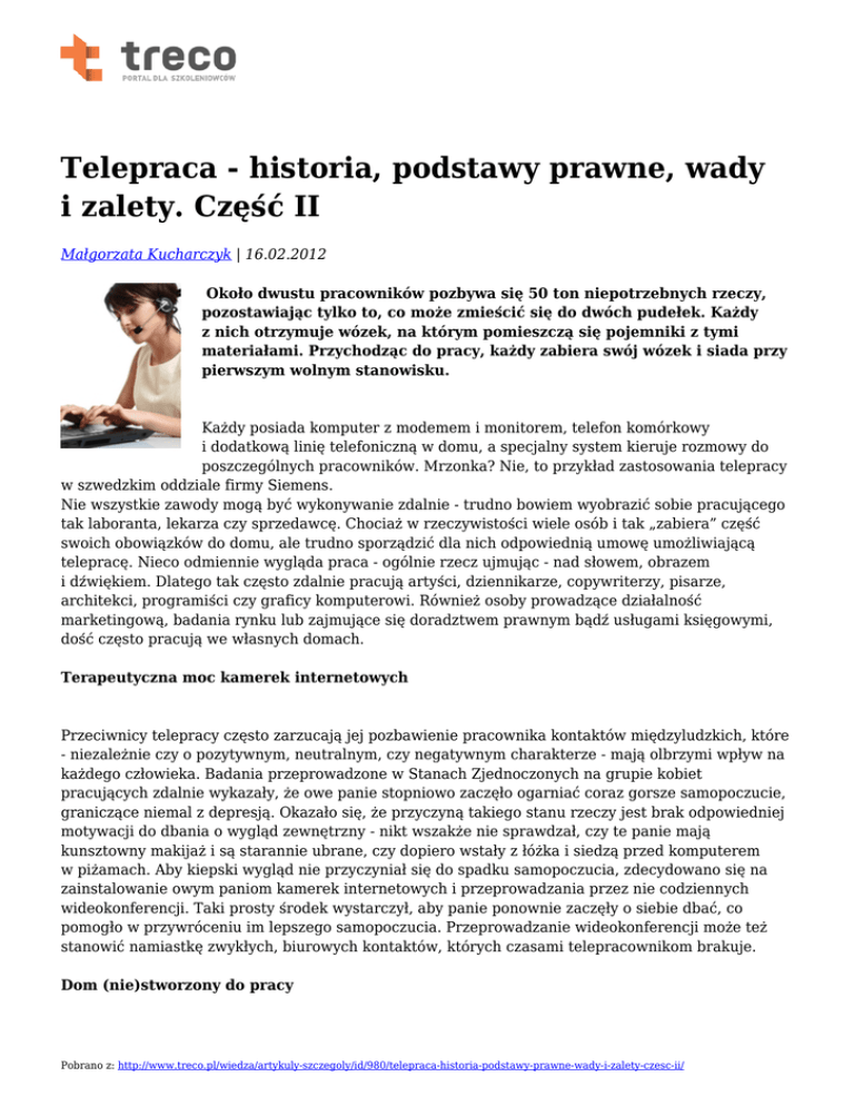 Telepraca - historia, podstawy prawne, wady i zalety. Część II Małgorzata Kucharczyk | 16.02.2012 Około dwustu pracowników pozbywa się 50 ton niepotrzebnych rzeczy, pozostawiając tylko to, co może zmieścić się do dwóch pudełek. Każdy z nich otrzymuje wózek, na którym pomieszczą się pojemniki z tymi materiałami. Przychodząc do pracy, każdy zabiera swój wózek i siada przy pierwszym wolnym stanowisku. Każdy posiada komputer z modemem i monitorem, telefon komórkowy i dodatkową linię telefoniczną w domu, a specjalny system kieruje rozmowy do poszczególnych pracowników. Mrzonka? Nie, to przykład zastosowania telepracy w szwedzkim oddziale firmy Siemens. Nie wszystkie zawody mogą być wykonywanie zdalnie - trudno bowiem wyobrazić sobie pracującego tak laboranta, lekarza czy sprzedawcę. Chociaż w rzeczywistości wiele osób i tak „zabiera” część swoich obowiązków do domu, ale trudno sporządzić dla nich odpowiednią umowę umożliwiającą telepracę. Nieco odmiennie wygląda praca - ogólnie rzecz ujmując - nad słowem, obrazem i dźwiękiem. Dlatego tak często zdalnie pracują artyści, dziennikarze, copywriterzy, pisarze, architekci, programiści czy graficy komputerowi. Również osoby prowadzące działalność marketingową, badania rynku lub zajmujące się doradztwem prawnym bądź usługami księgowymi, dość często pracują we własnych domach. Terapeutyczna moc kamerek internetowych Przeciwnicy telepracy często zarzucają jej pozbawienie pracownika kontaktów międzyludzkich, które - niezależnie czy o pozytywnym, neutralnym, czy negatywnym charakterze - mają olbrzymi wpływ na każdego człowieka. Badania przeprowadzone w Stanach Zjednoczonych na grupie kobiet pracujących zdalnie wykazały, że owe panie stopniowo zaczęło ogarniać coraz gorsze samopoczucie, graniczące niemal z depresją. Okazało się, że przyczyną takiego stanu rzeczy jest brak odpowiedniej motywacji do dbania o wygląd zewnętrzny - nikt wszakże nie sprawdzał, czy te panie mają kunsztowny makijaż i są starannie ubrane, czy dopiero wstały z łóżka i siedzą przed komputerem w piżamach. Aby kiepski wygląd nie przyczyniał się do spadku samopoczucia, zdecydowano się na zainstalowanie owym paniom kamerek internetowych i przeprowadzania przez nie codziennych wideokonferencji. Taki prosty środek wystarczył, aby panie ponownie zaczęły o siebie dbać, co pomogło w przywróceniu im lepszego samopoczucia. Przeprowadzanie wideokonferencji może też stanowić namiastkę zwykłych, biurowych kontaktów, których czasami telepracownikom brakuje. Dom (nie)stworzony do pracy Pobrano z: http://www.treco.pl/wiedza/artykuly-szczegoly/id/980/telepraca-historia-podstawy-prawne-wady-i-zalety-czesc-ii/ Nie każdy nadaje się do pracy w domu. I nie każdy dom nadaje się do tego, aby w nim pracować. Przy rozpatrywaniu możliwości telepracy należy wziąć pod uwagę także te czynniki. Problem wyobcowania, jaki mogą czuć osoby pracujące w domu, może być rozwiązany poprzez - jak wyżej zainstalowanie kamerek internetowych lub, na szerszą skalę, organizację spotkań integracyjnych, wspólnych wyjazdów i szkoleń. Sporym problemem może być jednak brak dobrej organizacji własnych działań czy, przy bardziej twórczych zajęciach, swoista niemoc odczuwana jedynie we własnych czterech ścianach. Czasami nowe pomysły i bodźce tkwią poza domem i dopiero tam ujawniają się w pełnej okazałości. Istotne też wydaje się być rozpatrzenie, czy na pewno we własnym domu istnieją dobre warunki, aby móc pracować w skupieniu. Dzieci usilnie domagające się posiłku czy uporczywie szczekający pies sąsiada mogą czasami utrudnić wykonywanie nawet najprostszych działań. Oszczędności, oszczędności Wiele osób ceni sobie pracę w domu ze względu na możliwość sporej oszczędności zarówno czasu, jak i pieniędzy. Osiem godzin w pracy i co najmniej godzina przeznaczona na dojazd - wiele osób, szczególnie tych mieszkających daleko od miejsca pracy lub zmuszonych do pokonania mocno zakorkowanych arterii, tak naprawdę przebywa poza domem dziewięć do dwunastu godzin dziennie. Z pewnością nie wpływa to pozytywnie na stworzenie równowagi pomiędzy życiem zawodowym a życiem prywatnym. Oczywiście, są osoby, które sobie świetnie z tym radzą, ale czasami okazuje się, że ta równowaga jest nad wyraz krucha, gdy codzienne zmęczenie zwycięża. Dodatkowo praca w domu pozwala także na oszczędzenie funduszy wydawanych na paliwo czy podróżowanie komunikacją miejską i podmiejską. Oszczędzają również firmy, gdyż koszty zatrudnienia personelu czy wynajmowania powierzchni biurowej ulegają znacznemu obniżeniu. Zalety dla obu stron Pracodawcy z pewnością doceniają w telepracy znaczny wzrost wydajności pracy - nawet o 50%. Pracownicy mający do czynienia z komputerami i tak sporo czasu przeznaczonego na pracę spędzają surfując w sieci, więc tak naprawdę równie dobrze mogą przenieść swoją pracę do domu. Sporymi korzyściami są też konieczność ciągłego podnoszenia kwalifikacji przez pracowników, optymalizacja stanu zatrudnienia oraz znaczna redukcja ilości zwolnień chorobowych. Zaletą jest też możliwość zmniejszenia powierzchni biurowej, wyposażenia i ilości zużywanych materiałów biurowych. I wreszcie - pracodawcy są pewni, że płacą za uzyskane efekty, a nie za czas spędzony w biurze. Z kolei pracownicy doceniają przede wszystkim elastyczność czasu i miejsca pracy oraz umowy o pracę, a także wyżej wspomniane oszczędności. Dodatkowo, w przypadku pracy zdalnej wiek i wygląd pracownika muszą ustąpić na rzecz jego umiejętności. Telepracę cenią sobie także osoby niepełnosprawne oraz osoby mieszkające na obszarach dotkniętych dużym bezrobociem, gdyż praca zdalna umożliwia podpisanie umowy z firmą, której siedziba znajduje się w dowolnym miejscu. Zaplecze technologiczne Nale