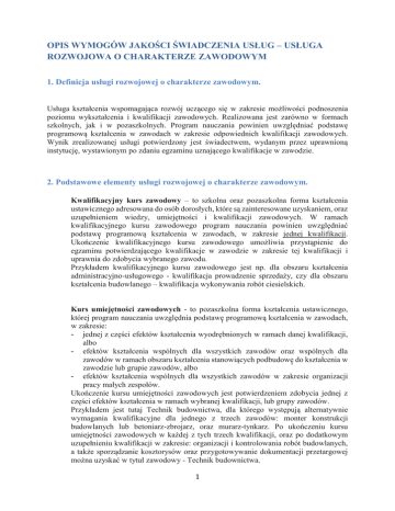 OPIS WYMOGÓW JAKOŚCI ŚWIADCZENIA USŁUG – USŁUGA ROZWOJOWA O CHARAKTERZE ZAWODOWYM 1. Definicja usługi rozwojowej o charakterze zawodowym. Usługa kształcenia wspomagająca rozwój uczącego się w zakresie możliwości podnoszenia poziomu wykształcenia i kwalifikacji zawodowych. Realizowana jest zarówno w formach szkolnych, jak i w pozaszkolnych. Program nauczania powinien uwzględniać podstawę programową kształcenia w zawodach w zakresie odpowiednich kwalifikacji zawodowych. Wynik zrealizowanej usługi potwierdzony jest świadectwem, wydanym przez uprawnioną instytucję, wystawionym po zdaniu egzaminu uznającego kwalifikacje w zawodzie. 2. Podstawowe elementy usługi rozwojowej o charakterze zawodowym. Kwalifikacyjny kurs zawodowy – to szkolna oraz pozaszkolna forma kształcenia ustawicznego adresowana do osób dorosłych, które są zainteresowane uzyskaniem, oraz uzupełnieniem wiedzy, umiejętności i kwalifikacji zawodowych. W ramach kwalifikacyjnego kursu zawodowego program nauczania powinien uwzględniać podstawę̨ programową kształcenia w zawodach, w zakresie jednej kwalifikacji. Ukończenie kwalifikacyjnego kursu zawodowego umożliwia przystąpienie do egzaminu potwierdzającego kwalifikacje w zawodzie w zakresie tej kwalifikacji i uprawnia do zdobycia wybranego zawodu. Przykładem kwalifikacyjnego kursu zawodowego jest np. dla obszaru kształcenia administracyjno-usługowego - kwalifikacja prowadzenie sprzedaży, czy dla obszaru kształcenia budowlanego – kwalifikacja wykonywania robót ciesielskich. Kurs umiejętności zawodowych - to pozaszkolna forma kształcenia ustawicznego, której program nauczania uwzględnia podstawę̨ programową kształcenia w zawodach, w zakresie: - jednej z części efektów kształcenia wyodrębnionych w ramach danej kwalifikacji, albo - efektów kształcenia wspólnych dla wszystkich zawodów oraz wspólnych dla zawodów w ramach obszaru kształcenia stanowiących podbudowę̨ do kształcenia w zawodzie lub grupie zawodów, albo - efektów kształcenia wspólnych dla wszystkich zawodów w zakresie organizacji pracy małych zespołów. Ukończenie kursu umiejętności zawodowych jest potwierdzeniem zdobycia jednej z części efektów kształcenia w ramach wybranej kwalifikacji, lub grupy zawodów. Przykładem jest tutaj Technik budownictwa, dla którego występują alternatywnie wymagania kwalifikacyjne dla jednego z trzech zawodów: monter konstrukcji budowlanych lub betoniarz-zbrojarz, oraz murarz-tynkarz. Po ukończeniu kursu umiejętności zawodowych w każdej z tych trzech kwalifikacji, oraz po dodatkowym uzupełnieniu kwalifikacji w zakresie: organizacji i kontrolowania robót budowlanych, a także sporządzanie kosztorysów oraz przygotowywanie dokumentacji przetargowej można uzyskać w tytuł zawodowy - Technik budownictwa. 1 Kurs inny niż kwalifikacyjny kurs zawodowy i kurs umiejętności zawodowych to pozaszkolna forma kształcenia ustawicznego dotycząca: - turnusów dokształcania teoretycznego młodocianych pracowników w zakresie danego zawodu, - kursów umożliwiających uzyskiwanie i uzupełnianie wiedzy, umiejętności oraz kwalifikacji zawodowych z zakresu zawodów ujętych w klasyfikacji zawodów i specjalności na potrzeby rynku pracy - np. kurs magazyniera z obsługą wózka. 3. Specyfika realizacji usługi rozwojowej o charakterze zawodowym. Kwalifikacyjny kurs zawodowy. Podmiot prowadzący kwalifikacyjny kurs zawodowy jest zobowiązany uwzględnić w realizowanym podczas kursu programie nauczania wskazane w podstawie programowej kształcenia w zawodach, wszystkie komponenty właściwe dla danej kwalifikacji zawodowej. Po ukończeniu kwalifikacyjnego kursu zawodowego i zdaniu egzaminu potwierdzającego kwalifikacje w zawodzie w zakresie danej kwalifikacji, uczestnik otrzymuje świadectwo potwierdzające kwalifikacje w danym zawodzie. Kwalifikacyjny kurs zawodowy kończy się zaliczeniem w formie ustalonej przez podmiot prowadzący kurs. Kwalifikacje w zawodzie, które mogą być kształcone na kwalifikacyjnych kursach zawodowych, są wskazane w klasyfikacji zawodów szkolnictwa zawodowego w ośmiu obszarach kształcenia zawodowego, takich jak: administracyjno – usługowy, budowlany, elektryczno-elektroniczny, mechaniczny i górniczo-hutniczy, rolniczo-leśny z ochroną środowiska, turystyczno-gastronomiczny, medyczno-społeczny, artystyczny. Kwalifikacyjne kursy zawodowe mogą prowadzić: publiczne szkoły prowadzące kształcenie zawodowe w zakresie zawodów, w których kształcą; niepubliczne szkoły posiadające uprawnienia szkół publicznych, prowadzące kształcenie zawodowe w zakresie zawodów, w których kształcą; placówki kształcenia ustawicznego, placówki kształcenia praktycznego, ośrodki dokształcania i doskonalenia zawodowego; instytucje rynku pracy, o których mowa w art. 6 ustawy z dnia 20 kwietnia 2004 r. o promocji zatrudnienia i instytucjach rynku pracy (Dz. U. z 2008 r. Nr 69, poz. 415, z późn. zm.), prowadzące działalność edukacyjno-szkoleniową; podmioty prowadzące działalność oświatową na podstawie ustawy o swobodzie działalności gospodarczej. Podmioty prowadzące kwalifikacyjne kursy zawodowe muszą zapewnić: kadrę̨ dydaktyczną posiadającą kwalifikacje określone odpowiednio w przepisach wydanych na podstawie Karty Nauczyciela; odpowiednie pomieszczenia wyposażone w sprzęt i pomoce dydaktyczne umożliwiające prawidłową realizację kształcenia; 2 bezpieczne i higieniczne warunki pracy i nauki; warunki organizacyjne i techniczne umożliwiające udział w kształceniu osobom niepełnosprawnym; nadzór służący podnoszeniu jakości prowadzonego kształcenia. Dokumentacja prowadzona przez podmiot prowadzący kwalifikacyjne kursy zawodowe musi zawierać: program nauczania; dziennik zajęć; protokół z przeprowadzonego zaliczenia; ewidencję wydanych zaświadczeń. Podstawa programowa kształcenia w zawodach w ramach kwalifikacyjnego kursu za