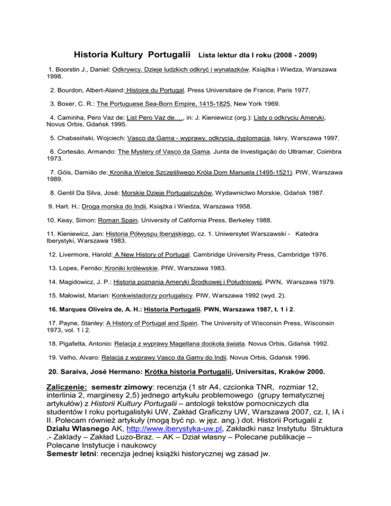 Historia Kultury Portugalii Lista lektur dla I roku (2008 - 2009) 1. Boorstin J., Daniel: Odkrywcy. Dzieje ludzkich odkryć i wynalazków. Książka i Wiedza, Warszawa 1998. 2. Bourdon, Albert-Alaind: Histoire du Portugal. Press Universitaire de France, Paris 1977. 3. Boxer, C. R.: The Portuguese Sea-Born Empire, 1415-1825, New York 1969. 4. Caminha, Pero Vaz de: List Pero Vaz de…., in: J. Kieniewicz (org.): Listy o odkryciu Ameryki, Novus Orbis, Gdańsk 1995. 5. Chabasiński, Wojciech: Vasco da Gama - wyprawy, odkrycia, dyplomacja, Iskry, Warszawa 1997. 6. Cortesăo, Armando: The Mystery of Vasco da Gama. Junta de Investigaçăo do Ultramar, Coimbra 1973. 7. Góis, Damiăo de: Kronika Wielce Szczęśliwego Króla Dom Manuela (1495-1521). PIW, Warszawa 1989. 8. Gentil Da Silva, José: Morskie Dzieje Portugalczyków, Wydawnictwo Morskie, Gdańsk 1987. 9. Hart. H.: Droga morska do Indii, Książka i Wiedza, Warszawa 1958. 10. Keay, Simon: Roman Spain. University of California Press, Berkeley 1988. 11. Kieniewicz, Jan: Historia Półwyspu Iberyjskiego, cz. 1. Uniwersytet Warszawski - Katedra Iberystyki, Warszawa 1983. 12. Livermore, Harold: A New History of Portugal. Cambridge University Press, Cambridge 1976. 13. Lopes, Fernăo: Kroniki królewskie. PIW, Warszawa 1983. 14. Magidowicz, J. P.: Historia poznania Ameryki Środkowej i Południowej, PWN, Warszawa 1979. 15. Małowist, Marian: Konkwistadorzy portugalscy. PIW, Warszawa 1992 (wyd. 2). 16. Marques Oliveira de, A. H.: Historia Portugalii. PWN, Warszawa 1987, t. 1 i 2. 17. Payne, Stanley: A History of Portugal and Spain. The University of Wisconsin Press, Wisconsin 1973, vol. 1 i 2. 18. Pigafetta, Antonio: Relacja z wyprawy Magellana dookoła świata. Novus Orbis, Gdańsk 1992. 19. Velho, Alvaro: Relacja z wyprawy Vasco da Gamy do Indii. Novus Orbis, Gdańsk 1996. 20. Saraiva, José Hermano: Krótka historia Portugalii, Universitas, Kraków 2000. Zaliczenie: semestr zimowy: recenzja (1 str A4, czcionka TNR, rozmiar 12, interlinia 2, marginesy 2,5) jednego artykułu problemowego (grupy tematycznej artykułów) z Historii Kultury Portugalii – antologii tekstów pomocniczych dla studentów I roku portugalistyki UW, Zakład Graficzny UW, Warszawa 2007, cz. I, IA i II. Polecam również artykuły (mogą być np. w jęz. ang.) dot. Historii Portugalii z Działu Wlasnego AK, http://www.iberystyka-uw.pl, Zakładki nasz Instytutu Struktura .- Zaklady – Zakład Luzo-Braz. – AK – Dział własny – Polecane publikacje – Polecane Instytucje i naukowcy Semestr letni: recenzja jednej książki historycznej wg zasad jw.