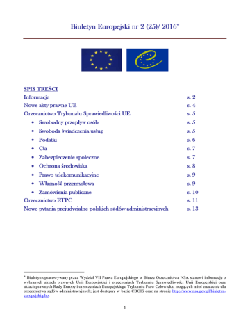 Biuletyn Europejski nr 2 (25)/ 2016 SPIS TREŚCI Informacje Nowe akty prawne UE s. 2 s. 4 Orzecznictwo Trybunału Sprawiedliwości UE s. 5 Swobodny przepływ osób s. 5 Swoboda świadczenia usług s. 5 Podatki s. 6 Cła s. 7 Zabezpieczenie społeczne s. 7 Ochrona środowiska s. 8 Prawo telekomunikacyjne s. 9 Własność przemysłowa s. 9 Zamówienia publiczne Orzecznictwo ETPC s. 10 s. 11 Nowe pytania prejudycjalne polskich sądów administracyjnych s. 13 Biuletyn opracowywany przez Wydział VII Prawa Europejskiego w Biurze Orzecznictwa NSA stanowi informację o wybranych aktach prawnych Unii Europejskiej i orzeczeniach Trybunału Sprawiedliwości Unii Europejskiej oraz aktach prawnych Rady Europy i orzeczeniach Europejskiego Trybunału Praw Człowieka, mogących mieć znaczenie dla orzecznictwa sądów administracyjnych; jest dostępny w bazie CBOIS oraz na stronie http://www.nsa.gov.pl/biuletyneuropejski.php. 1 Biuletyn Europejski nr 2 (25)/ 2016 Informacje 27 stycznia 2016 r. Naczelny Sąd Administracyjny skierował pytanie prejudycjalne do Trybunału Sprawiedliwości Unii Europejskiej w sprawie I FSK 1398/14 (zob. treść pytania – s. 13 niniejszego Biuletynu). 28 stycznia 2016 r. Komisja zapowiedziała dostosowanie przepisów podatkowych we wszystkich 28 krajach UE w celu skutecznej walki z agresywnymi praktykami podatkowymi dużych przedsiębiorstw. Projekty nowych przepisów mają umożliwić skoordynowane działania UE wobec firm uchylających się od podatków i będą bazować na opracowanych w październiku 2015 r. normach OECD mających na celu zapobieganie transferowi należności podatkowych do innych państw – tzw. BEPS (ang. Base Erosion Profit Shifting - erozja podstawy opodatkowania i transfer zysków). wykonawczego Komisji (UE) 2015/983 z dnia 24 czerwca 2015 r. w sprawie procedury wydawania europejskiej legitymacji zawodowej oraz stosowania mechanizmu ostrzegania na podstawie dyrektywy 2005/36/WE (Dz. Urz. UE L 159 z 25 czerwca 2015 r., s. 27). Od 18 stycznia 2016 r. pielęgniarze odpowiedzialni za opiekę ogólną, farmaceuci, fizjoterapeuci, przewodnicy górscy i pośrednicy w handlu nieruchomościami mogą drogą elektroniczną składać wnioski o uznanie ich kwalifikacji zawodowych w innych krajach członkowskich UE za pomocą systemu wymiany informacji na rynku wewnętrznym (system IMI). Tzw. Europejska legitymacja zawodowa (ang. European Professional Card – EPC) ułatwi swobodny przepływ pracowników poprzez uproszczenie procedury potwierdzenia kwalifikacji zawodowych, nie zastępuje jednak "tradycyjnych" procedur uznawania kwalifikacji zawodowych przewidzianych w dyrektywie 2005/36/WE w sprawie uznawania kwalifikacji zawodowych (Dz. Urz. UE L 255 z 30 września 2005 r., s.22). Nowe instrumenty są efektem wejścia w życie rozporządzenia 2 26 stycznia 2016 r. Komisja Europejska ogłosiła, że przeznaczy 63,8 mln euro na pierwsze w historii „projekty zintegrowane”, które mają być finansowane w ramach programu LIFE na rzecz środowiska a zostały wprowadzone, aby zwiększyć skalę wdrożenia przepisów w zakresie ochrony środowiska oraz skuteczność finansowania planów opracowanych na szczeblu regionu, kilku regionów lub kraju. Środki z budżetu UE w wysokości 63,8 mln euro zostaną przeznaczone na projekty w Belgii, Niemczech, Włoszech, Polsce, Finlandii i Wielkiej Brytanii. 28 stycznia 2016 r. Komisja Europejska poinformowała, że zaostrza przepisy, aby zwiększyć bezpieczeństwo aut i zminimalizować ich negatywny wpływ na środowisko. Propozycje obejmują m.in. badanie emisyjności silników samochodowych w warunkach rzeczywistych a nie laboratoryjnych, wyrywkowe kontrole aut dopuszczonych już do rynku w danym kraju oraz wzmocnienie systemu homologacji. Projekt rozporządzenia zostanie przekazany do przyjęcia przez Parlament Europejski i Radę, a po wejściu w życie uchyli i zastąpi dyrektywę [ramową] Parlamentu Europejskiego i Rady 2007/46/WE z dnia 5 września 2007 r. ustanawiającą ramy dla homologacji pojazdów silnikowych i ich przyczep oraz układów, części i oddzielnych zespołów technicznych przeznaczonych do tych pojazdów (Dz. Urz. UE L 263 z 9 października 2007 r., s. 1). Biuletyn Europejski nr 2 (25)/ 2016 28 stycznia 2016 r. po raz dziesiąty obchodzono w Unii Europejskiej Europejski Dzień Ochrony Danych Osobowych. 29 stycznia 2016 r. w siedzibie Komisji Europejskiej w Brukseli odbyło się pierwsze spotkanie platformy REFIT. Program REFIT (ang. Regulatory Fitness and Performance Program) to program, unijny mający na celu lepsze stanowienie prawa unijnego, jego uproszczenie i zwiększenie efektywności. Kierunek pracom platformy REFIT będą nadawać jej członkowie, głównie na podstawie wniosków obywateli zgłaszanych na podstronie internetowej programu „Lighten the Load” („Zmniejsz formalności”).1 sprawach przeciwko Polsce, przy czym w 20 stwierdził naruszenie EKPC. ETPC wydał 32 decyzje o niedopuszczalności oraz 17 decyzji skreślających skargę z przyczyn formalnych. ETPC wydał ponadto 142 decyzje w odniesieniu do spraw rozpatrywanych w procedurze uproszczonej w drodze ugody lub deklaracji jednostronnej. W 2015 r. globalna liczba rozpatrzonych przez ETPC spraw polskich wyniosła 2.285, przy czym 2.254 spraw zostało skreślonych lub uznanych za 2 niedopuszczalne. W grudniu 2015 r. Parlament Europejski, Rada oraz Komisja Europejska przyjęły tymczasowy tekst międzyinstytucjonalnego porozumienia w sprawie sprawniejszego procesu legislacyjnego. 29 stycznia 2016 r. w siedzibie Europejskiego Trybunału Praw Człowieka w Strasburgu odbyło się oficjalne otwarcie kolejnego roku sądowego Trybunału, a także zorganizowane przez ETPC seminarium „Sądy międzynarodowe i krajowe w obliczu naruszeń praw człowieka na dużą skalę”. ETPC opublikował statystyki za rok 2015. Według podanych danych Polska jest na 8 miejscu pod względem liczby toczących się postępowań (2,6% - 1700 zawi