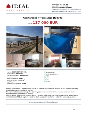 telefon 0034 603 390 766 telefon 0034 616 954 502 telefon biuro 0034 865 68 79 45 [email protected] www.nieruchomosci-hiszpania.com Apartament w Torrevieja (ID8709) cena: region: COSTA BLANCA PLD. miejscowość: Torrevieja typ nieruchomości: Apartament rynek: wtórny pow. użytkowa: 0.00 m2 pow. konstrukcji: 55.00 m2 sypialnie: 2 odległość od morza: 0.50 km 137 000 EUR umeblowanie kuchnia oddzielna AGD balkon taras basen Piękny apartament z widokiem na morze na terenie osiedla Rocio del Mar (Punta Prima). Położony jest zaledwie 150 metrów od morza. Nieruchomość sprzedawana jest w pełni wyposażona i umeblowana w nowoczesne urzadzenia i meble i obejmuje podziemny parking. Obiekt składa się z przestronnego salonu / jadalni , oddzielnej kuchni wyposażonej w nowoczesne meble i sprzet AGD, 2 sypialni i łazienki. Gotowe do zamieszkania i w bardzo atrakcyjnej cenie. www.nieruchomosci-hiszpania.com Side 1 / 1 Powered by TCPDF (www.tcpdf.org)