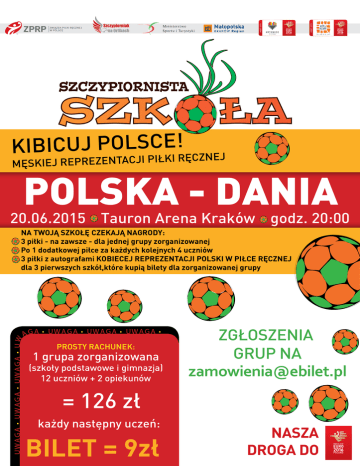 ! E C S L O P J KIBICU J E N Z C Ę R I K IŁ P I J C A T N E Z E R P E R J IE K S Ę M POLSKA - DANIA 20.06.2015 Tauron Arena Kraków godz. 20:00 UW A G A • UW A G A • UW A G A • U W NA TWOJĄ SZKOŁĘ CZEKAJĄ NAGRODY: 3 piłki - na zawsze - dla jednej grupy zorganizowanej Po 1 dodatkowej piłce za każdych kolejnych 4 uczniów 3 piłki z autografami KOBIECEJ REPREZENTACJI POLSKI W PIŁCE RĘCZNEJ dla 3 pierwszych szkół,które kupią bilety dla zorganizowanej grupy A G A • UW A G A • UW A G A • UW A G A • PROSTY RACHUNEK: 1 grupa zorganizowana (szkoły podstawowe i gimnazja) 12 uczniów + 2 opiekunów ZGŁOSZENIA GRUP NA [email protected] = 126 zł każdy następny uczeń: BILET = 9zł NASZA DROGA DO