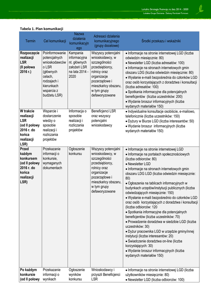 ` Tabela 1. Plan komunikacji Nazwa działania Termin Cel komunikacji komunikacyjn ego Rozpoczęcie Poinformowanie Kampania realizacji potencjalnych informacyjna LSR wnioskodawców nt. głównych (II połowa o LSR założeń LSR 2016 r.) (głównych na lata 2014 celach, 2020 rodzajach i kierunkach wsparcia z budżetu LSR) W trakcie realizacji LSR (od II połowy 2016 r. do końca realizacji LSR) Przed każdym konkursem (od II połowy 2016 r. do końca realizacji LSR) Adresaci działania komunikacyjnego (grupy docelowe) Wszyscy potencjalni wnioskodawcy, w szczególności przedsiębiorcy, rolnicy oraz organizacje pozarządowe i mieszkańcy obszaru, w tym grupy defaworyzowane Środki przekazu i wskaźniki Informacje na stronie internetowej LGD (liczba odwiedzin miesięcznie: 80) Newsletter LGD (liczba adresatów: 100) Informacje na stronach internetowych gmin obszaru LDG (liczba odwiedzin miesięcznie: 80) Wysłanie e-maili bezpośrednia do członków LGD oraz osób korzystających z doradztwa i konsultacji (liczba adresatów: 100) Spotkania informacyjne dla potencjalnych beneficjentów (liczba uczestników: 200) Wydanie broszur informacyjnych (liczba wydanych materiałów 150) Indywidualne konsultacje osobiście, e-mailowo, telefonicznie (liczba uczestników: 150) Dyżury w Biurze LGD (liczba interesantów: 50) Wydanie broszur informacyjnych (liczba wydanych materiałów 150) Wsparcie i dostarczenie wiedzy o sposobie realizacji i rozliczania projektów Informacja o sposobie realizacji i rozliczania projektów Beneficjenci LSR oraz wszyscy potencjalni wnioskodawcy Przekazanie informacji o konkursie, wymaganych dokumentach Ogłoszenie konkursu Wszyscy potencjalni wnioskodawcy, w szczególności przedsiębiorcy, rolnicy oraz organizacje pozarządowe i mieszkańcy obszaru, w tym grupy defaworyzowane Informacje na stronie internetowej LGD Informacje na portalach społecznościowych (liczba odbiorców: 80) Newsletter LGD Informacje na stronach internetowych gmin obszaru LDG LGD (liczba odwiedzin miesięcznie: 80) Ogłoszenia na tablicach informacyjnych w budynkach urzędów/instytucji publicznych (liczba odwiedzających miesięcznie: 150) Wysłanie e-maili bezpośrednio do członków LGD oraz osób korzystających z doradztwa i konsultacji (liczba odbiorców: 120 Spotkania informacyjne dla potencjalnych beneficjentów (liczba uczestników: 70) Prowadzenie doradztwa w siedzibie LGD (liczba uczestników: 30) Dyżur pracownika LGD w urzędzie gminy/innej instytucji (liczba interesantów: 20) Świadczenie doradztwa on-line (liczba korzystających: 30) Wydanie broszur informacyjnych (liczba wydanych materiałów 150) Ogłoszenie wyników konkursu Wnioskodawcy i przyszli Beneficjenci LSR Informacje na stronie internetowej LGD (liczba użytkowników miesięcznie: 80) Newsletter LGD (liczba odbiorców: 100) Po każdym Przekazanie konkursie informacji o (od II połowy wynikach ` 2016 r. do końca realizacji LSR) konkursu Informacje na stronach internetowych gmin obszaru LGD (liczba odwiedzin miesięcznie: 80) Wysłanie e-maili bezpośrednio do członków LGD oraz osób korzystających z doradztwa i konsultacji (liczba adresatów: 120) Raz w roku (w I kwartale roku od 2017 r. do końca realizacji LSR) Podsumowanie Podsumowani Wszyscy potencjalni zrealizowanych i e roczne LSR wnioskodawcy, w przedstawienie szczególności planowanych przedsiębiorcy, działań rolnicy oraz organizacje pozarządowe i mieszkańcy obszaru, Beneficjenci LSR W razie wystąpienia dodatkowej konieczności Przekazanie informacji o ewentualnych zmianach w LSR Informacje na stronie internetowej LGD (liczba odwiedzin miesięcznie: 80) Newsletter LGD (liczba odbiorców: 100) Informacje na stronach internetowych gmin obszaru LGD (liczba odwiedzin miesięcznie: 80) Wysłanie e-maili bezpośrednio do członków LGD oraz osób korzystających z doradztwa i konsultacji (liczba adresatów: 120) Spotkania informacyjne (liczba uczestników: 70) Wydanie broszur informacyjnych (liczba wydanych materiałów 150) Informacje na stronie internetowej LGD liczba odwiedzin miesięcznie: 80) Newsletter LGD (liczba odbiorców: 100) Informacje na stronach internetowych gmin obszaru LDG liczba odwiedzin miesięcznie: 80) Wysłanie e-maili bezpośrednio do członków LGD oraz osób korzystających z doradztwa i konsultacji (liczba adresatów: 120) Spotkania informacyjne (liczba uczestników: 60) Wydanie broszur informacyjnych (liczba wydanych materiałów 150) Informacje na stronie internetowej LGD liczba odwiedzin miesięcznie: 80) Newsletter LGD (liczba adresatów: 100) Informacje na stronach internetowych gmin obszaru LDG liczba odwiedzin miesięcznie: 80 Wysłanie e-maili bezpośrednio do członków LGD oraz osób korzystających z doradztwa i konsultacji (liczba adresatów: 120) Spotkania informacyjne (liczba uczestników: 100) Koniec realizacji LSR (I kwartał 2023 r.) Aktualizacja LSR i/lub dokumentów związanych z naborem Wszyscy potencjalni wnioskodawcy, w szczególności przedsiębiorcy, rolnicy oraz organizacje pozarządowe i mieszkańcy obszaru, Beneficjenci LSR Końcowe Podsumowani Wszyscy potencjalni podsumowanie e końcowe wnioskodawcy realizacji LSR, LSR kolejnych LSR, w analiza i szczególności przedyskutowani przedsiębiorcy, e efektów rolnicy oraz organizacje pozarządowe i mieszkańcy obszaru, Beneficjenci LSR Źródło: wskaźniki, cykliczne badania „Europejski Fundusz Rolny na rzecz Rozwoju Obszarów Wiejskich: Europa inwestująca w obszary wiejskie”. Instytucja Zarządzająca PROW 2014-2020 – Minister Rolnictwa i Rozwoju Wsi. Opracowanie strategii rozwoju lokalnego kierowanego przez społeczność na lata 2016-2022 (LSR) przez Stowarzyszenie- Zielony Pierścień Tarnowa współfinansowane jest ze środków Unii Europejskiej w ramach działania 19 Wsparcie dla Rozwoju Lokalnego w ramach inicjatywy Leader, poddziałanie 19.1 Wsparcie przygotowawcze Programu Rozwoju Obszarów Wiejskich na lata 2014-2020”