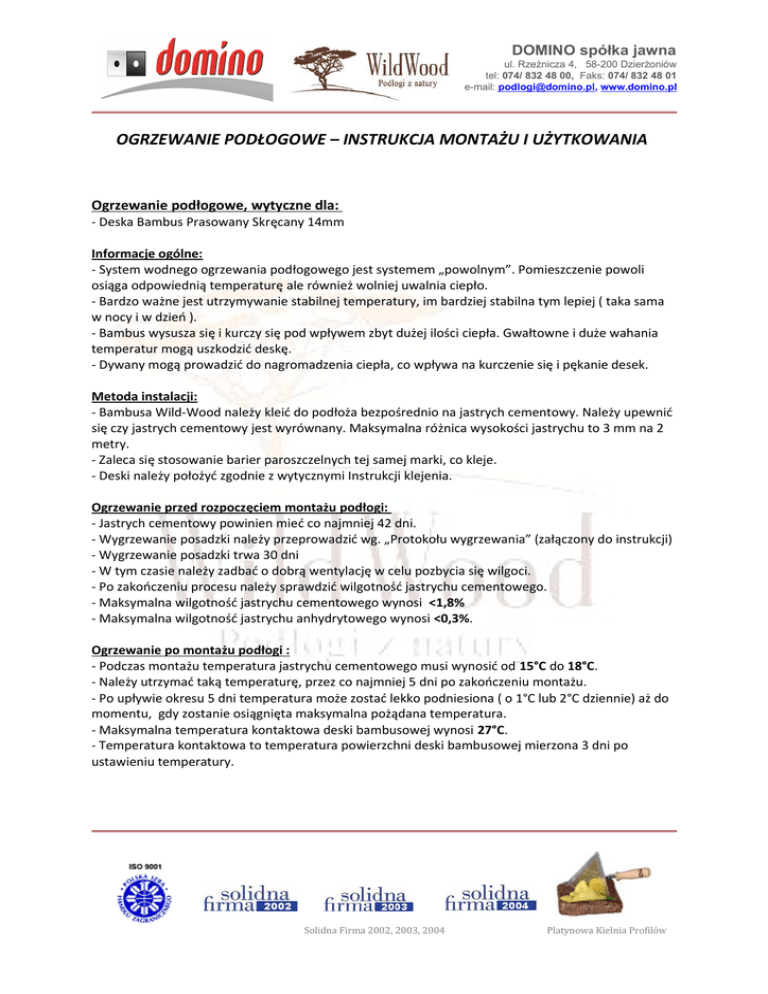 DOMINO spółka jawna ul. Rzeźnicza 4, 58-200 Dzierżoniów tel: 074/ 832 48 00, Faks: 074/ 832 48 01 e-mail: [email protected], www.domino.pl OGRZEWANIE PODŁOGOWE – INSTRUKCJA MONTAŻU I UŻYTKOWANIA Ogrzewanie podłogowe, wytyczne dla: - Deska Bambus Prasowany Skręcany 14mm Informacje ogólne: - System wodnego ogrzewania podłogowego jest systemem „powolnym”. Pomieszczenie powoli osiąga odpowiednią temperaturę ale również wolniej uwalnia ciepło. - Bardzo ważne jest utrzymywanie stabilnej temperatury, im bardziej stabilna tym lepiej ( taka sama w nocy i w dzień ). - Bambus wysusza się i kurczy się pod wpływem zbyt dużej ilości ciepła. Gwałtowne i duże wahania temperatur mogą uszkodzić deskę. - Dywany mogą prowadzić do nagromadzenia ciepła, co wpływa na kurczenie się i pękanie desek. Metoda instalacji: - Bambusa Wild-Wood należy kleić do podłoża bezpośrednio na jastrych cementowy. Należy upewnić się czy jastrych cementowy jest wyrównany. Maksymalna różnica wysokości jastrychu to 3 mm na 2 metry. - Zaleca się stosowanie barier paroszczelnych tej samej marki, co kleje. - Deski należy położyć zgodnie z wytycznymi Instrukcji klejenia. Ogrzewanie przed rozpoczęciem montażu podłogi: - Jastrych cementowy powinien mieć co najmniej 42 dni. - Wygrzewanie posadzki należy przeprowadzić wg. „Protokołu wygrzewania” (załączony do instrukcji) - Wygrzewanie posadzki trwa 30 dni - W tym czasie należy zadbać o dobrą wentylację w celu pozbycia się wilgoci. - Po zakończeniu procesu należy sprawdzić wilgotność jastrychu cementowego. - Maksymalna wilgotność jastrychu cementowego wynosi <1,8% - Maksymalna wilgotność jastrychu anhydrytowego wynosi <0,3%. Ogrzewanie po montażu podłogi : - Podczas montażu temperatura jastrychu cementowego musi wynosić od 15°C do 18°C. - Należy utrzymać taką temperaturę, przez co najmniej 5 dni po zakończeniu montażu. - Po upływie okresu 5 dni temperatura może zostać lekko podniesiona ( o 1°C lub 2°C dziennie) aż do momentu, gdy zostanie osiągnięta maksymalna pożądana temperatura. - Maksymalna temperatura kontaktowa deski bambusowej wynosi 27°C. - Temperatura kontaktowa to temperatura powierzchni deski bambusowej mierzona 3 dni po ustawieniu temperatury. Solidna Firma 2002, 2003, 2004 Platynowa Kielnia Profilów DOMINO spółka jawna ul. Rzeźnicza 4, 58-200 Dzierżoniów tel: 074/ 832 48 00, Faks: 074/ 832 48 01 e-mail: [email protected], www.domino.pl OGRZEWANIE PODŁOGOWE – INSTRUKCJA MONTAŻU I UŻYTKOWANIA Ogrzewanie podczas sezonu grzewczego: - Na początku sezonu grzewczego należy podnosić temperaturę stopniowo max o 1 lub 2°C dziennie. - Maksymalna temperatura użytkowa mierzona przy powierzchni deski nie może przekraczać 27°C. - Niezależnie od systemu grzewczego przez cały rok w pomieszczeniu musi być utrzymana wilgotność względna między 45% - 60% - Na koniec sezonu grzewczego należy obniżać temperaturę stopniowo max o 1 lub 2°C dziennie. - W celu utrzymania podłogi na stabilnym poziomie nie należy stwarzać różnic temperatur w ciągu dnia i nocy. Wartości techniczne: - Przewodnoś cieplna deski bambus prasowany skręcany 14mm - λ = 0.25 W/mK Protokół wygrzewania posadzki z ogrzewaniem podłogowym Solidna Firma 2002, 2003, 2004 Platynowa Kielnia Profilów DOMINO spółka jawna ul. Rzeźnicza 4, 58-200 Dzierżoniów tel: 074/ 832 48 00, Faks: 074/ 832 48 01 e-mail: [email protected], www.domino.pl Inwestor: ......................................................................................................................... Obiekt (dom jednorodzinny,mieszkanie, inne): ......................................................................................................................... Adres: ......................................................................................................................... Pomieszczenie (dotyczy jednego pomieszczenia): ........................................................................................................................ Typ ogrzewania (wodne, inne): ......................................................................................................................... Rodzaj jastrychu: ........................................................................................................................ Data wykonania jastrychu: ........................................................................................................................ Data rozpoczęcia procesuwygrzewania: ......................................................................................................................... DZIEŃ TEMPERATURA SYSTEMU PODPIS UWAGI 1. 2. 3. 4. system rozgrzano do temp. +20°C 5- 15 16. 17. 18. system pracuje z maksymalną temperaturą system rozgrzano do temp. +30°C system rozgrzano do temp. +40°C system rozgrzano do temp. +50°C lub maksymalna temperatura temp. systemu obniżono do +40°C temp. systemu obniżono do +30°C temp. systemu obniżono do +20°C 19. Pomiar wilgotności podłoża (metoda CM ) 19-23 system wyłączony 24. system rozgrzano do temp. +20°C 25. system rozgrzano do temp. +30°C 26. system rozgrzano do temp. +40°C 27. system rozgrzano do temp. +50°C lub maksymalna temperatura 28. 29. 30. temp. systemu obniżono do +40°C temp. systemuobniżono do +30°C temp. systemu obniżono do +20°C Wykonawca: ........................................................... (data orazczytelny podpis) Kierownik budowy: Inwestor: ………………………………………….…… ....……………………………………..… (data orazczytelny podpis) (data orazczytelny podpis) Firma Domino – Wild - Wood sp. j. nie ponosii odpowiedzialności za montaż wykonany niezgodnie z wytycznymi zawartymi w Instrukcji montażu dołączonej do produktu oraz z obowiązującymi normami. Solidna Firma 2002, 2003, 2004 Platynowa Kielnia Profilów