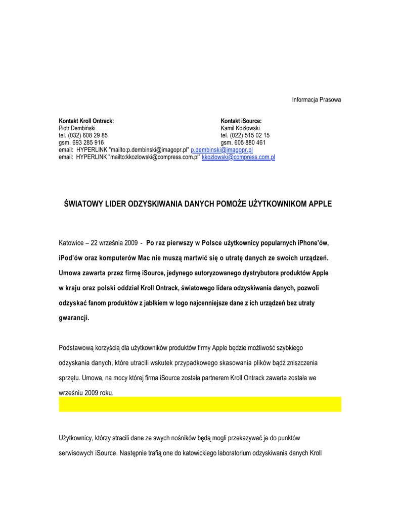Informacja Prasowa Kontakt Kroll Ontrack: Kontakt iSource: Piotr Dembiński Kamil Kozłowski tel. (032) 608 29 85 tel. (022) 515 02 15 gsm. 693 285 916 gsm. 605 880 461 email: HYPERLINK "mailto:[email protected]" [email protected] email: HYPERLINK "mailto:[email protected]" [email protected] ŚWIATOWY LIDER ODZYSKIWANIA DANYCH POMOŻE UŻYTKOWNIKOM APPLE Katowice – 22 września 2009 - Po raz pierwszy w Polsce użytkownicy popularnych iPhone’ów, iPod’ów oraz komputerów Mac nie muszą martwić się o utratę danych ze swoich urządzeń. Umowa zawarta przez firmę iSource, jedynego autoryzowanego dystrybutora produktów Apple w kraju oraz polski oddział Kroll Ontrack, światowego lidera odzyskiwania danych, pozwoli odzyskać fanom produktów z jabłkiem w logo najcenniejsze dane z ich urządzeń bez utraty gwarancji. Podstawową korzyścią dla użytkowników produktów firmy Apple będzie możliwość szybkiego odzyskania danych, które utracili wskutek przypadkowego skasowania plików bądź zniszczenia sprzętu. Umowa, na mocy której firma iSource została partnerem Kroll Ontrack zawarta została we wrześniu 2009 roku. Użytkownicy, którzy stracili dane ze swych nośników będą mogli przekazywać je do punktów serwisowych iSource. Następnie trafią one do katowickiego laboratorium odzyskiwania danych Kroll Ontrack, które jest najbardziej zaawansowaną technologicznie komórką tego typu na terenie Europy Środkowo – Wschodniej. - Podpisanie umowy o współpracy z firmą iSource to przede wszystkim korzyści dla tych fanów marki Apple, którzy pragną, by ich najważniejsze dane zostały odzyskane szybko, w sposób profesjonalny i bez utraty gwarancji. Dotyczy to zarówno użytkowników prywatnych, jak i firm, które coraz częściej decydują się na korzystanie z komputerów Mac. Co ważne, w przypadku podjęcia decyzji o odzyskaniu danych, ekspertyza nośnika wykonana przez naszych specjalistów będzie bezpłatna – mówi Marek Suczyk, dyrektor zarządzający polskiego oddziału Kroll Ontrack. - Cieszymy się ze współpracy z Kroll Ontrack, ponieważ dzięki 20-letniemu doświadczeniu, zdobył on pozycję niekwestionowanego lidera branży odzyskiwania danych i analizy dowodów elektronicznych. Dzięki partnerstwu, iSource rozwinie swoją ofertę serwisową bazując na rozległej wiedzy, narzędziach oraz najnowszych dostępnych technologiach – mówi janusz Borodziński, Dyrektor ds. Techniki w firmie iSource. Podpisana przez firmy umowa pozwoli ponadto na zakup programów Kroll Ontrack przeznaczonych m.in. do odzyskiwania danych utraconych przy kasowaniu danych, formatowaniu lub awarii systemu (program EasyRecovery) bezpośrednio w punktach serwisowych iSource. *** Informacje o firmie Kroll Ontrack sp. z o.o., polskim oddziale firmy Kroll Ontrack Inc.: Kroll Ontrack sp. z o.o.( HYPERLINK "http://www.krollontrack.pl" www.krollontrack.pl) jest polskim oddziałem Kroll Ontrack Inc. – wiodącego na świecie dostawcy usług odzyskiwania danych oraz informatyki śledczej (ang. computer forensics). Firma dysponuje największym i najbardziej zaawansowanym technologicznie w Europie Środkowej i Wschodniej laboratorium odzyskiwania danych i informatyki śledczej. W strukturach Kroll Ontrack sp. z o.o. działa również największe poza Stanami Zjednoczonymi centrum rozwoju oprogramowania Kroll Ontrack. Informacje o firmie Kroll Ontrack Inc.: Kroll Ontrack dostarcza usługi i oprogramowanie bazujące na najnowszych technologiach. Klientami firmy są jednostki prawne, klienci korporacyjni, jednostki administracji państwowej, a także klienci indywidualni. Kroll Ontrack jest dostawcą usług w zakresie odzyskiwania danych, zaawansowanego wyszukiwania danych, papierowego i elektronicznego odnajdywania danych, informatyki śledczej, konsultingu w zakresie informacji posiadanych w formie elektronicznej oraz konsultingu sądowego. Kroll Ontrack jest technologicznym działem Kroll Inc., globalnej firmy konsultingowej zajmującej się zarządzaniem ryzykiem. By uzyskać więcej informacji o Kroll Ontrack zapraszamy do odwiedzenia stron: HYPERLINK "http://www.krollontrack.com" www.krollontrack.com; HYPERLINK "http:// www.ontrackdatarecovery.com" www.ontrackdatarecovery.com; HYPERLINK "http:// www.engeniumsearch.com" www.engeniumsearch.com; HYPERLINK "http:// www.trialgraphix.com" www.trialgraphix.com. iSource jest wyłącznym dystrybutorem produktów firmy Apple w Polsce. W ofercie spółki znajdują się rozwiązania z dziedziny rozrywki i multimediów adresowane do użytkowników indywidualnych oraz osób i firm, które profesjonalnie lub półprofesjonalnie zajmują się projektowaniem i tworzeniem treści multimedialnych. iSource dostarcza także rozwiązania dla małych i średnich firm oraz profesjonalne systemy dla korporacji. Obok produktów Apple, portolio iSource obejmuje również marki komplementarne, takie jak: Quark, FileMaker, Parallels, Belkin, ExtremeMac, Gear4, Migilia, Elgato, Lacie, oraz MacAlly. Głównym akcjonariuszem spółki jest fundusz typu private equity AKJ Investment I Fundusz Inwestycyjny Zamknięty zarządzany przez AKJ Investment TFI S.A.