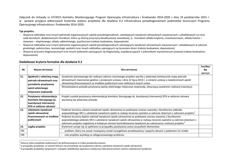 Załącznik do Uchwały nr 47/2015 Komitetu Monitorującego Program Operacyjny Infrastruktura i Środowisko 2014‐2020 z dnia 19 października 2015 r. w sprawie przyjęcia sektorowych kryteriów wyboru projektów dla działania 9.2 Infrastruktura ponadregionalnych podmiotów leczniczych Programu Operacyjnego Infrastruktura i Środowisko 2014-2020. Typ projektu: Wsparcie oddziałów oraz innych jednostek organizacyjnych szpitali ponadregionalnych, udzielających świadczeń zdrowotnych stacjonarnych i całodobowych na rzecz osób dorosłych, dedykowanych chorobom, które są istotną przyczyną dezaktywizacji zawodowej, tj. chorobom układu krążenia, nowotworowym, układu kostno – stawowo – mięśniowego, układu oddechowego, psychicznym (roboty budowlane, doposażenie) Wsparcie oddziałów oraz innych jednostek organizacyjnych szpitali ponadregionalnych udzielających świadczeń zdrowotnych stacjonarnych i całodobowych w zakresie ginekologii, położnictwa, neonatologii, pediatrii oraz innych oddziałów zajmujących się leczeniem dzieci (roboty budowlane, doposażenie) Wsparcie pracowni diagnostycznych oraz innych jednostek zajmujących się diagnostyką, współpracujących z jednostkami wymienionymi powyżej (roboty budowlane, doposażenie) Dodatkowe kryteria formalne dla działania 9.2 NR NAZWA KRYTERIUM OPIS KRYTERIUM TAK/NIE/ NIE DOTYCZY 11. Zgodność z właściwą mapą potrzeb zdrowotnych oraz posiadanie pozytywnej opinii właściwego miejscowo wojewody Zasadność planowanego do realizacji zakresu rzeczowego projektu wynika z właściwej tematycznie mapy potrzeb zdrowotnych stworzonej zgodnie z przepisami ustawy z dnia 22 lipca 2014 r. o zmianie ustawy o świadczeniach opieki zdrowotnej finansowanych ze środków publicznych oraz niektórych innych ustaw Wnioskodawca posiada pozytywną opinię właściwego miejscowo wojewody, dotyczącą zasadności realizacji inwestycji. 12. Pozytywna rekomendacja Komitetu Sterującego ds. koordynacji interwencji EFSI w sektorze zdrowia1 Udzielanie świadczeń opieki zdrowotnej finansowanych ze środków publicznych Projekt uzyskał pozytywną rekomendację Komitetu Sterującego ds. koordynacji interwencji EFSI w sektorze zdrowia wyrażoną we właściwej uchwale 13. 14. 14a 14b 1 Logika projektu Podmiot leczniczy udziela świadczeń opieki zdrowotnej na podstawie umowy zawartej z Dyrektorem oddziału 2 wojewódzkiego NFZ o udzielanie świadczeń opieki w rodzaju leczenie szpitalne w zakresie zbieżnym z zakresem projektu Podmiot leczniczy będzie udzielał świadczeń opieki zdrowotnej na podstawie umowy zawartej z Dyrektorem wojewódzkiego oddziału NFZ o udzielanie świadczeń opieki zdrowotnej w rodzaju leczenie szpitalne w zakresie zbieżnym z 3 zakresem projektu najpóźniej w kolejnym okresie kontraktowania świadczeń po zakończeniu realizacji projektu Kryterium uznaje się za spełnione w przypadku pozytywnej oceny wszystkich elementów: problem, który ma zostać rozwiązany został szczegółowo przedstawiony i poparty danymi z podaniem ich źródła cele projektu wynikają ze zdiagnozowanego problemu Dotyczy tylko projektów wybieranych do dofinansowania w trybie pozakonkursowym. w przypadku projektów, w ramach których nie przewiduje się zwiększenia zakresu udzielania świadczeń opieki zdrowotnej 3 w przypadku projektów związanych z zakupem dodatkowej aparatury medycznej i/lub poszerzaniem zakresu udzielanych świadczeń 2 14c działania zaplanowane w ramach projektu wynikają z celów projektu i zostały przedstawione w sposób klarowny i szczegółowy 14d harmonogram realizacji projektu jest kompletny, przedstawiono w nim sekwencje poszczególnych działań, powiązania między nimi oraz wszystkie fazy projektu 14e 15. 15a Analiza ryzyka w projekcie zostało uwzględnione ryzyko w kluczowych obszarach 15b opisane zostały metody zarządzania ryzykiem w sposób klarowny i szczegółowy 15c 16. 16a 16b 4 5 przedstawiony został system zarządzania projektem uwzględniający przejrzysty podział zadań między poszczególnymi członkami zespołu projektowego Kryterium uznaje się za spełnione w przypadku pozytywnej oceny wszystkich elementów: Efektywność kosztowa projektu (racjonalność i efektywność wydatków projektu) 17. Adekwatność działań do potrzeb 18. Kadra medyczna do obsługi wyrobów 4 medycznych 19. Infrastruktura techniczna na potrzeby wyrobów 5 medycznych w projekcie przewidziano monitorowanie ryzyka oraz działania zaradcze Kryterium uznaje się za spełnione w przypadku pozytywnej oceny wszystkich elementów: wszystkie wydatki przedstawione w kosztorysie/kalkulacji kosztów są efektywne kosztowo, tj. uzasadnione i adekwatne z punktu widzenia zakresu i celów projektu wydatki są racjonalne, tzn. oparte na wiarygodnych źródłach, tj. - w zakresie robót budowlanych – kosztorys inwestorski oparty o aktualny cennik dostępny na rynku dotyczący cen w budownictwie -w zakresie usług lub dostaw - rozeznanie rynku, cennik lub inne - z przeprowadzonej analizy wariantów wynika, że rozwiązanie przyjęte do realizacji (wybrany wariant realizacji inwestycji) jest rozwiązaniem najlepszym biorąc pod uwagę aspekty: instytucjonalny, techniczny i środowiskowy, a także najbardziej uzasadnionym z punktu widzenia efektywności kosztowej Zaplanowane w ramach projektu działania, w tym w szczególności w zakresie zakupu wyrobów medycznych są uzasadnione z punktu widzenia rzeczywistego zapotrzebowania na dany produkt (wytworzona infrastruktura, w tym ilość, parametry wyrobu medycznego są adekwatne do zakresu udzielanych przez jednostkę świadczeń lub w przypadku poszerzania oferty medycznej, są adekwatne do deficytów świadczeń zdrowotnych) Wnioskodawca dysponuje lub najpóźniej w dniu zakończenia okresu kwalifikowalności wydatków określonego w umowie o dofinansowanie projektu będzie dysponował kadrą medyczną odpowiednio wykwalifikowaną do obsługi wyrobów medycznych objętyc