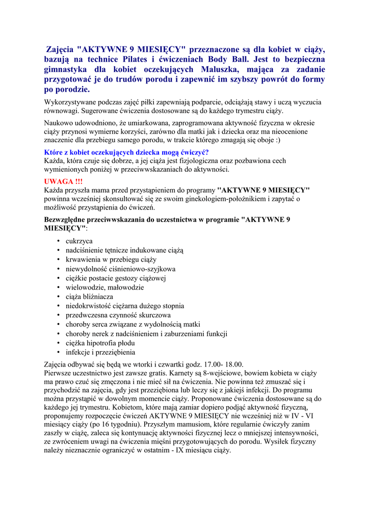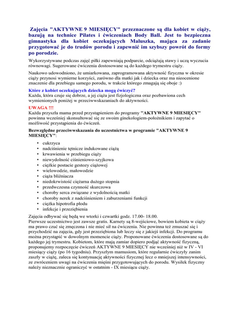 Zajęcia "AKTYWNE 9 MIESIĘCY" przeznaczone są dla kobiet w ciąży, bazują na technice Pilates i ćwiczeniach Body Ball. Jest to bezpieczna gimnastyka dla kobiet oczekujących Maluszka, mająca za zadanie przygotować je do trudów porodu i zapewnić im szybszy powrót do formy po porodzie. Wykorzystywane podczas zajęć piłki zapewniają podparcie, odciążają stawy i uczą wyczucia równowagi. Sugerowane ćwiczenia dostosowane są do każdego trymestru ciąży. Naukowo udowodniono, że umiarkowana, zaprogramowana aktywność fizyczna w okresie ciąży przynosi wymierne korzyści, zarówno dla matki jak i dziecka oraz ma nieocenione znaczenie dla przebiegu samego porodu, w trakcie którego zmagają się oboje :) Które z kobiet oczekujących dziecka mogą ćwiczyć? Każda, która czuje się dobrze, a jej ciąża jest fizjologiczna oraz pozbawiona cech wymienionych poniżej w przeciwwskazaniach do aktywności. UWAGA !!! Każda przyszła mama przed przystąpieniem do programy ''AKTYWNE 9 MIESIĘCY'' powinna wcześniej skonsultować się ze swoim ginekologiem-położnikiem i zapytać o możliwość przystąpienia do ćwiczeń. Bezwzględne przeciwwskazania do uczestnictwa w programie "AKTYWNE 9 MIESIĘCY": • • • • • • • • • • • • • cukrzyca nadciśnienie tętnicze indukowane ciążą krwawienia w przebiegu ciąży niewydolność ciśnieniowo-szyjkowa ciężkie postacie gestozy ciążowej wielowodzie, małowodzie ciąża bliźniacza niedokrwistość ciężarna dużego stopnia przedwczesna czynność skurczowa choroby serca związane z wydolnością matki choroby nerek z nadciśnieniem i zaburzeniami funkcji ciężka hipotrofia płodu infekcje i przeziębienia Zajęcia odbywać się będą we wtorki i czwartki godz. 17.00- 18.00. Pierwsze uczestnictwo jest zawsze gratis. Karnety są 8-wejściowe, bowiem kobieta w ciąży ma prawo czuć się zmęczona i nie mieć sił na ćwiczenia. Nie powinna też zmuszać się i przychodzić na zajęcia, gdy jest przeziębiona lub leczy się z jakiejś infekcji. Do programu można przystąpić w dowolnym momencie ciąży. Proponowane ćwiczenia dostosowane są do każdego jej trymestru. Kobietom, które mają zamiar dopiero podjąć aktywność fizyczną, proponujemy rozpoczęcie ćwiczeń AKTYWNE 9 MIESIĘCY nie wcześniej niż w IV - VI miesiący ciąży (po 16 tygodniu). Przyszłym mamusiom, które regularnie ćwiczyły zanim zaszły w ciążę, zaleca się kontynuację aktywności fizycznej lecz o mniejszej intensywności, ze zwróceniem uwagi na ćwiczenia mięśni przygotowujących do porodu. Wysiłek fizyczny należy nieznacznie ograniczyć w ostatnim - IX miesiącu ciąży. Każda kobieta w ciąży na pewno nie powinna jeść za dwoje, a dla dwojga! za to z pewnością zobowiązana jest dbać o kondycję i siłę swoją oraz roznącego w jej brzuszku Maluszka.