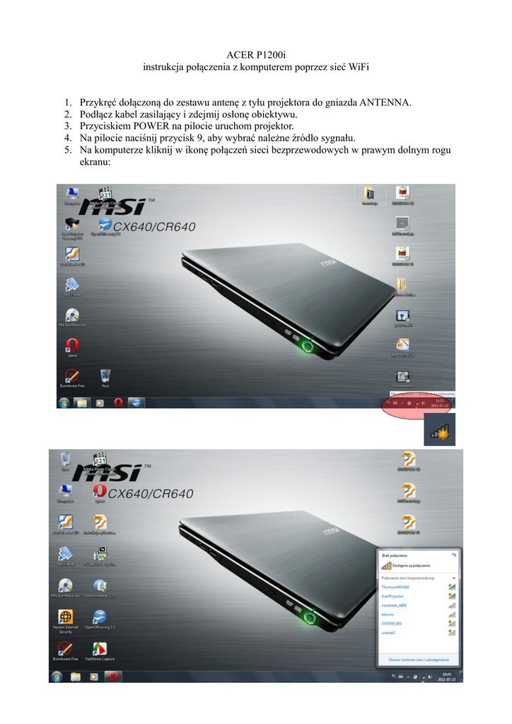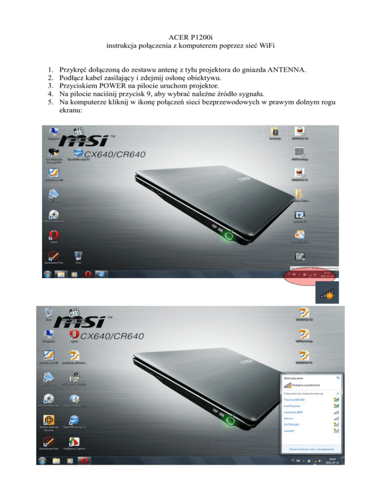 ACER P1200i instrukcja połączenia z komputerem poprzez sieć WiFi 1. 2. 3. 4. 5. Przykręć dołączoną do zestawu antenę z tyłu projektora do gniazda ANTENNA. Podłącz kabel zasilający i zdejmij osłonę obiektywu. Przyciskiem POWER na pilocie uruchom projektor. Na pilocie naciśnij przycisk 9, aby wybrać należne źródło sygnału. Na komputerze kliknij w ikonę połączeń sieci bezprzewodowych w prawym dolnym rogu ekranu: 5. W oknie które się pokaże wybierz pozycję AcerProjector: 6. Kliknij w Połącz: 7. Na pulpicie komputera otwórz program Acer Projector Gateway W5: 8. Wyświetli się okno: 9. Następnie automatycznie pokażą się dwa monity, które potwierdź przyciskiem OK bez wprowadzania żadnych zmian: 10. Zestaw jest gotowy do użytku i projektor wyświetla obraz z monitora. 11. Aby zakończyć pracę z projektorem naciśnij na pilocie dwukrotnie przycisk POWER, a na komputerze zamknij program Acer eProjection Management: NIE ODŁĄCZAJ ZASILANIA OD PROJEKTORA, DOPÓKI NIE WYŁĄCZY SIĘ JEGO WENTYLATOR I CZERWONA KONTROLKA NA NIM NIE PRZESTANIE MRUGAĆ! Szczegółowe instrukcje obsługi projektora i komputera zawarte są w osobnych plikach.