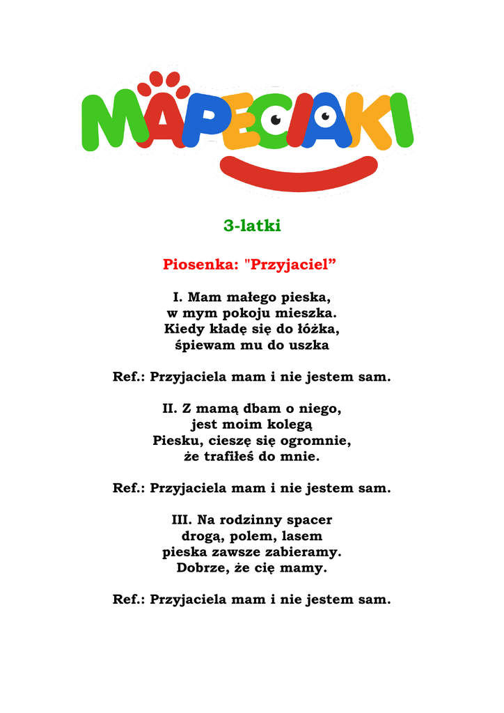 3-latki Piosenka: "Przyjaciel” I. Mam małego pieska, w mym pokoju mieszka. Kiedy kładę się do łóżka, śpiewam mu do uszka Ref.: Przyjaciela mam i nie jestem sam. II. Z mamą dbam o niego, jest moim kolegą Piesku, cieszę się ogromnie, że trafiłeś do mnie. Ref.: Przyjaciela mam i nie jestem sam. III. Na rodzinny spacer drogą, polem, lasem pieska zawsze zabieramy. Dobrze, że cię mamy. Ref.: Przyjaciela mam i nie jestem sam.