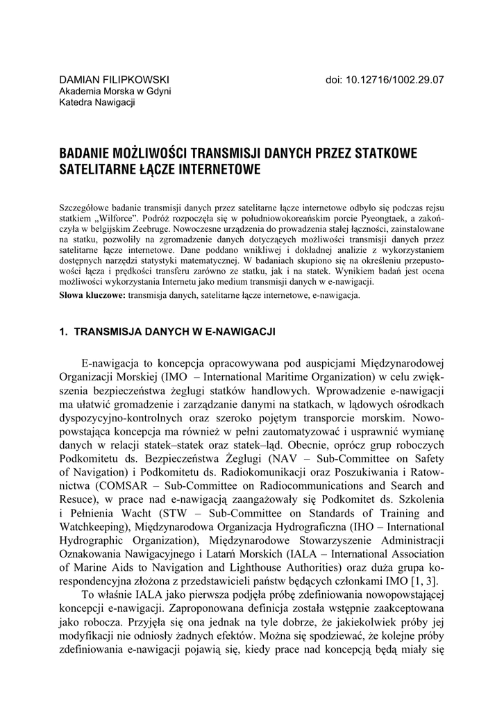 DAMIAN FILIPKOWSKI doi: 10.12716/1002.29.07 Akademia Morska w Gdyni Katedra Nawigacji BADANIE MOŻLIWOŚCI TRANSMISJI DANYCH PRZEZ STATKOWE SATELITARNE ŁĄCZE INTERNETOWE Szczegółowe badanie transmisji danych przez satelitarne łącze internetowe odbyło się podczas rejsu statkiem „Wilforce”. Podróż rozpoczęła się w południowokoreańskim porcie Pyeongtaek, a zakończyła w belgijskim Zeebruge. Nowoczesne urządzenia do prowadzenia stałej łączności, zainstalowane na statku, pozwoliły na zgromadzenie danych dotyczących możliwości transmisji danych przez satelitarne łącze internetowe. Dane poddano wnikliwej i dokładnej analizie z wykorzystaniem dostępnych narzędzi statystyki matematycznej. W badaniach skupiono się na określeniu przepustowości łącza i prędkości transferu zarówno ze statku, jak i na statek. Wynikiem badań jest ocena możliwości wykorzystania Internetu jako medium transmisji danych w e-nawigacji. Słowa kluczowe: transmisja danych, satelitarne łącze internetowe, e-nawigacja. 1. TRANSMISJA DANYCH W E-NAWIGACJI E-nawigacja to koncepcja opracowywana pod auspicjami Międzynarodowej Organizacji Morskiej (IMO – International Maritime Organization) w celu zwiększenia bezpieczeństwa żeglugi statków handlowych. Wprowadzenie e-nawigacji ma ułatwić gromadzenie i zarządzanie danymi na statkach, w lądowych ośrodkach dyspozycyjno-kontrolnych oraz szeroko pojętym transporcie morskim. Nowopowstająca koncepcja ma również w pełni zautomatyzować i usprawnić wymianę danych w relacji statek–statek oraz statek–ląd. Obecnie, oprócz grup roboczych Podkomitetu ds. Bezpieczeństwa Żeglugi (NAV – Sub-Committee on Safety of Navigation) i Podkomitetu ds. Radiokomunikacji oraz Poszukiwania i Ratownictwa (COMSAR – Sub-Committee on Radiocommunications and Search and Resuce), w prace nad e-nawigacją zaangażowały się Podkomitet ds. Szkolenia i Pełnienia Wacht (STW – Sub-Committee on Standards of Training and Watchkeeping), Międzynarodowa Organizacja Hydrograficzna (IHO – International Hydrographic Organization), Międzynarodowe Stowarzyszenie Administracji Oznakowania Nawigacyjnego i Latarń Morskich (IALA – International Association of Marine Aids to Navigation and Lighthouse Authorities) oraz duża grupa korespondencyjna złożona z przedstawicieli państw będących członkami IMO [1, 3]. To właśnie IALA jako pierwsza podjęła próbę zdefiniowania nowopowstającej koncepcji e-nawigacji. Zaproponowana definicja została wstępnie zaakceptowana jako robocza. Przyjęła się ona jednak na tyle dobrze, że jakiekolwiek próby jej modyfikacji nie odniosły żadnych efektów. Można się spodziewać, że kolejne próby zdefiniowania e-nawigacji pojawią się, kiedy prace nad koncepcją będą miały się D. Filipkowski, Badanie możliwości transmisji danych przez statkowe satelitarne łącze internetowe 69 ku końcowi lub kiedy e-nawigacja wejdzie w życie i nabierze bardziej realnych kształtów. Obecna definicja IALA wskazuje na procesy, jakim w e-nawigacji zostaną poddane informacje oraz cel ich wykorzystania. Należy podkreślić, że e-nawigacja jest wciąż bardziej strategią, lub ideą, o czym świadczy fakt, że w definicji nie wymienia się żadnych konkretnych urządzeń ani systemów [8, 13]. E-nawigacja jest to zharmonizowane tworzenie, gromadzenie, integracja, wymiana i prezentacja morskich informacji, przy użyciu środków elektronicznych na statku i na lądzie, w celu usprawnienia nawigacji od nabrzeża do nabrzeża i związanych z nią usług, zapewnienia bezpieczeństwa i ochrony na morzu oraz ochrony środowiska morskiego. Jak wynika z powyższej definicji, głównym zadaniem e-nawigacji jest gromadzenie i wymiana danych. Chcąc zapewnić efektywną realizację tego celu, należy przede wszystkim stworzyć odpowiednią strukturę telekomunikacyjną, zarówno na statkach, jak i na lądzie. Należy również wybrać bezpieczny i efektywny sposób transmisji danych, który zapewni odpowiednią jakość i prędkość transmisji. Wybór jest dość szeroki, biorąc pod uwagę liczbę systemów, które umożliwiają dostęp do Internetu. Uważa się, że Internet będzie głównym sposobem transmisji w e-nawigacji. Szybki rozwój tej technologii w ostatnich czasach i duża dostępność wszelkiego rodzaju usług telekomunikacyjnych oraz różnych rozwiązań programowych sprawiły, że Internet stał się środkiem łączności wydajnym, elastycznym i stosunkowo tanim [2, 4]. 2. STATKOWE SATELITARNE ŁĄCZE INTERNETOWE Wymiana danych pomiędzy stacją brzegową i statkiem oraz pomiędzy dwoma statkami stanowi w dzisiejszych czasach konieczność. Ze względu jednak na przestarzałe rozwiązania techniczne łączność w transporcie morskim jest wciąż stosunkowo skomplikowana i droga. Pierwsze satelitarne łącza internetowe powstały w jednym podstawowym celu – poprawy bezpieczeństwa statków i ich załóg. Przez ostatnie kilka lat technologia związana z transmisją danych przez Internet znacznie się rozwinęła. Równocześnie wzrosły wymagania dotyczące przesyłania danych między statkiem a lądem oraz między dwoma statkami. Po wprowadzeniu Internetu na statki handlowe okazało się, że usługi w tzw. technologii L-Band były najczęściej wykorzystywaną techniką łączności na pokładach statków na całym świecie. Niestety usługi te były bardzo drogie, ponieważ opłaty pobierane były wg taryfy za każdy wysłany lub odebrany megabajt danych. Kolejną możliwością dla armatorów była technologia VSAT, która początkowo była jeszcze droższa niż usługi L-Band. Powodem tego był wysoki koszt użycia technologii wymagającej dedykowanego pasma dla każdego użytkownika (SCPC – Single Channel Per Carrier). 70 PRACE WYDZIAŁU NAWIGACYJNEGO AKADEMII MORSKIEJ W GDYNI, nr 29, 2014 Technologia umożliwiająca czasowy podział dostępu do pasma (TDMA – Time Division Multiple Access) rozpocz