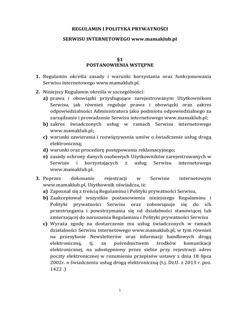 REGULAMIN I POLITYKA PRYWATNOŚCI SERWISU INTERNETOWEGO www.mamaklub.pl §1 POSTANOWIENIA WSTĘPNE 1. Regulamin określa zasady i warunki korzystania oraz funkcjonowania Serwisu internetowego www.mamaklub.pl. 2. Niniejszy Regulamin określa w szczególności: a) prawa i obowiązki przysługujące zarejestrowanym Użytkownikom Serwisu, jak również reguluje prawa i obowiązki oraz zakres odpowiedzialności Administratora jako podmiotu odpowiedzialnego za zarządzanie i prowadzenie Serwisu internetowego www.mamaklub.pl; b) zakres świadczonych usług w ramach Serwisu internetowego www.mamaklub.pl; c) warunki zawierania i rozwiązywania umów o świadczenie usług drogą elektroniczną; d) warunki oraz procedurę postępowania reklamacyjnego; e) zasady ochrony danych osobowych Użytkowników zarejestrowanych w Serwisie i korzystających z usług Serwisu internetowego www.mamaklub.pl. 3. Poprzez dokonanie rejestracji w Serwisie internetowym www.mamaklub.pl, Użytkownik oświadcza, iż: a) Zapoznał się z treścią Regulaminu i Polityki prywatności Serwisu, b) Zaakceptował wszystkie postanowienia niniejszego Regulaminu i Polityki prywatności Serwisu oraz zobowiązuje się do ich przestrzegania i powstrzymania się od działalności stanowiącej lub zmierzającej do naruszenia Regulaminu i Polityki prywatności Serwisu c) Wyraża zgodę na dostarczenie mu usług świadczonych w ramach działalności Serwisu internetowego www.mamaklub.pl, w tym również na przesyłanie Newsletterów oraz informacji handlowych drogą elektroniczną, tj. za pośrednictwem środków komunikacji elektronicznej, na udostępniony przez siebie przy rejestracji adres poczty elektronicznej w rozumieniu przepisów ustawy z dnia 18 lipca 2002r. o świadczeniu usług drogą elektroniczną (t.j. Dz.U. z 2013 r. poz. 1422 .) 1 d) Wyraża zgodę na przetwarzanie jego danych osobowych zgodnie z ustawą z dnia 29 sierpnia 1997 r. o ochronie danych osobowych (t.j. Dz.U. z 2014 r. poz. 1182) e) Został poinformowany o dobrowolności podania swoich danych oraz o przysługującym mu prawie dostępu do treści swoich danych, ich poprawiania oraz żądania ich usunięcia. 4. Oprogramowanie, nazwa Serwisu internetowego, jego koncepcja, układ funkcjonalny, szata oraz wygląd graficzny, a także baza danych stanowią przedmiot autorskich praw majątkowych lub/i innych praw przysługujących Present-‐Service Sp. z o.o. Sp. k. z siedzibą w Luboniu, ul. Armii Poznań 2, (62-‐030) Luboń wpisanej do Rejestru Przedsiębiorców Krajowego Rejestru Sądowego prowadzonego przez Sąd Rejonowy Poznań – Nowe Miasto Wilda w Poznaniu, Wydział VIII Gospodarczy Krajowego Rejestru Sadowego pod numerem KRS: 0000406574, NIP: 783-‐00-‐00-‐978, e-‐mail: [email protected] oraz podlegają ochronie prawnej. §2 DEFINICJE POJĘĆ UŻYTYCH W REGULAMINIE 1. Administrator – podmiot odpowiedzialny za zarządzanie i prowadzenie Serwisu internetowego www.mamaklub.pl, udostępniający jego zasoby Użytkownikom Serwisu, którym jest Present-‐Service Sp. z o.o. Sp. k. z siedzibą w Luboniu, ul. Armii Poznań 2, (62-‐030) Luboń wpisanej do Rejestru Przedsiębiorców Krajowego Rejestru Sądowego prowadzonego przez Sąd Rejonowy Poznań – Nowe Miasto Wilda w Poznaniu, Wydział VIII Gospodarczy Krajowego Rejestru Sadowego pod numerem KRS: 0000406574, NIP: 783-‐00-‐00-‐978, e-‐mail: [email protected]. 2. Regulamin – oznacza niniejszy Regulamin Serwisu internetowego określający zasady i warunki korzystania i funkcjonowania Serwisu internetowego www.mamaklub.pl, o których mowa w § 1 pkt. 1 – 2. 3. Serwis internetowy – oznacza rozbudowaną witrynę internetową składającą się z powiązanych ze sobą stron internetowych zawierających obrazy, pliki video lub inne pliki cyfrowe, dla których nośnikiem jest Internet, funkcjonujący pod udostępniany adresem internetowym www.mamaklub.pl. 2 4. Konto Użytkownika – zbiór zasobów i funkcji dostępnych dla Użytkownika po zarejestrowaniu się i po zalogowaniu w Serwisie internetowym oraz zbiór danych i ustawień Użytkownika, dostępnych po uprzednim zarejestrowaniu się i zalogowaniu do Serwisu internetowego. 5. Profil Użytkownika – zespół informacji, danych, obrazów, zdjęć, multimediów i innych elementów prezentujących i opisujących osobę danego Użytkownika, przekazywanych dobrowolnie i samodzielnie przez Użytkownika w procesie zakładania Konta oraz jego zarządzaniem przez zarejestrowanego Użytkownika. 6. Użytkownik – każda osoba fizyczna odwiedzająca Serwis internetowy, niekorzystająca z opcji rejestracji w Serwisie. 7. Użytkownik zarejestrowany – osoba fizyczna posiadająca pełną zdolność do czynności prawnych lub osoba fizyczna, która uzyska zgodę przedstawiciela ustawowego lub opiekuna prawnego w przypadku, gdy posiada ograniczoną zdolność do czynności prawnych , która założyła Konto Użytkownika w Serwisie internetowym, w wyniku przeprowadzonego procesu rejestracji. 8. Newsletter – wszelkie informacje przesyłane Użytkownikom zarejestrowanym, na udostępniony przez nich adres poczty elektronicznej, w tym również informacje handlowe w rozumieniu ustawy z dnia 18 lipca 2002r. o świadczeniu usług drogą elektroniczną 9. Netykieta -‐ zbiór zasad przyzwoitego zachowania się w Internecie, wynikających wprost z ogólnych zasad przyzwoitości. 10. Forum dyskusyjne – funkcja Serwisu w formie grupy dyskusyjnej, umożliwiająca wymianę informacji, spostrzeżeń i poglądów pomiędzy zarejestrowanymi Użytkownikami Serwisu. 11. Moduł Ekspert – funkcja serwisu zapewniająca Użytkownikom Zarejestrowanym komunikowanie się z ekspertami z danej dziedziny, poprzez m.in. zadawanie pytań, zasięganie opinii oraz porad. §3 REJESTRACJA W SERWISIE, WARUNKI UCZESTNICTWA W SERWISIE 3 1. Uczestnikami Serwisu są Użytkownicy, którzy założyli Konto Użytkownika w wyniku przeprowadzonego procesu rejestracji, którzy spełniają 