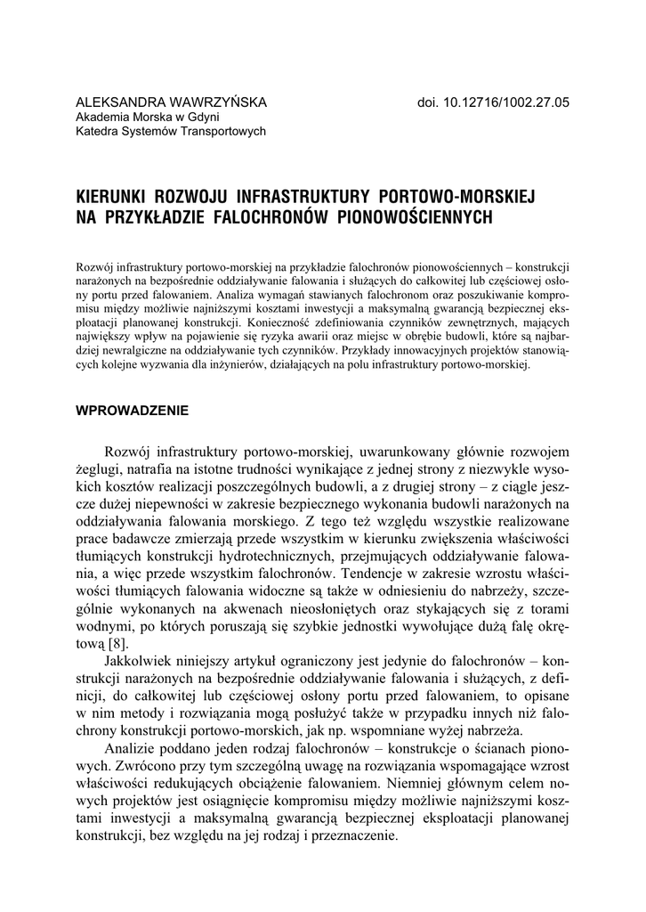 ALEKSANDRA WAWRZYŃSKA doi. 10.12716/1002.27.05 Akademia Morska w Gdyni Katedra Systemów Transportowych KIERUNKI ROZWOJU INFRASTRUKTURY PORTOWO-MORSKIEJ NA PRZYKŁADZIE FALOCHRONÓW PIONOWOŚCIENNYCH Rozwój infrastruktury portowo-morskiej na przykładzie falochronów pionowościennych – konstrukcji narażonych na bezpośrednie oddziaływanie falowania i służących do całkowitej lub częściowej osłony portu przed falowaniem. Analiza wymagań stawianych falochronom oraz poszukiwanie kompromisu między możliwie najniższymi kosztami inwestycji a maksymalną gwarancją bezpiecznej eksploatacji planowanej konstrukcji. Konieczność zdefiniowania czynników zewnętrznych, mających największy wpływ na pojawienie się ryzyka awarii oraz miejsc w obrębie budowli, które są najbardziej newralgiczne na oddziaływanie tych czynników. Przykłady innowacyjnych projektów stanowiących kolejne wyzwania dla inżynierów, działających na polu infrastruktury portowo-morskiej. WPROWADZENIE Rozwój infrastruktury portowo-morskiej, uwarunkowany głównie rozwojem żeglugi, natrafia na istotne trudności wynikające z jednej strony z niezwykle wysokich kosztów realizacji poszczególnych budowli, a z drugiej strony – z ciągle jeszcze dużej niepewności w zakresie bezpiecznego wykonania budowli narażonych na oddziaływania falowania morskiego. Z tego też względu wszystkie realizowane prace badawcze zmierzają przede wszystkim w kierunku zwiększenia właściwości tłumiących konstrukcji hydrotechnicznych, przejmujących oddziaływanie falowania, a więc przede wszystkim falochronów. Tendencje w zakresie wzrostu właściwości tłumiących falowania widoczne są także w odniesieniu do nabrzeży, szczególnie wykonanych na akwenach nieosłoniętych oraz stykających się z torami wodnymi, po których poruszają się szybkie jednostki wywołujące dużą falę okrętową [8]. Jakkolwiek niniejszy artykuł ograniczony jest jedynie do falochronów – konstrukcji narażonych na bezpośrednie oddziaływanie falowania i służących, z definicji, do całkowitej lub częściowej osłony portu przed falowaniem, to opisane w nim metody i rozwiązania mogą posłużyć także w przypadku innych niż falochrony konstrukcji portowo-morskich, jak np. wspomniane wyżej nabrzeża. Analizie poddano jeden rodzaj falochronów – konstrukcje o ścianach pionowych. Zwrócono przy tym szczególną uwagę na rozwiązania wspomagające wzrost właściwości redukujących obciążenie falowaniem. Niemniej głównym celem nowych projektów jest osiągnięcie kompromisu między możliwie najniższymi kosztami inwestycji a maksymalną gwarancją bezpiecznej eksploatacji planowanej konstrukcji, bez względu na jej rodzaj i przeznaczenie. A. Wawrzyńska, Kierunki rozwoju infrastruktury portowo-morskiej na przykładzie falochronów pionowościennych 63 Falochrony pionowościenne nie zawsze cieszyły się tak dużym zainteresowaniem, jak ma to miejsce w chwili obecnej. Liczne awarie klasycznych pionowościennych konstrukcji w latach 30. ubiegłego wieku spowodowały w zasadzie porzucenie projektowania tego typu konstrukcji na rzecz falochronów narzutowych. Ożywienie nastąpiło blisko pół wieku później, po serii katastrof dużych falochronów narzutowych, jakie miały miejsce na przełomie lat 70. i 80. XX wieku [12]. W ich następstwie inżynierowie podjęli szereg starań, aby wrócić do projektowania falochronów o ścianach stromych. Dziś zauważa się silny trend w konstruowaniu nowoczesnych falochronów pionowościennych, jednak wymagania stawiane na przestrzeni ostatnich lat tego typu konstrukcjom są zdecydowanie większe w porównaniu z rozwiązaniami klasycznymi. Przede wszystkim wzrasta liczba falochronów, które muszą przeciwstawiać się ostrym warunkom środowiskowym – z jednej strony są to konstrukcje budowane na głębokiej wodzie, gdzie poddawane są ostrym warunkom falowym, a z drugiej muszą być posadowione na gruntach słabych ze względu na konieczność poszukiwania nowych terenów dla eksploatacji portów, często na obszarze akwatorium. Dodatkowo wzrost popularności sportów wodnych powoduje, że falochrony są stosowane do wydzielenia bardzo szerokich osłoniętych obszarów i akwenów marin jachtowych. Stworzenie innowacyjnych projektów oraz próba lub nawet rzeczywista ich aplikacja wiążą się z koniecznością zdefiniowania czynników zewnętrznych, mających największy wpływ na pojawienie się ryzyka awarii oraz miejsc w obrębie budowli, które są najbardziej newralgiczne na oddziaływanie tych czynników. 1. REDUKCJA OBCIĄŻEŃ OD FALOWANIA NA ŚCIANIE FALOCHRONU W celu redukcji obciążeń falowych oddziaływających na pionową ścianę monolitycznego falochronu (stanowiącą czynnik krytyczny w układzie obciążeń) i zwiększenia tym samym stateczności całego układu (całej konstrukcji) proponuje się zastosowanie dość prostej zasady opartej na niewielkiej zmianie geometrii zarówno pionowej ściany, jak i całej konstrukcji skrzyni. W planie konstrukcji pionowa ściana od strony otwartego morza może składać się z rzędu półcylindrycznych powłok [5]. Zależnie od głębokości w miejscu podstawy takiej półcylindrycznej ściany redukcja najbardziej niebezpiecznych obciążeń od fali załamującej się bezpośrednio na ścianie konstrukcji i powodującej powstanie tzw. piku obciążeń może sięgać nawet 45%. Jeżeli dodatkowo zaproponuje się pochyłe lico pionowej ściany odmorskiej w jej przekroju poprzecznym, powyżej poziomu spokoju, to w rezultacie nastąpi dalsza redukcja obciążeń. Pochyłe lico wymusza zmianę kierunku oddziaływającej fali na przeciwny, uniemożliwiając tym samym przelewanie się fali ponad koroną falochronu. Redukcja obciążeń tak zmodyfikowanej pionowej ściany może sięgać nawet 60%, w porównaniu z pionowym licem odmorskiej ściany, co jest już wielkością niebagatelną (rys. 1). 64 PRACE WYDZIAŁU