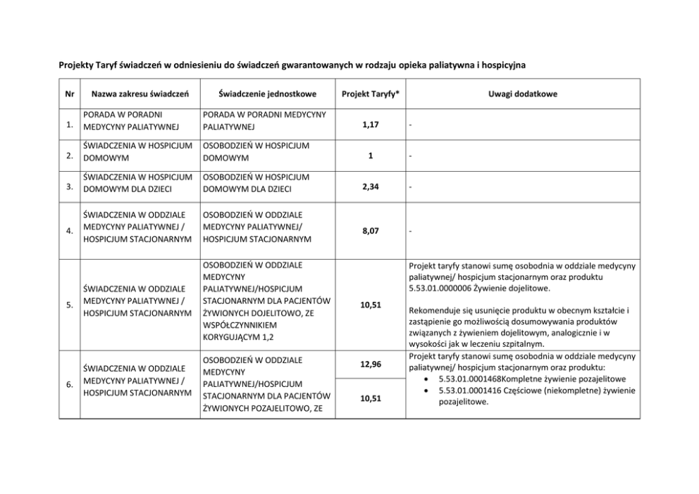 Projekty Taryf świadczeń w odniesieniu do świadczeń gwarantowanych w rodzaju opieka paliatywna i hospicyjna Nr Nazwa zakresu świadczeń Świadczenie jednostkowe 1. PORADA W PORADNI MEDYCYNY PALIATYWNEJ PORADA W PORADNI MEDYCYNY PALIATYWNEJ 2. ŚWIADCZENIA W HOSPICJUM DOMOWYM 3. 4. Projekt Taryfy* Uwagi dodatkowe 1,17 - OSOBODZIEŃ W HOSPICJUM DOMOWYM 1 - ŚWIADCZENIA W HOSPICJUM DOMOWYM DLA DZIECI OSOBODZIEŃ W HOSPICJUM DOMOWYM DLA DZIECI 2,34 - ŚWIADCZENIA W ODDZIALE MEDYCYNY PALIATYWNEJ / HOSPICJUM STACJONARNYM OSOBODZIEŃ W ODDZIALE MEDYCYNY PALIATYWNEJ/ HOSPICJUM STACJONARNYM 8,07 - 5. ŚWIADCZENIA W ODDZIALE MEDYCYNY PALIATYWNEJ / HOSPICJUM STACJONARNYM OSOBODZIEŃ W ODDZIALE MEDYCYNY PALIATYWNEJ/HOSPICJUM STACJONARNYM DLA PACJENTÓW ŻYWIONYCH DOJELITOWO, ZE WSPÓŁCZYNNIKIEM KORYGUJĄCYM 1,2 6. ŚWIADCZENIA W ODDZIALE MEDYCYNY PALIATYWNEJ / HOSPICJUM STACJONARNYM OSOBODZIEŃ W ODDZIALE MEDYCYNY PALIATYWNEJ/HOSPICJUM STACJONARNYM DLA PACJENTÓW ŻYWIONYCH POZAJELITOWO, ZE Projekt taryfy stanowi sumę osobodnia w oddziale medycyny paliatywnej/ hospicjum stacjonarnym oraz produktu 5.53.01.0000006 Żywienie dojelitowe. 10,51 12,96 10,51 Rekomenduje się usunięcie produktu w obecnym kształcie i zastąpienie go możliwością dosumowywania produktów związanych z żywieniem dojelitowym, analogicznie i w wysokości jak w leczeniu szpitalnym. Projekt taryfy stanowi sumę osobodnia w oddziale medycyny paliatywnej/ hospicjum stacjonarnym oraz produktu: 5.53.01.0001468Kompletne żywienie pozajelitowe 5.53.01.0001416 Częściowe (niekompletne) żywienie pozajelitowe. Nr Nazwa zakresu świadczeń Świadczenie jednostkowe WSPÓŁCZYNNIKIEM KORYGUJĄCYM 1,7 Projekt Taryfy* Uwagi dodatkowe Rekomenduje się usunięcie produktu w obecnym kształcie i zastąpienie go możliwością dosumowywania produktów związanych z żywieniem pozajelitowym częściowym i kompletnym, analogicznie i w wysokości jak w leczeniu szpitalnym. * - Taryfy zostały ustalone w odniesieniu do świadczenia bazowego, tj. osobodzień w hospicjum domowym, któremu przyporządkowano wartość taryfy równą 1 punkt, odpowiadający wartości 42,51 zł.