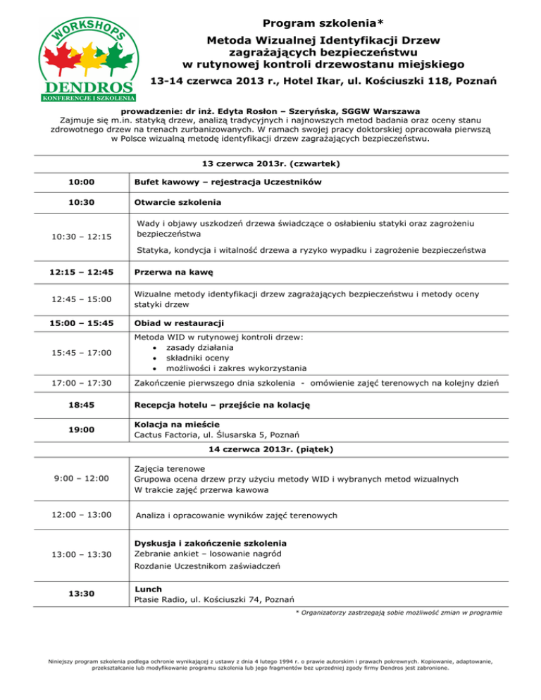 Program szkolenia* Metoda Wizualnej Identyfikacji Drzew zagraŜających bezpieczeństwu w rutynowej kontroli drzewostanu miejskiego 13-14 czerwca 2013 r., Hotel Ikar, ul. Kościuszki 118, Poznań prowadzenie: dr inŜ. Edyta Rosłon – Szeryńska, SGGW Warszawa Zajmuje się m.in. statyką drzew, analizą tradycyjnych i najnowszych metod badania oraz oceny stanu zdrowotnego drzew na trenach zurbanizowanych. W ramach swojej pracy doktorskiej opracowała pierwszą w Polsce wizualną metodę identyfikacji drzew zagraŜających bezpieczeństwu. 13 czerwca 2013r. (czwartek) 10:00 Bufet kawowy – rejestracja Uczestników 10:30 Otwarcie szkolenia 10:30 – 12:15 Wady i objawy uszkodzeń drzewa świadczące o osłabieniu statyki oraz zagroŜeniu bezpieczeństwa Statyka, kondycja i witalność drzewa a ryzyko wypadku i zagroŜenie bezpieczeństwa 12:15 – 12:45 Przerwa na kawę 12:45 – 15:00 Wizualne metody identyfikacji drzew zagraŜających bezpieczeństwu i metody oceny statyki drzew 15:00 – 15:45 Obiad w restauracji 15:45 – 17:00 Metoda WID w rutynowej kontroli drzew: • zasady działania • składniki oceny • moŜliwości i zakres wykorzystania 17:00 – 17:30 Zakończenie pierwszego dnia szkolenia - omówienie zajęć terenowych na kolejny dzień 18:45 Recepcja hotelu – przejście na kolację 19:00 Kolacja na mieście Cactus Factoria, ul. Ślusarska 5, Poznań 14 czerwca 2013r. (piątek) 9:00 – 12:00 Zajęcia terenowe Grupowa ocena drzew przy uŜyciu metody WID i wybranych metod wizualnych W trakcie zajęć przerwa kawowa 12:00 – 13:00 Analiza i opracowanie wyników zajęć terenowych 13:00 – 13:30 Dyskusja i zakończenie szkolenia Zebranie ankiet – losowanie nagród Rozdanie Uczestnikom zaświadczeń 13:30 Lunch Ptasie Radio, ul. Kościuszki 74, Poznań * Organizatorzy zastrzegają sobie moŜliwość zmian w programie Niniejszy program szkolenia podlega ochronie wynikającej z ustawy z dnia 4 lutego 1994 r. o prawie autorskim i prawach pokrewnych. Kopiowanie, adaptowanie, przekształcanie lub modyfikowanie programu szkolenia lub jego fragmentów bez uprzedniej zgody firmy Dendros jest zabronione.