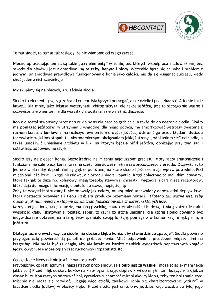 Temat siodeł, to temat tak rozległy, że nie wiadomo od czego zacząć… Mocno upraszczając temat, są takie „trzy elementy” w koniu, bez których współpraca z człowiekiem, bez szkody dla obydwu jest niemożliwa- są to zęby, kopyta i plecy. Wszystkie łączą się ze sobą i problem z jednym, uniemożliwia prawidłowe funkcjonowanie konia jako całości, nie da się osiągnąć sukcesu, kiedy choć jeden z nich szwankuje. My skupimy się na plecach, a właściwie siodle. Siodło to element łączący jeźdźca z koniem. Ma łączyć i pomogać, a nie dzielić i przeszkadzać. A to nie takie łatwe… Dla mnie, jako lekarza weterynarii, chiropraktyka, ale także jeźdźca, jest to szczególnie ważne i oczywiste, ale wiem że nie dla wszystkich, postaram się wyjaśnić dlaczego. Koń nie został stworzony przez naturę do noszenia nasz na grzbiecie, a także do do noszenia siodła. Siodło ma pomagać jeźdzcowi w utrzymaniu wygodnej dla niego pozycji, ma amortyzować wstrząsy związane z ruchem konia, a koniowi : ma rozłożyć równomiernie ciężar jeźdźca, ochronić go przed błędami dosiadu (oczywiście w jakimś stopniu) – nierónomiernym obciążaniem jakiejś strony, „odbijaniem się” od siodła, a także umożliwić uniesienie grzbietu w łuk, na którym będzie niósł jeźdźca, obniżając przy tym zad i ustawiając odpowiednio szyję. Siodło leży na plecach konia. Bezpośrednio na mięśniu najdłuższym grzbietu, który łączy anatomicznie i funkcjonalnie całe plecy konia, oraz na części piersiowej mięśnia czworobocznego z przodu. Oczywiście, to jedne z wielu mięśni, pod nimi są głębiej położone, na które siodło i jeździec mają wpływ pośrednio. Pod mięśniami leżą kości – kręgi piersiowe, a z przodu siodła -łopatka. Kręgi połaczone sa malutkimi stawami, które tak jak te duże np. kolanowy, mają torebkę stawową, chrząstki, więzadła, i całą masę receptorów, które daja do mózgu informację o położeniu stawu, napięciu, itp. Żeby te wszystkie struktury funkcjonowały jak należy, muszą mieć zapewniony odpowiedni dopływ krwi, która dostarcza pożywienia i tlenu i zabiera produkty przemiany materii. Dlatego tak ważne jest, żeby siodło w jak najmniejszym stopniu ograniczało funkcjonowanie struktur na których leży. Każdy koń jest inny, tak jak ludzie, ma inną psychikę, charakter ale także i budowę. Linia grzbietu, kształt i wysokość kłebu, skątowanie łopatek, żeber, to czyni go istota unikalną, dla której siodło powinno być indywidualnie dobrane, na miarę, żeby spełniało swoją funkcję, pomagało w komunikacji między nim, a jeźdzcem. Dlatego tez nie wystarczy, że siodło nie obciera kłębu konia, aby stwierdzić ze „pasuje”. Siodło powinno przylegać całą powierzchnią paneli do grzbietu konia. Mieć odpowiednią przestrzeń między nimi na kregosłup. Nie może być za długie, aby nie leżało na bardzo cienkich wyrostkach poprzecznych kregów lędźwiowych. Nie może ograniczać ruchomości łopatek itd. Itd. Co się dzieje kiedy tak nie jest? I czym to grozi? Przypuśćmy, co jest jednym z najczęstszych problemów, że siodło jest za wąskie. (możę zdjęcie- mam takie jakby co ;) Przedni łęk uciska z boków na kłąb- ograniczając dopływ krwi do mięśni tam leżących- tak jak za ciasne buty. Koń zaczyna odczuwać ból, ogranicza ruchomość mięśni okolicy kłebu, żeby ten ból zmniejszyć. Mięśnie nie mogą się rozwijać, ulegają więc atrofii, zanikowi, robia się charakterystyczne „dziury” w kszatłcie siodła (odlew) w okolicy kłębu. Przód siodła jest uniesiony, jeździec więc zjeżdża do tyłu, jego ciężar również. Przeciążeniu ulega dalsza część odcinka piersiowego kręgosłupa. Masa jeźdźca nie jest już rozłożona równomiernie, leży w jednym punkcie. Na to mięśnie nie są przygotowane. Dochodzi do mikrourazów mieśnia najdłuższego grzbietu, pojawia się stan zapalny i związany z nim ból. Koń ugina się przy czyszczeniu, i siodłaniu, a w czasie jazdy plecy przestają poruszać się „góra- dół”, także ruchomość boczna jest znacznie mniejsza. Obroną przed bólem jest sztywność. Jeśli taki stan trwa dłużej, mięśnie kłebu ulegają zanikowi, a punkt ucisku z tyłu siodła, powoduje już nie tylko zmiany w tym konkretnym miejscu , ale ma wpływ na cały mięsnień najdłuższy. Dochodzi do zmian w strukturze powięzi otaczającej mięsień, czyli cieniutkiej błony otaczającej wszystkie narządy stanowiącej miękkie rusztowanie, łączącej pośrednio, każdy narząd z każdym. Powięź traci elastyczność, w miejscu ucisku powtaje zgrubienie, powięź staje się niejako „za mała” w stosunku do mięśnia, więc ogranicza jego ruchomość na całej jego długości, uciska na naczynia, które nie mogą tłoczyć odpowiedniej ilości krwi, uciska na nerwy powodując ból, nie tylko w miejscu problemu. Efekt- plecy sa sztywne, nie elastyczne, nie pełnią swoje roli amortyzującej. Jeźdzcowi jeździ się coraz gorzej, nie może „wysiedzieć” twardego ruchu konia, odbija się od niego, a on usztwynia jeszcze bardziej. Koń broni przed kontaktem, nie chce rozluźnić, wykonywać ćwiczeń ujezdżeniowych, przestaje „otwierać się” w skoku, często bryka, kuląc uszy, okazując niezadowolenie. Ponieważ kręgosłup nie amortuzuje ruchu konia tak jak powiniem, z czasem z łuku skierowanego do góry, przekszatłaca się w łuk, ale skierowany do dołu, koń „odgina się”. Wyrostki kolczyste, kregów, zaczynają dotykać do siebie, trzeć, dochodzi do zapalenia, i tzw. kissing spiness, to powoduje dodatkowy ból i sztywność.(to tylko jedna z możliwych przyczyn KS!) Funkcję amortyzująca kręgosłupa przejmuja kończyny, więc ulegają przeciążeniu, i przedwczesnemu zużyciu. Jest to najgorszy scenariusz z możliwych, dobrze jeśli gdzieś wcześniej po drodze jeździec orientuje