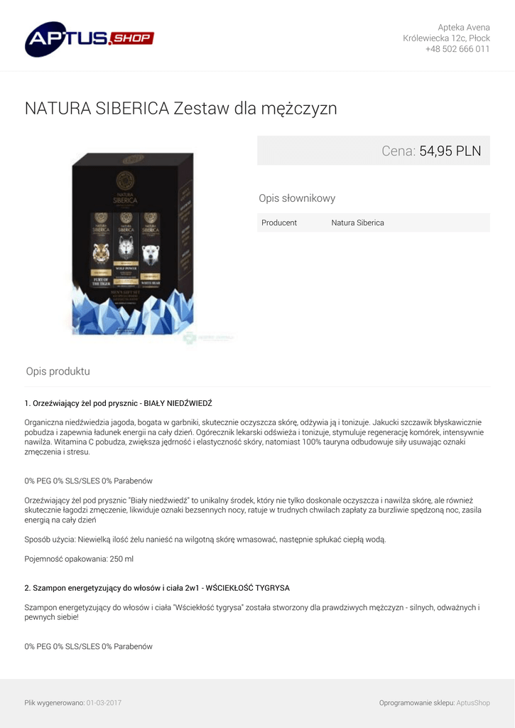 Apteka Avena Królewiecka 12c, Płock +48 502 666 011 NATURA SIBERICA Zestaw dla mężczyzn Cena: 54,95 PLN Opis słownikowy Producent Natura Siberica Opis produktu 1. Orzeźwiający żel pod prysznic - BIAŁY NIEDŹWIEDŹ Organiczna niedźwiedzia jagoda, bogata w garbniki, skutecznie oczyszcza skórę, odżywia ją i tonizuje. Jakucki szczawik błyskawicznie pobudza i zapewnia ładunek energii na cały dzień. Ogórecznik lekarski odświeża i tonizuje, stymuluje regenerację komórek, intensywnie nawilża. Witamina C pobudza, zwiększa jędrność i elastyczność skóry, natomiast 100% tauryna odbudowuje siły usuwając oznaki zmęczenia i stresu. 0% PEG 0% SLS/SLES 0% Parabenów Orzeźwiający żel pod prysznic "Biały niedźwiedź" to unikalny środek, który nie tylko doskonale oczyszcza i nawilża skórę, ale również skutecznie łagodzi zmęczenie, likwiduje oznaki bezsennych nocy, ratuje w trudnych chwilach zapłaty za burzliwie spędzoną noc, zasila energią na cały dzień Sposób użycia: Niewielką ilość żelu nanieść na wilgotną skórę wmasować, następnie spłukać ciepłą wodą. Pojemność opakowania: 250 ml 2. Szampon energetyzujący do włosów i ciała 2w1 - WŚCIEKŁOŚĆ TYGRYSA Szampon energetyzujący do włosów i ciała "Wściekłość tygrysa" została stworzony dla prawdziwych mężczyzn - silnych, odważnych i pewnych siebie! 0% PEG 0% SLS/SLES 0% Parabenów Plik wygenerowano: 01-03-2017 Oprogramowanie sklepu: AptusShop Apteka Avena Królewiecka 12c, Płock +48 502 666 011 Składniki aktywne: Organiczny różeniec górski - to potężna naturalny energetyk. Dodaje on skórze i włosom naturalnej energii, usuwa oznaki zmęczenia i stresu, poprawia wydajność. Dziki żeń-szeń - ma potężne działanie tonizujące, poprawia odżywienie mieszków włosowych, stymuluje wzrost zdrowych włosów. Ussuryjski oman - reguluje pracę gruczołów łojowych oraz pomaga zachować poczucie świeżości i orzeźwienia na cały dzień. Trawa tygrysia - skutecznie pobudza, tonizuje i zapewnia skórze elastyczność. 100% witamina C dodaje siły, chroni przed negatywnymi wpływami środowiska. Szampon energetyzujący do włosów i ciała "Wściekłość tygrysa" dodaje energii, orzeźwia i odświeża po długim męczącym dniu. Nawilża skórę, odżywia i wzmacnia cebulki włosów. Sposób użycia: Niewielką ilość szamponu nanieść na wilgotne włosy i ciało, wspienić, następnie spłukać ciepłą wodą. Pojemność opakowania: 250 ml 3.Tonizujący krem do twarzy - SIŁA WILKA Tonizujący krem do twarzy "Siła wilka" został stworzony dla prawdziwych mężczyzn - silnych, odważnych i pewnych siebie! Do każdego typu skóry. 0% PEG 0% SLS/SLES 0% Parabenów Aktywna formuła kremu została specjalnie opracowana z uwzględnieniem wszystkich właściwości męskiej skóry i ma dokładny kierunek działania. Tonizujący krem do twarzy "Siła wilka" jest idealny do ochrony skóry przed stresem, zmęczeniem i negatywnymi skutkami wpływu miejskiego środowiska. Intensywnie odżywia skórę, zwiększa jej elastyczność. Błyskawicznie odświeża i poprawia cerę, energetyzuje ją na cały dzień. Składniki aktywne: Organiczny ekstrakt z cytryńca sachalińskiego, syberyjskiej rośliny adaptogennej, zapewnia trwały efekt odmładzający, nawilża skórę, poprawia jej elastyczność, odświeża cerę. Dzika czarna mięta błyskawicznie pobudza, łagodzi obrzęki i zaczerwienienia. 100% tauryna skutecznie tonizuje dając ładunek młodości i siły. Sposób użycia: Krem do codziennego stosowania. Stosować na skórę twarzy i szyi codziennie rano. Pojemność opakowania: 50 ml Status produktów w zestawie: kosmetyki Termin przydatności do użycia podany na opakowaniu. Kraj pochodzenia: Estonia Plik wygenerowano: 01-03-2017 Powered by TCPDF (www.tcpdf.org) Oprogramowanie sklepu: AptusShop