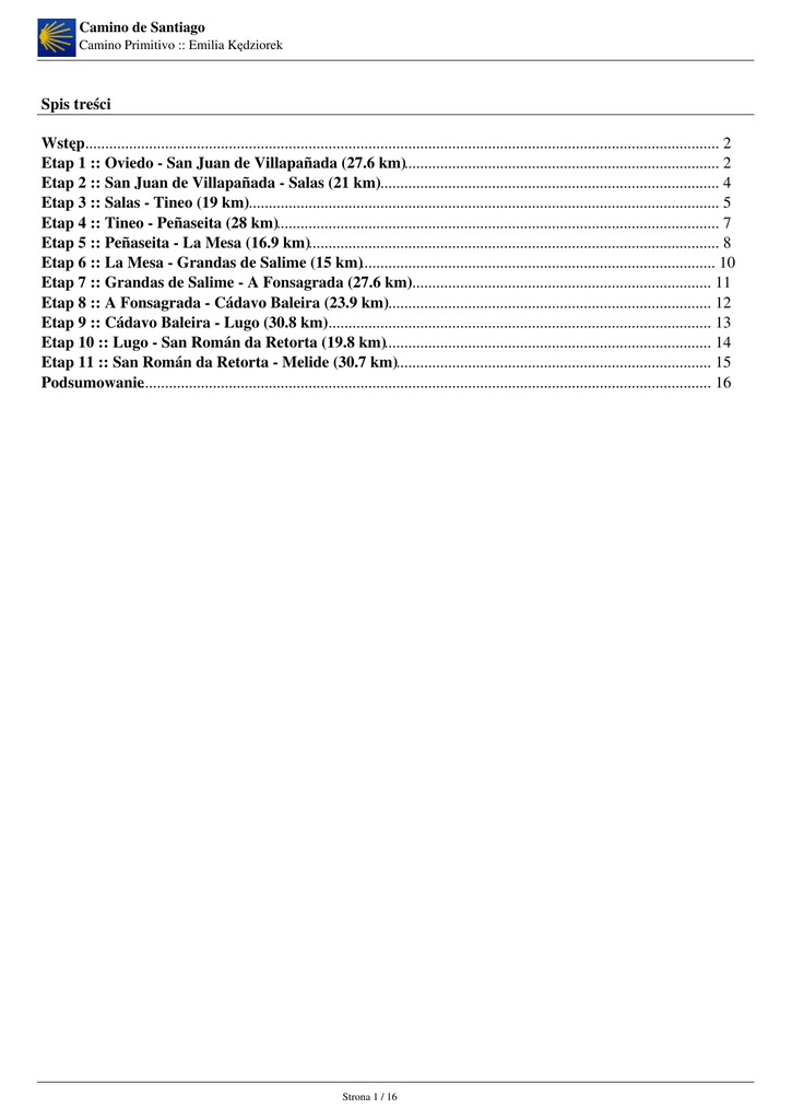 Camino de Santiago Camino Primitivo :: Emilia Kędziorek Spis treści Wstęp............................................................................................................................................................... 2 Etap 1 :: Oviedo - San Juan de Villapañada (27.6 km)............................................................................... 2 Etap 2 :: San Juan de Villapañada - Salas (21 km)..................................................................................... 4 Etap 3 :: Salas - Tineo (19 km)...................................................................................................................... 5 Etap 4 :: Tineo - Peñaseita (28 km)............................................................................................................... 7 Etap 5 :: Peñaseita - La Mesa (16.9 km)....................................................................................................... 8 Etap 6 :: La Mesa - Grandas de Salime (15 km)......................................................................................... 10 Etap 7 :: Grandas de Salime - A Fonsagrada (27.6 km)........................................................................... 11 Etap 8 :: A Fonsagrada - Cádavo Baleira (23.9 km)................................................................................. 12 Etap 9 :: Cádavo Baleira - Lugo (30.8 km)................................................................................................ 13 Etap 10 :: Lugo - San Román da Retorta (19.8 km).................................................................................. 14 Etap 11 :: San Román da Retorta - Melide (30.7 km)............................................................................... 15 Podsumowanie............................................................................................................................................... 16 Strona 1 / 16 Camino de Santiago Camino Primitivo :: Emilia Kędziorek Camino de Santiago :: Camino Primitivo Oviedo - Santiago de Compostela :: 310.3 km Droga Camino Primitivo łączy dwa inne szlaki: Camino del Norte i Camino Frances. Rozpoczyna się w Oviedo, skąd do przebycia jest ponad 300 km. Szlak łączy się z Camino Frances w miejscowości Melide, 50km przed celem - Santiago de Compostela. Autorką przewodnika jest Emilia Kędziorek. Mapy etapów zostały pobrane ze strony www.mundicamino.com. Należy zwrócić uwagę, że część map nie pokrywa się dokładnie z opisywanym etapem. Etap 1 :: Oviedo - San Juan de Villapañada (27.6 km) Oviedo Mieszk.: 212000 | Wys.: 218 m.n.p.m. | Do Bolguina: 6.8 km | Do Santiago de Compostela: 310.3 km Albergue/refugio: Refugio El Salvador Oviedo - całoroczne, www.caminotineo.com/portada_1.htm, adres: Ulica San Pedro Mestallón, 1, tel. albergue: 985 22 85 25, godzinny: od 19:00 w robocze i od 20:00 w święta. Brak kuchni. Warto zobaczyć: Katedra z XII-wieczną figurą Chrystusa Zbawiciela; Cámara Santa – miejsce przechowywania relikwii przy katedrze; preromańskie kościoły: Santa Maria del Naranco i San Miguel de Lillo (kilka kilometrów od centrum miasta) Strona 2 / 16 Camino de Santiago Camino Primitivo :: Emilia Kędziorek Związek między Oviedo i Santiago Compostela jest silny i udokumentowany. Stąd poszedł na pierwszą pielgrzymkę, Alfonso II Cnotliwy kierując się trasą nazywaną Drogę Pierwotną (Camino Primitivo) albo Drogę Wewnętrzną (kierunek Tineo). Także Oviedo zawdzięcza bardzo wiele Camino de Santiago przede wszystkim swój rozwój w średniowieczu. Do Oviedo zbaczały liczne grupy pielgrzymów z Drogi Francuskiej, aby potem kontynuować szlakiem Camino Primitivo lub Camino del Costa. Katedra datowana na wiek XIII była wzniesiona na pierwotnej bazylice. Wyróżnia się renesansowa kaplica z retabulum renesansowym, jedno z największych w Hiszpanii. Zachowana jest czczona romańska rzeźba polichromowana Zbawiciela z XII w, którego zwiedzenie jest nieuniknione dla pielgrzyma jacobeo, podobnie jak Cámara Santa, dołączona do Katedry. W niej, przechowany jest skarb, składający się z różnych relikwii, między którymi wyróżnia się całun Chrystusa, materiał użyty by wytrzeć twarz Chrystusa po jego śmierci przed zawinięciem w sławnym świętym całunie z Turynu, z którym nie mylić. Także tam przechowuje się dwie ważne relikwie ovetenses: Cruz Los Angeles, z wieku IX, który jest godłem miasta Oviedo i Cruz de la Victoria, z X w., sztandaru i symbolu Asturii. Tuż za kompleksem katedralnym możemy dopełnić zwiedzanie Muzeum Sztuk Pięknych Asturii. Runda po starówce z jej kościołami i pomnikami, jest dopełnieniem zwiedzania. Oviedo jest znane ze swoich kościołów przedromańskich, jak Naranco albo San Miguel Lillo, kilka kilometrów od centrum miejskiego. Więcej na http://www.infoasturias.com Komentarze: 2012-11-08 19:08:58 - mim: A ja dostałem credential w Katedrze. 2012-10-15 21:53:51 - Kiks: W tym roku szliśmy a naręcznym GPS\'em i zauważyliśmy dośc znaczne rozbieżności pomiędzy dystansami podawanymi tu a wskazaniami przyrządu. Niestety nie robiłem notatek. Może ktoś posiadający GPS-a przemierzy poszczególne odcinki i wyniki poda w komentarzach! Ułatwi to planowanie czasu i rozkładanie sił na trasie. 2012-10-15 21:50:28 - Kiks: Credentiali w Katedrze nie znaleźliśmy mimo, że w ubiegłym roku można byłe je kupić. Za to można otrzymać je za darmo w Informacji Turystycznej niedaleko od Katedry. Panie mówią po angielsku, dysponują także innymi materiałami na temat CP 2012-09-17 18:39:44 - Wojtek R: Bardzo długo w Oviedo szukaliśmy chusty, która okrywała twarz Chrystusa. W końcu udało nam się dowiedzieć: 1)nazywa się ona Santo Sudario 2) znajduje się (chyba) w katedrze, ale nie jest wystawiony na widok publiczny. W muzeum przy katedrze można oglądać replikę 2012-09-17 18:35:41 - Wojtek R: W Oviedo jest pralnia i suszarnia WASH\'N DRY Lavander
