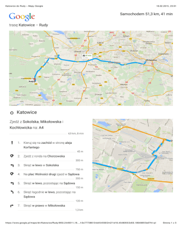 Katowice do Rudy – Mapy Google 18.02.2015, 23:01 Samochodem 51,3 km, 41 min trasę Katowice – Rudy Katowice Zjedź z Sokolska, Mikołowska i Kochłowicka na: A4 4,9 km, 8 min 1. Kieruj się na zachód w stronę aleja Korfantego 45 m 2. Zjedź z ronda na Chorzowska 300 m 3. Skręć w lewo w Sokolska 750 m 4. Na plac Wolności drugi zjazd w Sądowa 200 m 5. Skręć w lewo, pozostając na Sądowa 150 m 6. Skręć łagodnie w lewo, pozostając na Sądowa 120 m 7. Skręć w prawo w Mikołowska 1,3 km https://www.google.pl/maps/dir/Katowice/Rudy/@50.2449311,18.…f:0x777396134d454556!2m2!1d18.4548055!2d50.1894885!3e0?hl=pl Strona 1 z 3 Katowice do Rudy – Mapy Google 8. 18.02.2015, 23:01 Skręć łagodnie w prawo w kierunku Kochłowicka (drogowskazy na A4/Wrocław/Załęska Hałda-Os. Witosa/Poznań/Gliwice/Załęże/Os. Tysiąclecia) 400 m 9. Kontynuuj wzdłuż Kochłowicka 1,6 km 10. Skręć w A4 przez zjazd w lewo w kierunku Wrocław/Ruda ŚI. 63 m Jedź A4 do: DW408 w: Gliwice. Wybierz zjazd 304 z A4 30,3 km, 17 min 11. Wjedź na A4 30,0 km 12. Zjazd 304 na DW408 w kierunku Gliwice/Kędzierzyn-Koźle 280 m Jedź DW408 i DW919 do: Rybnicka/DW920 w: Rudy 16,1 km, 17 min 13. Kontynuuj wzdłuż DW408 1,4 km 14. Skręć w prawo w Ignacego Daszyńskiego/DW408 Jedź dalej drogą DW408 3,4 km 15. Na rondzie trzeci zjazd w Raciborska/DW919 Jedź dalej drogą DW919 11,4 km https://www.google.pl/maps/dir/Katowice/Rudy/@50.2449311,18.…f:0x777396134d454556!2m2!1d18.4548055!2d50.1894885!3e0?hl=pl Strona 2 z 3 Katowice do Rudy – Mapy Google 16. 18.02.2015, 23:01 Skręć w lewo w Rybnicka/DW920 2m Rudy Te wskazówki służą tylko do planowania podróży. Faktyczna trasa może być inna ze względu na roboty drogowe, korki, warunki pogodowe lub inne zdarzenia – należy wziąć te czynniki pod uwagę. Należy przestrzegać wszystkich znaków i informacji podanych na trasie. https://www.google.pl/maps/dir/Katowice/Rudy/@50.2449311,18.…f:0x777396134d454556!2m2!1d18.4548055!2d50.1894885!3e0?hl=pl Strona 3 z 3