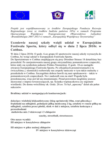 Projekt jest współfinansowany ze środków Europejskiego Funduszu Rozwoju Regionalnego (oraz ze środków budżetu państwa 10%) w ramach Programu Operacyjnego Współpracy Transgranicznej (Województwo Lubuskie) -Brandenburgia 2007-2013 w ramach „Europejskiej Współpracy Terytorialnej” Uczniowie naszej szkoły wzięli udział w Europejskim Festiwalu Sportu, który odbył się w dniu 2 lipca 2010r. w Cottbus. W dniu 2 lipca 2010r. O godz. 6.oo grupa 42 sportowców naszej szkoły wyruszyła do Cottbus, by wziąć udział w Europejskim Festiwalu Sportu. Do Sportzentrum w Cottbus znajdującym się przy Dresdner Strasse 18 dotarliśmy bez przeszkód. Po zarejestrowaniu naszej grupy otrzymaliśmy pomarańczowe czapeczki, które stały się symbolem jedności Polsko-Niemickiej. O godz. 10.oo nastąpiło otwarcie Europejskiego Festiwalu Sportu. Po oficjalnych przemówieniach (i tu ćwiczyliśmy j. niemiecki) rozbawiały nas zespoły taneczne w tym także maluchy z przedszkola w Cottbus. Szczególnie dobrze bawili się nasi opiekunowie – także w pomarańczowych czapeczkach. No i nadszedł czas na start! Pogoda była przesłoneczna, więc pot lał się strumieniami. Przad powrotem mogliśmy jeszcze skorzystać z imprez towarzyszących, np. Ścianka wspinaczkowa czy ergometr wioślarski. Do domu wróciliśmy ok. Godz. 20.oo. To był „upocony” dzień ale pełen sukcesów. Braliśmy udział w następujących konkurencjach: dziecięcy wielobój lekkoatletyczny (bieg sprinterski 10m, rzut piłeczką z frędzlami na odległość, pchnięcie piłką medyczną 2 kg, sztafeta w rzucie piłką na odległość, sztafeta przez płotki, skok w dal z miejsca, sztafeta kończąca z przeszkodami siatkówka mix 3 dziewcząt i 3 chłopców szachy, streetball, streetsoccer. Oto nasze wyniki: III miejsce w koszykówce chłopców III miejsce w piłce nożnej chłopców IV miejsce w koszykówce dziewcząt IV miejsce w szachach chłopcy VII miejsce w wieloboju lekkoatletycznym Wszystkim uczestnikom gratuluję udziału i dziękuję za wspaniałą atmosferę. Cottbus 2 lipca 2010
