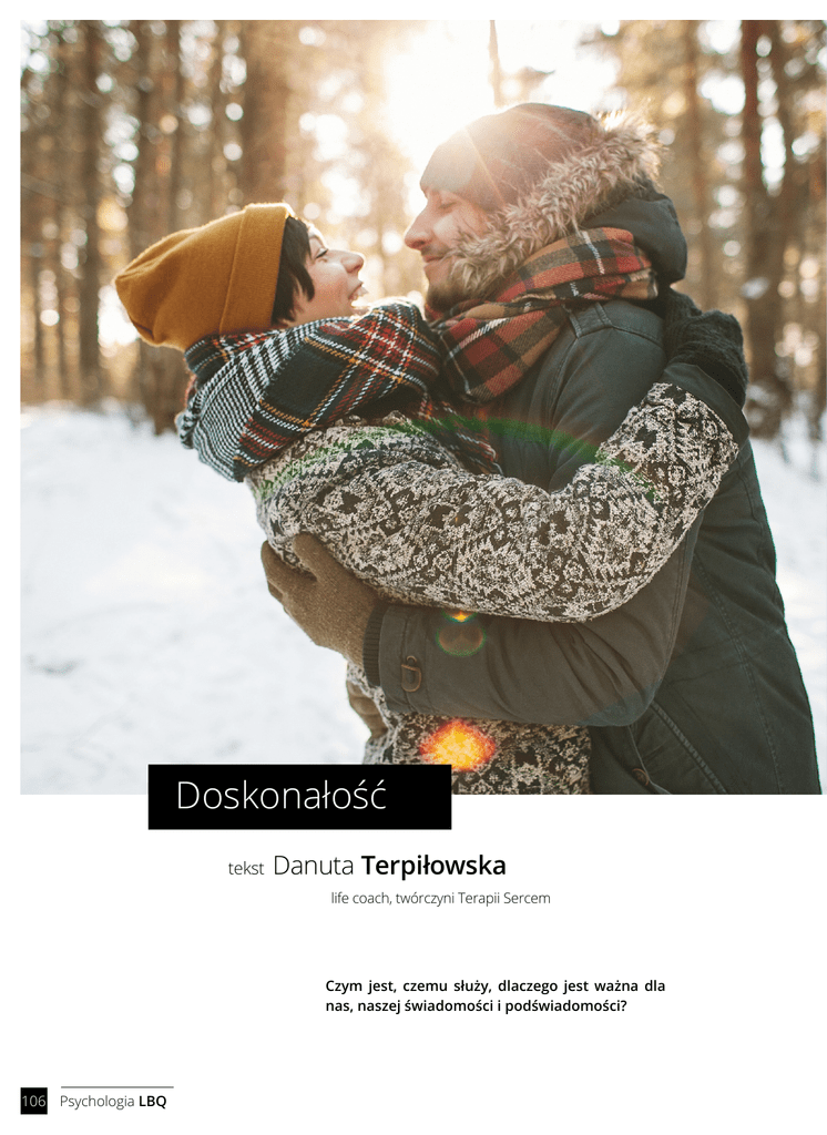Doskonałość Danuta Terpiłowska life coach, twórczyni Terapii Sercem tekst Czym jest, czemu służy, dlaczego jest ważna dla nas, naszej świadomości i podświadomości? 106 Psychologia LBQ runkowego kochania siebie nie jesteśmy od nikogo zależni. Kochając siebie, nie cierpimy, gdy ktoś nas kocha lub nie. Jesteśmy wolni i niezależni od czyichś uczuć, co nie znaczy, że bycie kochanym nie sprawia nam przyjemności. Doskonałość to nic innego jak akceptowanie siebie i miejsca, w którym jesteśmy „na ten czas”. Dlaczego? By zachować harmonię i spokój, albowiem tylko w harmonii i spokoju ducha będziemy wiedzieli, co robić dalej z naszym życiem? Wszelkie podważanie siebie, swojej wartości, nieważne, w jakim miejscu jesteśmy, jest zaprzeczeniem doskonałości. Jeżeli nie akceptujemy siebie tu i teraz, nie zaakceptujemy siebie nigdzie i w żadnym punkcie naszego „bycia”. Wszelkie narzekanie z automatu wyklucza wszystko, co pozytywne w nas i wokół nas w stanie obecnym. Wszelkie gdybanie sugerujące, że gdybym był inny (najogólniej rzecz ujmując) to byłbym szczęśliwszy, piękniejszy, zdolniejszy, bogatszy, miał/miała większe powodzenie, więcej bym zarabiała/ zarabiał, słowem: miałabym lepsze życie, jest złudzeniem. A czymże jest to lepsze życie? To, że komuś się lepiej powodzi, że jest szczuplejszy, bogatszy, ma lepszą według nas pracę, lepsze towarzystwo, ładniejszy dom? Taki tok myślenia to droga donikąd. Powiem więcej - to ślepy zaułek, z którego widzimy wszystkich innych, ale nie czujemy, nie widzimy tego, co dobre i pozytywna w nas i wokół nas. Nie czujemy siebie. Nie czując siebie, nie wiemy, co dobre i najwłaściwsze jest dla nas. Bez akceptacji siebie tu i teraz, nieważne, gdzie jesteśmy i kim jesteśmy, co osiągnęliśmy - ścigając się z osiągnięciami innych, nadal nie będziemy usatysfakcjonowani, ponieważ nadal nie akceptujemy siebie. Dopóki nie zaakceptujemy siebie takimi, jakimi jesteśmy dzisiaj, nie zaakceptujemy siebie nawet, gdy „dogonimy króliczka” (zdobędziemy to, co ma przykładowy sąsiad), nadal będziemy niezadowoleni i zapatrzeni na innych, „bo mają, a my nie”. Zapytamy ponownie: Dlaczego? Dlatego, że nie o to chodzi , by gonić króliczka – żyć chciejstwem i złudzeniami, chodzi o to, by być, być sobą tu i teraz, czuć siebie tu i teraz. Dopiero czując siebie tu i teraz, będziemy wiedzieć sami dla siebie, nie dla innych, dla siebie, kim jesteśmy i dokąd zmierzamy. Wiedząc, kim jesteśmy, będziemy wiedzieć, dokąd zmierzamy. Taki stan świadomości pozwoli łatwiej zaakceptować stan obecny. Wiedząc, że jesteśmy w drodze do celu, który znamy, który czujemy, do którego zmierzamy, to co tu i teraz, nawet najgorsze, najtrudniejsze, jest tylko kolejnym przystankiem na naszej drodze, a przystanki wcześniej czy później mijamy i świadomie wysiadamy na przystanku właściwym. Dlaczego właściwym? Bo naszym. Skąd wiemy, że naszym? Stąd, że akceptując siebie, żyjemy w zgodzie ze sobą. Żyjąc w zgodzie ze sobą, mamy wewnętrzny spokój. Spokój pozwala usłyszeć głos i cel naszej duszy, naszego wewnętrznego „ja”, które zna i naszą drogę, i nasz cel, i naszą prawdę. A prawda jest jedna - miłość. I koło się zamyka: Jeżeli nie wiesz, o co w życiu chodzi, to o miłość chodzi zawsze. Stwierdzam to na podstawie wieloletniej praktyki coacha, prowadząc sesje metodą Terapii Sercem. Z jakimkolwiek problemem przychodzono na moje sesje, główną przyczyną był brak miłości wynikający z faktu niekochania i nieakceptowania siebie, oczywiście z różnych powodów, które najczęściej sięgały dzieciństwa. Pocieszające jest to, że proces pokochania i zaakceptowania siebie jest zawsze możliwy i zależy wyłącznie od nas samych. Co to w praktyce oznacza? To, że w kwestii kochania siebie, bezwa- Jeżeli nie kochamy siebie, nie kochamy niczego. Nie kochając, nie umiemy przyjąć miłości. Nie mając miłości w sobie, nie będąc w energii miłości (bo o to głównie chodzi, by być w energii miłości, która jest głównym źródłem naszego „dobrego życia”), czujemy się nieszczęśliwi. Zasada jest prosta: Nie ma miłości – nie raduje nic. Jak to się ma do naszej doskonałości i dlaczego ta doskonałość w naszej świadomości jest tak ważna? Doskonałość to nic innego jak akceptacja siebie takimi jakimi jesteśmy dla siebie, nie dla innych. Dlaczego świadomość, że jesteśmy doskonali tacy jacy jesteśmy dzisiaj (co nie znaczy, że nie jesteśmy otwarci na rozwój i świadome zmiany), jest tak ważna dla naszej świadomości i podświadomości? Dlatego, że wszystko, co według nas doskonałością nie jest, odwraca naszą uwagę od sedna, od clou naszego życia. A co jest sednem życia? Samo życie. SAMO ZJAWISKO ŻYCIA. ŻYCIE JEST SAMO W SOBIE DOSKONAŁOŚCIĄ. Dlatego bądźmy świadomi zjawiska życia jako DOSKONAŁOŚCI. Świadomość doskonałości życia kończy potrzebę szukania w nim NIEDOSKONAŁOSCI. Czyli? Czyli braków: braku pieniędzy, braku partnera, nóg nie takich, wagi nie takiej itd., itd… Co zatem zrobić, by wrócić do doskonałości - poczuć, że jest OK? Zmienić myślenie, cieszyć się tym, co się ma, będąc otwartym na marzenia, nowe cele, ale z dystansem. Im większy dystans, im mniejsze roszczenia, im mniej wybujałe ego, tym lepiej dla nas. Tym spokojniej, tym łatwiej osiągamy cel. Ale uwaga – cel naszej duszy. A to już inna bajka, bo nasz cel nadrzędny to cel naszej duszy. Jak dociec celu naszej duszy? W spokoju. Tylko wyciszony umysł i opanowane ego pozwolą usłyszeć, co nam w duszy gra. A na dnie naszej duszy zawsze gra spokój, harmonia i miłość. Słowem – doskonałość. Wniosek: w głębi duszy każdy z nas jest doskonały, tylko o tym zapominamy. Psychologia LBQ 107