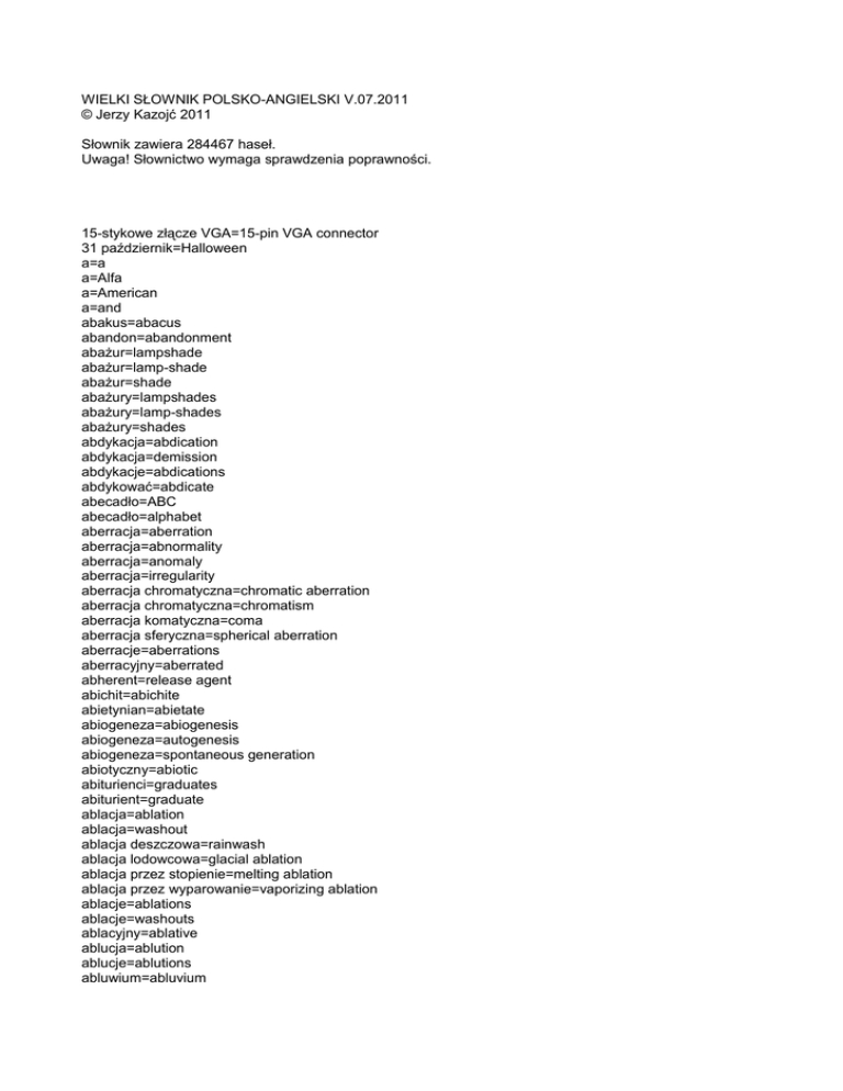 WIELKI SŁOWNIK POLSKO-ANGIELSKI V.07.2011 © Jerzy Kazojć 2011 Słownik zawiera 284467 haseł. Uwaga! Słownictwo wymaga sprawdzenia poprawności. 15-stykowe złącze VGA=15-pin VGA connector 31 październik=Halloween a=a a=Alfa a=American a=and abakus=abacus abandon=abandonment abażur=lampshade abażur=lamp-shade abażur=shade abażury=lampshades abażury=lamp-shades abażury=shades abdykacja=abdication abdykacja=demission abdykacje=abdications abdykować=abdicate abecadło=ABC abecadło=alphabet aberracja=aberration aberracja=abnormality aberracja=anomaly aberracja=irregularity aberracja chromatyczna=chromatic aberration aberracja chromatyczna=chromatism aberracja komatyczna=coma aberracja sferyczna=spherical aberration aberracje=aberrations aberracyjny=aberrated abherent=release agent abichit=abichite abietynian=abietate abiogeneza=abiogenesis abiogeneza=autogenesis abiogeneza=spontaneous generation abiotyczny=abiotic abiturienci=graduates abiturient=graduate ablacja=ablation ablacja=washout ablacja deszczowa=rainwash ablacja lodowcowa=glacial ablation ablacja przez stopienie=melting ablation ablacja przez wyparowanie=vaporizing ablation ablacje=ablations ablacje=washouts ablacyjny=ablative ablucja=ablution ablucje=ablutions abluwium=abluvium abnegacja=abnegation abnegacja=self-denial abnegacje=abnegations abnegacje=self-denials abolicja=abolition abolicja=invalidation abolicje=abolitions abolicje=invalidations abolicjoniści=abolitionists abolicjonista=abolitionist abolicjonizm=abolitionism abominacja=abomination abominacje=abominations abonament=buy abonament=subscription abonament internetowy=Internet subscription abonament sieciowy=network subscription abonamenty=buys abonamenty=subscriptions abonenci=subscribers abonent=abonent abonent=subscriber abonent aktywny=active abonent abonent nie uprawniony do połączeń międzymiastowych=barred trunk subscriber abonent uprawniony=unrestricted extension abonent uprzywilejowany=preference facility abonent wywołujący=caller abonent wywołujący=calling subscriber abonent wywoływany=called subscriber abonent żądany=called subscriber abonować=subscribe aborcja=abortion aborcja=procured aborcje=abortions aborygen=aborigine aborygeni=Aborigines abrakadabra=abracadabra abrazja=abrasion abrazja=attrition abrazja morska=marine abrasion abrazje=abrasions abrazje=attritions abrazyjny=wave-cut abrewiacja=abbreviation abrewiacje=abbreviations absencja=absence absencja=absenteeism absencja=truancy absencja chorobowa=sick absenteeism absencje=absences absolucja=absolution absolucje=absolutions absolut=absolute absolutna jednostka elektromagnetyczna=absolute electromagnetic unit absolutna jednostka elektrostatyczna=absolute electrostatic unit absolutnie=absolutely absolutnie ciągły=absolutely continuous absolutność=absoluteness absolutny=absolute absolutny=all-time absolutny=autocratic absolutny=bare absolutny=bared absolutny=barer absolutny=bares absolutny=barest absolutny=despotic absolutny=high-handed absolutny=illimitable absolutny=oppressive absolutny=out-and-out absolutny=unmitigated absolutoria=discharges absolutoria=graduates absolutoria=graduations absolutorium=discharge absolutorium=graduate absolutorium=graduation absoluty=absolutes absolutyści=absolutists absolutysta=absolutist absolutystyczny=absolutistic absolutyzacja=absolute absolutyzacje=absolutes absolutyzm=absolutism absolwenci=graduates absolwent=a graduate absolwent=alumnus absolwent=graduate absolwent wyższej uczelni=bachelor absorbancja=absorbance absorbat=absorbate absorbent=absorbent absorbent tymczasowy=temporary absorber absorbenty=absorbents absorber=absorption apparatus absorber nadfioletu=light-screening agent absorber nadfioletu zapobiegający degradacji polimerów=stabilizer absorber promieniowania nadfioletowego=ultraviolet absorber absorber promieniowania nadfioletowego=ultraviolet inhibitor absorbować=absorb absorbować=preoccupy absorbować=take up absorbowana substancja=absorbate absorbowania=intromissions absorbowanie=absorbing absorbowanie=intromission absorpcja=absorbency absorpcja=absorption absorpcja cyfr=digit absorption absorpcja dielektryczna=dielectric absorption absorpcja gruntowa=ground absorption absorpcja jądrowa=nuclear absorption absorpcja międzypasmowa=intraband absorption absorpcja przez skórę=percutaneous absorption absorpcja rezonansowa=resonance absorption absorpcja selektywna=selective absorption absorpcja strefy zorzowej=auroral zone absorption absorpcja wewnątrzpasmowa=intraband absorption absorpcja wody=water absorption absorpcje=absorptions absorpcjometr=photocolorimeter absorpcyjność=absorbency index absorpcyjność=absorbing capacity absorpcyjność=absorbing power absorpcyjność=absorption coefficient absorpcyjny=absorptive abstrahować=disregard abstrahować=pass abstrahowania=abstractions abstrahowanie=abstraction abstrahowanie=disregarding abstrahowanie danych=data abstraction abstrakcja=abstract abstrakcja=abstraction abstrakcja danych=data abstraction abstrakcja proceduralna=procedural abstraction abstrakcje=abstractions abstrakcje=abstracts abstrakcje danych=data abstractions abstrakcjonizm=abstractionism abstrakcyjna sieć semantyczna=abstract semantic network abstrakcyjnie=abstractly abstrakcyjny=abstract abstrakcyjny=notional abstrakcyjny=speculative abstrakcyjny typ danych=abstract data type abstrakt=abstract abstrakt=tracker abstrakt wykonany automatycznie=automatic abstract abstrakty=abstracts abstrakty=trackers abstynenci=abstainers abstynenci=teetotallers abstynencja=abstinence abstynencja=teetotalism abstynencja=temperance abstynencje=abstinences abstynencje=teetotalisms abstynencki=abstinent abstynent=abstainer abstynent=teetotaller absurd=absurdity absurd=insanity absurd=nonsense absurdalnie=absurdly absurdalnie=ludicrously absurdalnie=nonsensically absurdalnie=preposterously absurdalnie=ridiculously absurdalność=absurdity absurdalny=absurd absurdalny=cock-and-bull absurdalny=laughable absurdalny