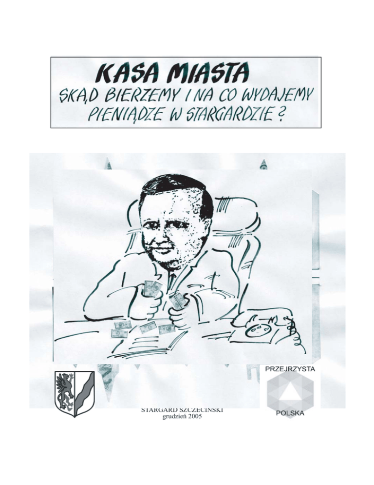 PRZEJRZYSTA STARGARD SZCZECIŃSKI grudzień 2005 POLSKA Witam serdecznie wszystkich mieszkańców Stargardu Szczecińskiego Nazywam się Sławomir Pajor i jestem Prezydentem naszego miasta. Na kartach tej niewielkiej książeczki chciałbym przedstawić Państwu w sposób przejrzysty, na co są wydawane pieniądze w mieście. Co ważne, pieniądze, które niejednokrotnie pochodzą z kieszeni samych mieszkańców. Budżet Stargardu, albo jak kto woli “miejska kasa”, funkcjonuje na tych samych zasadach jak finanse w domu każdego z nas. Co pewien czas wpływają do nas jakieś środki i codziennie wydajemy je na różne cele. Na budżet domowy i budżet miejski składają się: dochody, przychody, wydatki i rozchody. Budżet Stargardu obliczany jest na cały rok - budżet domowy obliczamy zazwyczaj co miesiąc. To podstawowa różnica wynikająca głównie z rozmiarów posiadanych środków i wydatków. Pomiędzy kasą miejską a domową jest jednak znacznie więcej podobieństw niż różnic. Rys. Porównanie: budżet Stargardu i budżet domowy. 2 Rys. Dochody i przychody rodziny Kowalskich. Wyobraźmy sobie mieszkającą pod jednym dachem stargardzką rodzinę. Dajmy na to rodzinę Kowalskich. Jest w niej pięć osób: Dziadek, Mama, Tata, Synek - student i Córka - uczennica. Co miesiąc Dziadek dostaje emeryturę,Tata - pensję z zakładu pracy, Mama - nie pracuje na stałe, lecz otrzymuje zasiłek dla bezrobotnych. Synek i Córka uczą się. Dochody Kowalskich to: emerytura Dziadka, pensja Taty i zasiłek Mamy. Środki te nie wystarczają na utrzymanie mieszkania, a więc rodzina otrzymuje dotację mieszkaniową z Miasta. Ponadto Synek jest świetnym studentem i dostaje stypendium naukowe z uniwersytetu. Zarówno dotacja z Miasta, jak i stypendium również stanowią dochody rodziny Kowalskich. Kredyt bankowy jaki, rodzina Kowalskich wzięła na zakup nowej pralki i telewizora, jest natomiast przychodem. Przychód to taki rodzaj środków finansowych, które będziemy musieli w przyszłości zwrócić. W budżecie taka operacja nazwana jest rozchodem. Gdyby na dochodach mogło się wszystko skończyć! Każda rodzina ma określone wydatki i rozchody. Nasza rodzina Kowalskich ma ich bardzo wiele. Co miesiąc opłacają: czynsz za mieszkanie, rachunki na gaz, energie elektryczną, ogrzewanie, wodę, abonament RTV i inne. Kupowane jest jedzenie, ubranie, lekarstwa, pomoce naukowe dla dzieci. Co miesiąc Córka i Synek dostają kieszonkowe, a ten ostatni opłaca dodatkowo stancję. Rys. Wydatki i rozchody rodziny Kowalskich. Ponadto Kowalscy spłacają ratę do banku. Spłatę kredytu zalicza się do rozchodów. Kowalscy robią wszystko, aby wydatki i rozchody równoważyły się z dochodami i przychodami, tzn. Aby budżet domowy bilansował się na zero. Jeżeli w danym miesiącu uda im się coś zaoszczędzić, wówczas mówimy o nadwyżce budżetowej. Jeżeli wydatki i rozchody są większe niż dochody i przychody, wówczas mówimy o deficycie budżetowym. A to może oznaczać w przyszłości kłopoty. 3 Kasa Stargardu przedstawia się bardzo podobnie jak ta domowa u Kowalskich, którą przedstawiłem na poprzedniej stronie. Miasto również ma swoje dochody i przychody oraz wydatki i rozchody. Co rok samorząd miejski opracowuje budżet na rok następny. Uchwała budżetowa jest najważniejszym dokumentem finansowym w każdym samorządzie. Projekt, czyli propozycję planu budżetu sporządza prezydent na podstawie wniosków podległych mu jednostek organizacyjnych (tzn. szkół podstawowych i gimnazjów, SCK, MDK, MZK i innych). Propozycje budżetowe mogą również zgłaszać radni miejscy, a za ich pośrednictwem także sami mieszkańcy Stargardu. Gotowy projekt trafia następnie do Regionalnej Izby Obrachunkowej, która opiniuje go pod względem poprawności. Gdy opinia jest pozytywna plan budżetu na przyszły rok trafia na obrady Rady Miejskiej Stargardu, która przyjmuje go w formie uchwały budżetowej. Przyjrzyjmy się dochodom i wydatkom Stargardu przewidzianym na 2006 rok. 4 Rys. Dochody i wydatki Stargardu w roku 2006. Aż 12 milionów 749 tysięcy 790 złotych zaplanowaliśmy wydać na różnego rodzaju inwestycje. Postanowiliśmy zainwestować przede wszystkim w: gospodarkę komunalną i ochronę środowiska, transport i łączność, bezpieczeństwo publiczne, oświatę i wychowanie, administrację publiczną oraz kulturę i ochronę dziedzictwa narodowego. Wydatki inwestycyjne Stargardu w roku 2006 przedstawiają się następująco: Budowa pomnika Ojca Świętego - Jana Pawła II - 203 610 zł, Budowa sali gimnastycznej dla SP nr 6 przy ul. Armii Krajowej wraz z zespołem boisk - 400 000 zł, Wykonanie systemu monitoringu wizyjnego - etap I - 400 000 zł, Informatyzacja Urzędu Miejskiego w ramach programu: “Przyjazna administracja” - 392 600 zł, Rozbudowa i modernizacja dróg miejskich - 1 010 000 zł, Modernizacja i rozbudowa ścieżek rowerowych przy ul. Broniewskiego - 300 000 zł, Budowa sali widowiskowej z funkcją kinową w SCK - 9 225 000 zł, Utworzenie gminnego punktu zbiórki odpadów niebezpiecznych -70 000 zł, . Rozbudowa układu oświetlenia ulic: Sikorskiego, Giżynek, Podchorążych oraz projektów technicznych dla Parku Batorego i ul. Zwycięzców - 185 000 zł, Zakupy inwestycyjne - wykup nieruchomości od prywatnych właścicieli pod budowę dróg w Stargardzkim Parku Przemysłowym, zakup mikrobusu do przewozu osób niepełnosprawnych, zakup komputerów z osprzętem - 563 000 zł. Rys. Skąd będziemy mieli pieniądze w 2006 roku. 5 Przyjrzyjmy się jak wyglądał budżet miasta Stargardu w ostatnich 2 latach. Porównajmy to z dochodami i wydatkami przewidzianymi na rok 2006. Rys. Budżet Stargardu w latach 2004-2006. Dochody w budżecie na 2006 rok sięgną rekordowej sumy 121 milionów 811 tysięcy 680 złotych. Oznacza to blisko 13 milionów więcej niż w roku 2005 oraz o 15,5 miliona więcej niż przed 2 laty. Nasze miasto czerpie doch
