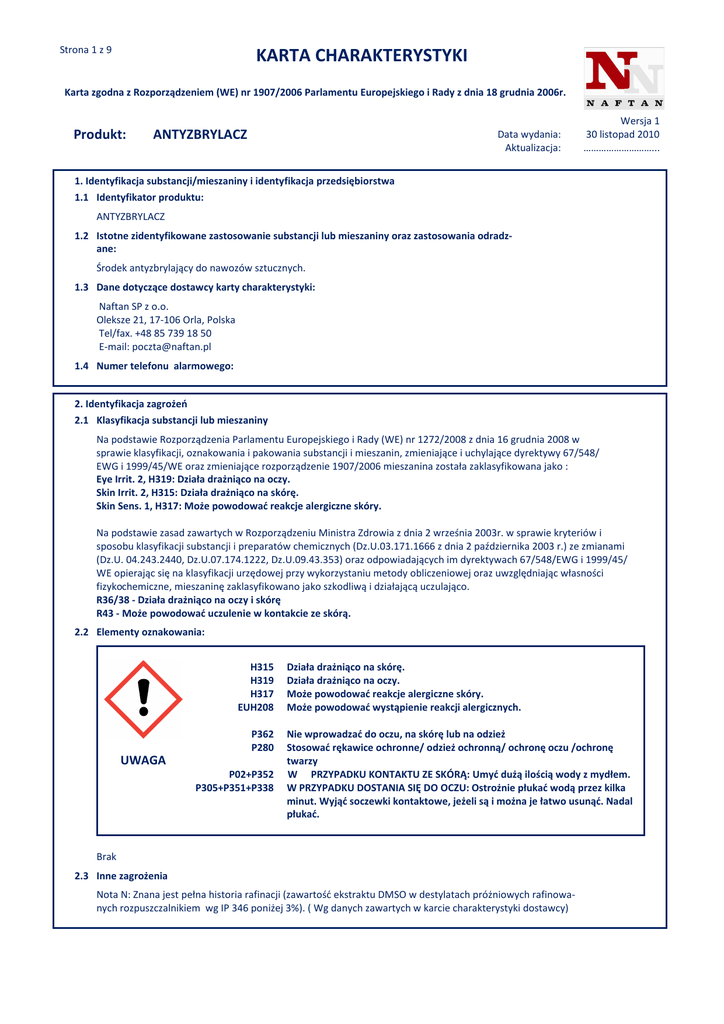 Strona 1 z 9 KARTA CHARAKTERYSTYKI Karta zgodna z Rozporządzeniem (WE) nr 1907/2006 Parlamentu Europejskiego i Rady z dnia 18 grudnia 2006r. Produkt: ANTYZBRYLACZ Data wydania: Aktualizacja: Wersja 1 30 listopad 2010 ………………………... 1. Identyfikacja substancji/mieszaniny i identyfikacja przedsiębiorstwa 1.1 Identyfikator produktu: ANTYZBRYLACZ 1.2 Istotne zidentyfikowane zastosowanie substancji lub mieszaniny oraz zastosowania odradzane: Środek antyzbrylający do nawozów sztucznych. 1.3 Dane dotyczące dostawcy karty charakterystyki: Naftan SP z o.o. Oleksze 21, 17-106 Orla, Polska Tel/fax. +48 85 739 18 50 E-mail: [email protected] 1.4 Numer telefonu alarmowego: 00 00 +48 85 739 18 50 (czynny w dni powszednie od 8 do 15 ) 2. Identyfikacja zagrożeń 2.1 Klasyfikacja substancji lub mieszaniny Na podstawie Rozporządzenia Parlamentu Europejskiego i Rady (WE) nr 1272/2008 z dnia 16 grudnia 2008 w sprawie klasyfikacji, oznakowania i pakowania substancji i mieszanin, zmieniające i uchylające dyrektywy 67/548/ EWG i 1999/45/WE oraz zmieniające rozporządzenie 1907/2006 mieszanina została zaklasyfikowana jako : Eye Irrit. 2, H319: Działa drażniąco na oczy. Skin Irrit. 2, H315: Działa drażniąco na skórę. Skin Sens. 1, H317: Może powodować reakcje alergiczne skóry. Na podstawie zasad zawartych w Rozporządzeniu Ministra Zdrowia z dnia 2 września 2003r. w sprawie kryteriów i sposobu klasyfikacji substancji i preparatów chemicznych (Dz.U.03.171.1666 z dnia 2 października 2003 r.) ze zmianami (Dz.U. 04.243.2440, Dz.U.07.174.1222, Dz.U.09.43.353) oraz odpowiadających im dyrektywach 67/548/EWG i 1999/45/ WE opierając się na klasyfikacji urzędowej przy wykorzystaniu metody obliczeniowej oraz uwzględniając własności fizykochemiczne, mieszaninę zaklasyfikowano jako szkodliwą i działającą uczulająco. R36/38 - Działa drażniąco na oczy i skórę R43 - Może powodować uczulenie w kontakcie ze skórą. 2.2 Elementy oznakowania: H315 H319 H317 EUH208 P362 P280 UWAGA P02+P352 P305+P351+P338 Działa drażniąco na skórę. Działa drażniąco na oczy. Może powodować reakcje alergiczne skóry. Może powodować wystąpienie reakcji alergicznych. Nie wprowadzać do oczu, na skórę lub na odzież Stosować rękawice ochronne/ odzież ochronną/ ochronę oczu /ochronę twarzy W PRZYPADKU KONTAKTU ZE SKÓRĄ: Umyć dużą ilością wody z mydłem. W PRZYPADKU DOSTANIA SIĘ DO OCZU: Ostrożnie płukać wodą przez kilka minut. Wyjąć soczewki kontaktowe, jeżeli są i można je łatwo usunąć. Nadal płukać. Brak 2.3 Inne zagrożenia Nota N: Znana jest pełna historia rafinacji (zawartość ekstraktu DMSO w destylatach próżniowych rafinowanych rozpuszczalnikiem wg IP 346 poniżej 3%). ( Wg danych zawartych w karcie charakterystyki dostawcy) Strona 2 z 9 KARTA CHARAKTERYSTYKI Karta zgodna z Rozporządzeniem (WE) nr 1907/2006 Parlamentu Europejskiego i Rady z dnia 18 grudnia 2006r. Produkt: ANTYZBRYLACZ Data wydania: Aktualizacja: Wersja 1 30 listopad 2010 ………………………... 3. Skład i informacja o składnikach 3.1 Substancje Nie dotyczy 3.2 Mieszaniny Nazwa substancji Gacz parafinowy (ropa naftowa) Pochodne kwasów tłuszczowch Alkiloamina tłuszczowa Identyfikator substancji Dyrektywa 67/548/EWG Symbol Zwroty R zagrożenia Rozporządzenie 1272/2008 Klasa Zwroty H zagrożenia Zawartość: 60 - 90 % CAS#: 64742-61-6 WE#: 265-165-5 Nr indeksowy: 649-244-00-5 Nr rejestracji wstępnej: 05-2114527010-70-0000 T R45 Nota H Nota N Carc 1B H350 Nota H Nota N Zawartość: 0 -1 % Nr indeksowy: brak Nr rejestracji wstępnej: brak Xi R36/38 Eye Irrit. 2 Skin Irrit. 2 H319 H315 Zawartość: 0 - 5 % Nr indeksowy: brak Nr rejestracji wstępnej:brak C R34 R41 R43 Skin Corr. 1B Eye Dam. 1 Skin Sens.1 H314 H318 H317 Pełna treść zwrotów określających rodzaj zagrożenia, zwrotów R oraz pozostałych zwrotów został umieszczony w sekcji 16 niniejszej karty charakterystyki. 4. Środki pierwszej pomocy 4.1 Opis środków pierwszej pomocy Zalecenia ogólne W każdym z poniżej podanych przypadków postępowania, gdy zaburzenia nie ustępują , należy natychmiast wezwać lekarza lub odwieźć poszkodowanego do szpitala, pokazać opakowanie lub etykietę. Jeżeli poszkodowany jest nieprzytomny nie podawać niczego doustnie i ułożyć go w pozycji bocznej ustalonej. Zapewnić poszkodowanemu spokój i kontrolować jego oddech i puls. Jeżeli poszkodowany jest przytomny , nie podawać mu mleka, tłuszczu, alkoholu. W każdym przypadku szczegółowym postępować jak opisano poniżej. Po wdychaniu Jeśli obserwuje się szkodliwy wpływ oparów na poszkodowanego, należy wyprowadzić lub wynieść go z zagrożonego miejsca na świeże powietrze. Zdjąć zanieczyszczoną odzież. Zapewnić poszkodowanemu spokój i ciepło(okryć kocami). Kontrolować jego oddech i tętno. Przy występowaniu zaburzeń w oddychaniu podawać tlen. W przypadku zatrzymania oddechu stosować sztuczne oddychanie za pomocą aparatu AMBU, po uprzednim oczyszczeniu jamy ustnej z ciał obcych i śluzu. Jeżeli stanie się to konieczne, wykonać masaż serca. Po kontakcie ze skórą Zdjąć skażoną odzież. Miejsce kontaktu a w razie potrzeby całe ciało należy dokładnie umyć wodą z mydłem, o ile nie ma oparzeń gorącym produktem. Do mycia nie wolno używać rozpuszczalników organicznych takich jak: nafta, lekkie destylaty czy benzyna. W przypadku kontaktu gorącego produktu ze skórą, oparzone miejsce należy natychmiast zanurzyć w zimnej wodzie lub poddawać działaniu strumienia bieżącej wody przez co najmniej 10 min. Jeśli produkt wniknął pod ciśnieniem do tkanek podskórnych, należy natychmiast udzielić poszkodowanemu pomocy medycznej. Po kontakcie z oczami Natychmiast zdjąć szkła kontaktowe i przemywać oczy dużą ilością wody przez co najmniej 15 min(przy odwiniętych powiekach). W przypadku zanieczyszczenia tylko jednego oka – drugie chronić przed zanieczyszc