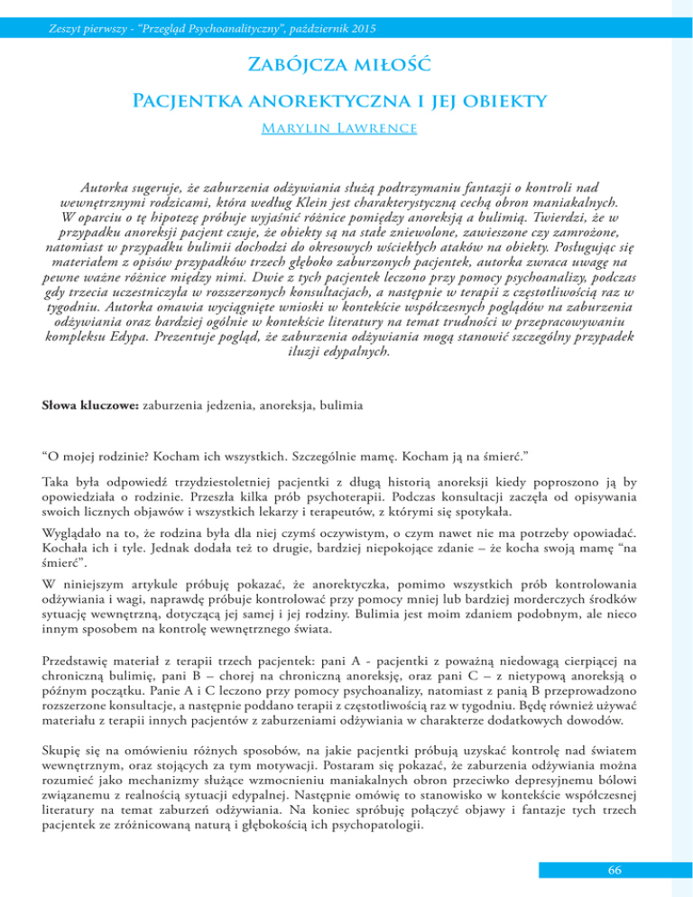 Zeszyt pierwszy - “Przegląd Psychoanalityczny”, październik 2015 Zabójcza miłość Pacjentka anorektyczna i jej obiekty Marylin Lawrence Autorka sugeruje, że zaburzenia odżywiania służą podtrzymaniu fantazji o kontroli nad wewnętrznymi rodzicami, która według Klein jest charakterystyczną cechą obron maniakalnych. W oparciu o tę hipotezę próbuje wyjaśnić różnice pomiędzy anoreksją a bulimią. Twierdzi, że w przypadku anoreksji pacjent czuje, że obiekty są na stałe zniewolone, zawieszone czy zamrożone, natomiast w przypadku bulimii dochodzi do okresowych wściekłych ataków na obiekty. Posługując się materiałem z opisów przypadków trzech głęboko zaburzonych pacjentek, autorka zwraca uwagę na pewne ważne różnice między nimi. Dwie z tych pacjentek leczono przy pomocy psychoanalizy, podczas gdy trzecia uczestniczyła w rozszerzonych konsultacjach, a następnie w terapii z częstotliwością raz w tygodniu. Autorka omawia wyciągnięte wnioski w kontekście współczesnych poglądów na zaburzenia odżywiania oraz bardziej ogólnie w kontekście literatury na temat trudności w przepracowywaniu kompleksu Edypa. Prezentuje pogląd, że zaburzenia odżywiania mogą stanowić szczególny przypadek iluzji edypalnych. Słowa kluczowe: zaburzenia jedzenia, anoreksja, bulimia “O mojej rodzinie? Kocham ich wszystkich. Szczególnie mamę. Kocham ją na śmierć.” Taka była odpowiedź trzydziestoletniej pacjentki z długą historią anoreksji kiedy poproszono ją by opowiedziała o rodzinie. Przeszła kilka prób psychoterapii. Podczas konsultacji zaczęła od opisywania swoich licznych objawów i wszystkich lekarzy i terapeutów, z którymi się spotykała. Wyglądało na to, że rodzina była dla niej czymś oczywistym, o czym nawet nie ma potrzeby opowiadać. Kochała ich i tyle. Jednak dodała też to drugie, bardziej niepokojące zdanie – że kocha swoją mamę “na śmierć”. W niniejszym artykule próbuję pokazać, że anorektyczka, pomimo wszystkich prób kontrolowania odżywiania i wagi, naprawdę próbuje kontrolować przy pomocy mniej lub bardziej morderczych środków sytuację wewnętrzną, dotyczącą jej samej i jej rodziny. Bulimia jest moim zdaniem podobnym, ale nieco innym sposobem na kontrolę wewnętrznego świata. Przedstawię materiał z terapii trzech pacjentek: pani A - pacjentki z poważną niedowagą cierpiącej na chroniczną bulimię, pani B – chorej na chroniczną anoreksję, oraz pani C – z nietypową anoreksją o późnym początku. Panie A i C leczono przy pomocy psychoanalizy, natomiast z panią B przeprowadzono rozszerzone konsultacje, a następnie poddano terapii z częstotliwością raz w tygodniu. Będę również używać materiału z terapii innych pacjentów z zaburzeniami odżywiania w charakterze dodatkowych dowodów. Skupię się na omówieniu różnych sposobów, na jakie pacjentki próbują uzyskać kontrolę nad światem wewnętrznym, oraz stojących za tym motywacji. Postaram się pokazać, że zaburzenia odżywiania można rozumieć jako mechanizmy służące wzmocnieniu maniakalnych obron przeciwko depresyjnemu bólowi związanemu z realnością sytuacji edypalnej. Następnie omówię to stanowisko w kontekście współczesnej literatury na temat zaburzeń odżywiania. Na koniec spróbuję połączyć objawy i fantazje tych trzech pacjentek ze zróżnicowaną naturą i głębokością ich psychopatologii. 66