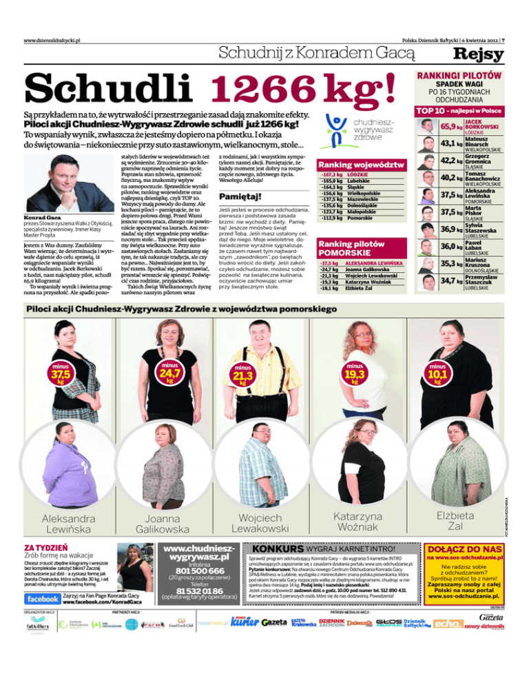 Polska Dziennik Bałtycki Ba³tycki | 6 kwietnia 2012 | ? www.dziennikbaltycki.pl Schudnij z Konradem Gacą Schudli 1266 kg! Są przykładem na to, że wytrwałość i przestrzeganie zasad dają znakomite efekty. Piloci akcji Chudniesz-Wygrywasz Zdrowie schudli już 1266 kg! To wspaniały wynik, zwłaszcza że jesteśmy dopiero na półmetku. I okazja do świętowania – niekoniecznie przy suto zastawionym, wielkanocnym, stole... Konrad Gaca prezes Stowarzyszenia Walki z Otyłością, specjalista żywieniowy, trener klasy Master Propta Jestem z Was dumny. Zaufaliśmy Wam wierząc, że determinacja i wytrwałe dążenie do celu sprawią, iż osiągniecie wspaniałe wyniki w odchudzaniu. Jacek Borkowski z Łodzi, nasz najcięższy pilot, schudł 65,9 kilograma! To wspaniały wynik i świetna prognoza na przyszłość. Ale spadki pozo- stałych liderów w województwach też są wyśmienite. Zrzucenie 30–40 kilogramów naprawdę odmienia życie. Poprawia stan zdrowia, sprawność fizyczną, ma znakomity wpływ na samopoczucie. Sprawdźcie wyniki pilotów, ranking województw oraz najlepszą dziesiątkę, czyli TOP 10. Wszyscy mają powody do dumy. Ale kochani piloci – pamiętajcie, że to dopiero połowa drogi. Przed Wami jeszcze spora praca, dlatego nie powinniście spoczywać na laurach. Ani rozsiadać się zbyt wygodnie przy wielkanocnym stole... Tak przecież spędzamy święta wielkanocne. Przy suto zastawionych stołach. Zasłaniamy się tym, że tak nakazuje tradycja, ale czy na pewno... Najważniejsze jest to, by być razem. Spotkać się, porozmawiać, przestać wreszcie się spieszyć. Poświęcić czas rodzinie, przyjaciołom. Takich Świąt Wielkanocnych życzę zarówno naszym pilotom wraz z rodzinami, jak i wszystkim sympatykom naszej akcji. Pamiętajcie, że każdy moment jest dobry na rozpoczęcie nowego, zdrowego życia. Wesołego Alleluja! Pamiętaj! Jeśli jesteś w procesie odchudzania, pierwsza i podstawowa zasada brzmi: nie wychodź z diety. Pamiętaj! Jeszcze mnóstwo świąt przed Tobą. Jeśli masz ustalony cel, dąż do niego. Moje wieloletnie doświadczenie wyraźnie sygnalizuje, że czasem nawet tym najtwardszym „zawodnikom”, po świętach trudno wrócić do diety. Jeśli zakończyłeś odchudzanie, możesz sobie pozwolić na świąteczne kulinaria, oczywiście zachowując umiar przy świątecznym stole. Ranking województw -167,3 kg -165,0 kg -164,3 kg -156,6 kg -137,5 kg -135,6 kg -123,7 kg -112,9 kg ŁÓDZKIE Lubelskie Śląskie Wielkopolskie Mazowieckie Dolnośląskie Małopolskie Pomorskie Rejsy RANKINGI PILOTÓW SPADEK WAGI PO 16 TYGODNIACH ODCHUDZANIA TOP 10 - najlepsi w Polsce 65,9 kg JACEK BORKOWSKI 43,1 kg Mateusz Binarsch 42,2 kg Grzegorz Gromnica 40,2 kg Tomasz Banachowicz 37,5 kg Aleksandra Lewińska 37,5 kg Marta Piskor 36,9 kg Sylwia Staszewska ŁÓDZKIE WIELKOPOLSKIE ŚLĄSKIE WIELKOPOLSKIE POMORSKIE ŚLĄSKIE LUBELSKIE Ranking pilotów POMORSKIE -37,5 kg -24,7 kg -21,3 kg -19,3 kg -10,1 kg ALEKSANDRA LEWIŃSKA LEWIÑSKA Joanna Galikowska Wojciech Lewakowski Katarzyna Woźniak Elżbieta Żal 36,0 kg Paweł Łaban LUBELSKIE 35,3 kg Mariusz Kruszona DOLNOŚLĄSKIE 34,7 kg Przemysław Staszczuk LUBELSKIE Piloci akcji Chudniesz-Wygrywasz Zdrowie z województwa pomorskiego Aleksandra Lewińska 21,3 kg kg kg Joanna Galikowska ZA TYDZIEŃ Wojciech Lewakowski www.chudnieszwygrywasz.pl Zrób formę na wakacje Chcesz zrzucić zbędne kilogramy i wreszcie bez kompleksów założyć bikini? Zacznij odchudzanie już dziś - a zyskasz formę jak Dorota Choinacka, która schudła 30 kg, i od ponad roku utrzymuje świetną formę. Infolinia 801 500 666 (20 groszy za połączenie) Telefon Zajrzyj na Fan Page Konrada Gacy www.facebook.com/KonradGaca minus minus 24,7 37,5 81 532 01 86 (opłata wg taryfy operatora) 19,3 kg Katarzyna Woźniak KONKURS WYGRAJ KARNET INTRO! Sprawdź program odchudzający Konrada Gacy – do wygrania 5 karnetów INTRO umożliwiających zapoznanie się z zasadami działania portalu www.sos-odchudzanie.pl. Pytanie konkursowe: Na otwarciu nowego Centrum Odchudzania Konrada Gacy SPA&Wellness w Lublinie, wystąpiła z minirecitalem znana polska piosenkarka, która pod okiem Konrada Gacy rozpoczęła walkę ze zbędnymi kilogramami, chudnąc w niespełna dwa miesiące 14 kg. Podaj imię i nazwisko piosenkarki. Jeżeli znasz odpowiedź zadzwoń dziś o godz. 10.00 pod numer tel. 512 890 431. Karnet otrzyma 5 pierwszych osób, które się do nas dodzwonią. Powodzenia! minus 10,1 kg FOT. AGNIESZKA KOZŁOWSKA minus minus Elżbieta Żal DOŁĄCZ DO NAS na www.sos-odchudzanie.pl Nie radzisz sobie z odchudzaniem? Spróbuj zrobić to z nami! Zapraszamy osoby z całej Polski na nasz portal www.sos-odchudzanie.pl. 1162118/00 ORGANIZATOR AKCJI : PARTNERZY AKCJI : PATRONI MEDIALNI AKCJI :