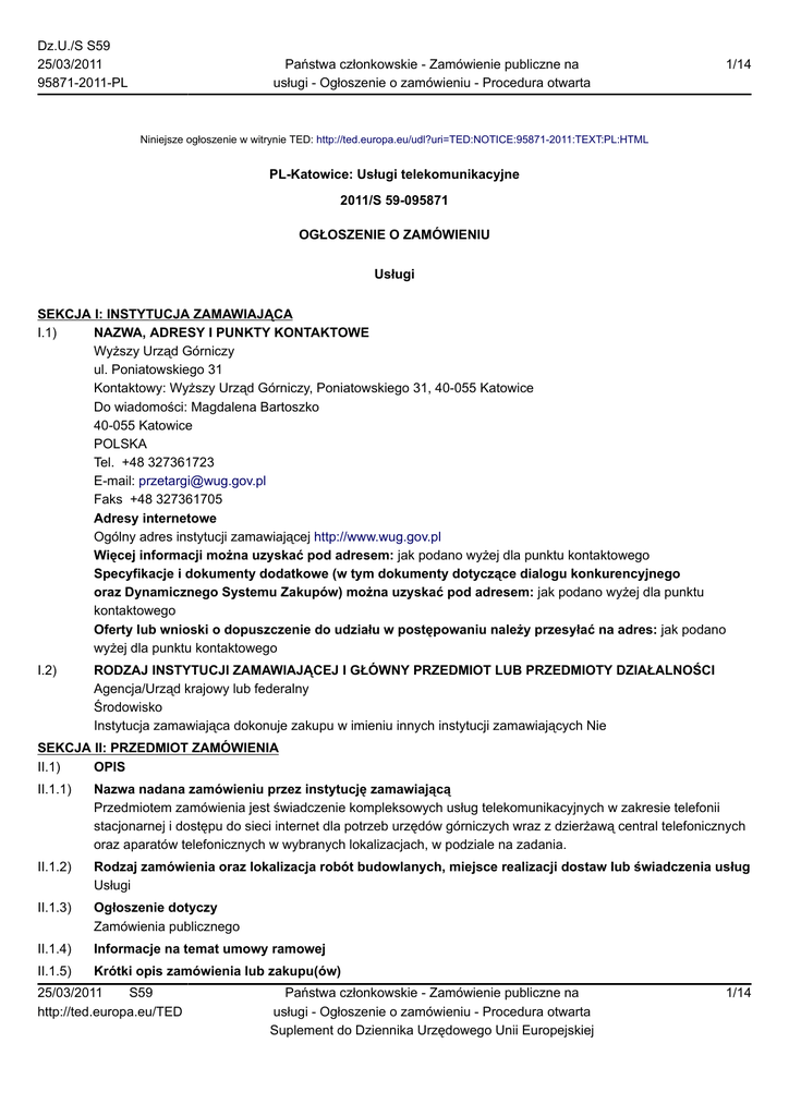 Dz.U./S S59 25/03/2011 95871-2011-PL Państwa członkowskie - Zamówienie publiczne na usługi - Ogłoszenie o zamówieniu - Procedura otwarta 1/14 Niniejsze ogłoszenie w witrynie TED: http://ted.europa.eu/udl?uri=TED:NOTICE:95871-2011:TEXT:PL:HTML PL-Katowice: Usługi telekomunikacyjne 2011/S 59-095871 OGŁOSZENIE O ZAMÓWIENIU Usługi SEKCJA I: INSTYTUCJA ZAMAWIAJĄCA I.1) NAZWA, ADRESY I PUNKTY KONTAKTOWE Wyższy Urząd Górniczy ul. Poniatowskiego 31 Kontaktowy: Wyższy Urząd Górniczy, Poniatowskiego 31, 40-055 Katowice Do wiadomości: Magdalena Bartoszko 40-055 Katowice POLSKA Tel. +48 327361723 E-mail: [email protected] Faks +48 327361705 Adresy internetowe Ogólny adres instytucji zamawiającej http://www.wug.gov.pl Więcej informacji można uzyskać pod adresem: jak podano wyżej dla punktu kontaktowego Specyfikacje i dokumenty dodatkowe (w tym dokumenty dotyczące dialogu konkurencyjnego oraz Dynamicznego Systemu Zakupów) można uzyskać pod adresem: jak podano wyżej dla punktu kontaktowego Oferty lub wnioski o dopuszczenie do udziału w postępowaniu należy przesyłać na adres: jak podano wyżej dla punktu kontaktowego I.2) RODZAJ INSTYTUCJI ZAMAWIAJĄCEJ I GŁÓWNY PRZEDMIOT LUB PRZEDMIOTY DZIAŁALNOŚCI Agencja/Urząd krajowy lub federalny Środowisko Instytucja zamawiająca dokonuje zakupu w imieniu innych instytucji zamawiających Nie SEKCJA II: PRZEDMIOT ZAMÓWIENIA II.1) OPIS II.1.1) Nazwa nadana zamówieniu przez instytucję zamawiającą Przedmiotem zamówienia jest świadczenie kompleksowych usług telekomunikacyjnych w zakresie telefonii stacjonarnej i dostępu do sieci internet dla potrzeb urzędów górniczych wraz z dzierżawą central telefonicznych oraz aparatów telefonicznych w wybranych lokalizacjach, w podziale na zadania. II.1.2) Rodzaj zamówienia oraz lokalizacja robót budowlanych, miejsce realizacji dostaw lub świadczenia usług Usługi II.1.3) Ogłoszenie dotyczy Zamówienia publicznego II.1.4) Informacje na temat umowy ramowej II.1.5) Krótki opis zamówienia lub zakupu(ów) 25/03/2011 S59 http://ted.europa.eu/TED Państwa członkowskie - Zamówienie publiczne na usługi - Ogłoszenie o zamówieniu - Procedura otwarta Suplement do Dziennika Urzędowego Unii Europejskiej 1/14 Dz.U./S S59 25/03/2011 95871-2011-PL Państwa członkowskie - Zamówienie publiczne na usługi - Ogłoszenie o zamówieniu - Procedura otwarta 2/14 Przedmiotem zamówienia jest świadczenie kompleksowych usług telekomunikacyjnych w zakresie telefonii stacjonarnej i dostępu do sieci internet dla potrzeb urzędów górniczych wraz z dzierżawą central telefonicznych oraz aparatów telefonicznych w wybranych lokalizacjach, w podziale na zadania. II.1.6) Wspólny Słownik Zamówień (CPV) 64200000 II.1.7) Zamówienie jest objęte Porozumieniem w sprawie zamówień rządowych (GPA) Nie II.1.8) Podział na części Tak oferty należy składać w odniesieniu do jednej lub więcej części II.1.9) Dopuszcza się składanie ofert wariantowych Nie II.2) WIELKOŚĆ LUB ZAKRES ZAMÓWIENIA II.2.1) Całkowita wielkość lub zakres 1126000.00 zł II.2.2) Opcje II.3) CZAS TRWANIA ZAMÓWIENIA LUB TERMIN REALIZACJI Okres w miesiącach: 39 (od udzielenia zamówienia): INFORMACJE NA TEMAT CZĘŚCI CZĘŚĆ NR 1 NAZWA Lokalizacje: 1) KRÓTKI OPIS Lokalizacje: 1/ Wyższy Urząd Górniczy w Katowicach, ul. Poniatowskiego 31, 2/ Okręgowy Urząd Górniczy w Katowicach, Urząd Górniczy do Badań Kontrolnych Urządzeń Energomechanicznych oraz Archiwum Dokumentacji Mierniczo – Geologicznej w Katowicach, ul. Obroki 87, 3/ Okręgowy Urząd Górniczy w Gliwicach, ul. Jasna 31a 4/ Okręgowy Urząd Górniczy w Rybniku, ul. B. Chrobrego 8. Średni miesięczny ruch wychodzący z systemu telekomunikacyjnego zamawiającego ma następującą strukturę. a) połączenia lokalne i strefowe – 17029 minut, b) połączenia międzystrefowe – 3705 minut, c) połączenia międzynarodowe do krajów UE – 12 minut, d) połączenia do krajowych sieci komórkowych - 4639 minut. 2) WSPÓLNY SŁOWNIK ZAMÓWIEŃ (CPV) 64200000 3) WIELKOŚĆ LUB ZAKRES Wykaz istniejącej numeracji: Lokalizacja Ilość numerów końcowych Numery końcowe Typ Inne. WUG 13. 1 32 251 08 29 32 251 14 71 32 251 14 72 25/03/2011 S59 http://ted.europa.eu/TED Państwa członkowskie - Zamówienie publiczne na usługi - Ogłoszenie o zamówieniu - Procedura otwarta Suplement do Dziennika Urzędowego Unii Europejskiej 2/14 Dz.U./S S59 25/03/2011 95871-2011-PL Państwa członkowskie - Zamówienie publiczne na usługi - Ogłoszenie o zamówieniu - Procedura otwarta 3/14 32 251 28 39 32 251 31 96 32 251 35 33 32 251 42 24 32 251 42 25 32 251 48 84 32 251 48 96 32 251 53 77 32 251 66 07 32 251 94 75 32 736 17 00 analogowe ISDN numery bezpośrednie poza centralą. ISDN PRA (30B+D), zakres numeracji: 1700-1950 DDI. Lokalizacja Ilość numerów Numery Typ Inne. OUG Katowice. UGBK UE. Archiwum 1. 1+ 2 MSN 1 1+ 2 MSN 32 788 98 00 32 353 01 02 32 353 06 62 32 353 06 63 32 251 94 87 32 353 01 78 32 258 10 03 32 356 03 61 32 356 03 62 ISDN analogowe analogowe ISDN PRA (30B+2D), zakres numeracji: 100 numerowa wiązka DDI numery bezpośrednie poza centralą: 32 353 01 02, 353 06 63, 258 10 03, 356 03 61, 353 01 78 Lokalizacja Ilość numerów Numery Typ Inne. OUG Gliwice 9 32 334 71 72. 32 334 71 73 32 334 71 74 32 334 71 75 32 334 71 76 32 331 44 04 32 331 44 02 32 331 44 03 32 231 53 69 analogowe numer bezpośredni poza centralą: 32 231 53 69, 6 linii zewnętrznych podłączonych do centrali, pozostałe 1 – FAX, 1 – modem Unix, 2 – linie bezpośrednie. Lokalizacja Ilość numerów Numery Typ Inne. OUG Rybnik 2. 25/03/2011 S59 http://ted.europa.eu/TED Państwa członkowskie - Zamówienie publiczne na usługi - Ogłoszenie o zamówieniu - Procedura otwarta Suplement do Dziennika Urzędowego Unii Europejskiej 3/14 Dz.U./S S59 25/03/2011 95871-2011-PL Państwa członkowskie - Zamówienie publiczne na usługi - Ogłoszenie o zamówieniu - Procedura otw