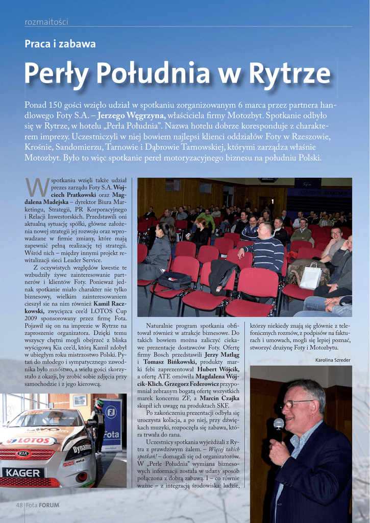 rozmaitości Praca i zabawa Perły Południa w Rytrze Ponad 150 gości wzięło udział w spotkaniu zorganizowanym 6 marca przez partnera handlowego Foty S.A. – Jerzego Węgrzyna, właściciela firmy Motozbyt. Spotkanie odbyło się w Rytrze, w hotelu „Perła Południa”. Nazwa hotelu dobrze koresponduje z charakterem imprezy. Uczestniczyli w niej bowiem najlepsi klienci oddziałów Foty w Rzeszowie, Krośnie, Sandomierzu, Tarnowie i Dąbrowie Tarnowskiej, którymi zarządza właśnie Motozbyt. Było to więc spotkanie pereł motoryzacyjnego biznesu na południu Polski. W spotkaniu wzięli także udział prezes zarządu Foty S.A. Wojciech Pratkowski oraz Magdalena Madejska – dyrektor Biura Marketingu, Strategii, PR Korporacyjnego i Relacji Inwestorskich. Przedstawili oni aktualną sytuację spółki, główne założenia nowej strategii jej rozwoju oraz wprowadzane w firmie zmiany, które mają zapewnić pełną realizację tej strategii. Wśród nich – między innymi projekt rewitalizacji sieci Leader Service. Z oczywistych względów kwestie te wzbudziły żywe zainteresowanie partnerów i klientów Foty. Ponieważ jednak spotkanie miało charakter nie tylko biznesowy, wielkim zainteresowaniem cieszył sie na nim również Kamil Raczkowski, zwycięzca cee’d LOTOS Cup 2009 sponsorowany przez firmę Fota. Pojawił się on na imprezie w Rytrze na zaproszenie organizatora. Dzięki temu wszyscy chętni mogli obejrzeć z bliska wyścigową Kia cee’d, którą Kamil zdobył w ubiegłym roku mistrzostwo Polski. Pytań do młodego i sympatycznego zawodnika było mnóstwo, a wielu gości skorzystało z okazji, by zrobić sobie zdjęcia przy samochodzie i z jego kierowcą. 48 Fota FORUM Naturalnie program spotkania obfitował również w atrakcje biznesowe. Do takich bowiem można zaliczyć ciekawe prezentacje dostawców Foty. Ofertę firmy Bosch przedstawili Jerzy Matląg i Tomasz Bińkowski, produkty marki febi zaprezentował Hubert Wójcik, a ofertę ATE omówiła Magdalena Wójcik-Klich. Grzegorz Federowicz przypomniał zebranym bogatą ofertę wszystkich marek koncernu ZF, a Marcin Czajka skupił ich uwagę na produktach SKF. Po zakończeniu prezentacji odbyła się uroczysta kolacja, a po niej, przy dźwiękach muzyki, rozpoczęła się zabawa, która trwała do rana. Uczestnicy spotkania wyjeżdżali z Rytra z prawdziwym żalem. – Więcej takich spotkań! – domagali się od organizatorów. W „Perle Południa” wymiana biznesowych informacji została w udany sposób połączona z dobrą zabawą. I – co równie ważne – z integracją środowiska: ludzie, którzy niekiedy znają się głównie z telefonicznych rozmów, z podpisów na fakturach i umowach, mogli się lepiej poznać, stworzyć drużynę Foty i Motozbytu. Karolina Szreder