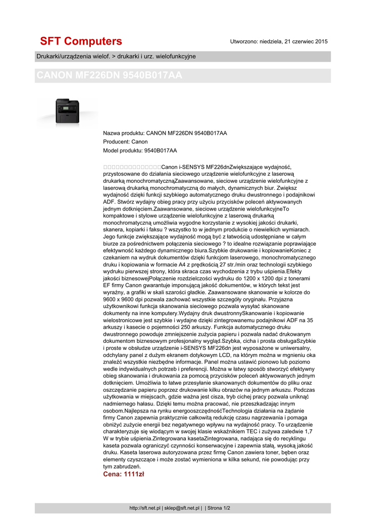 SFT Computers Utworzono: niedziela, 21 czerwiec 2015 Drukarki/urządzenia wielof. > drukarki i urz. wielofunkcyjne CANON MF226DN 9540B017AA Nazwa produktu: CANON MF226DN 9540B017AA Producent: Canon Model produktu: 9540B017AA Canon i-SENSYS MF226dnZwiększające wydajność, przystosowane do działania sieciowego urządzenie wielofunkcyjne z laserową drukarką monochromatycznąZaawansowane, sieciowe urządzenie wielofunkcyjne z laserową drukarką monochromatyczną do małych, dynamicznych biur. Zwiększ wydajność dzięki funkcji szybkiego automatycznego druku dwustronnego i podajnikowi ADF. Stwórz wydajny obieg pracy przy użyciu przycisków poleceń aktywowanych jednym dotknięciem.Zaawansowane, sieciowe urządzenie wielofunkcyjneTo kompaktowe i stylowe urządzenie wielofunkcyjne z laserową drukarką monochromatyczną umożliwia wygodne korzystanie z wysokiej jakości drukarki, skanera, kopiarki i faksu ? wszystko to w jednym produkcie o niewielkich wymiarach. Jego funkcje zwiększające wydajność mogą być z łatwością udostępniane w całym biurze za pośrednictwem połączenia sieciowego ? to idealne rozwiązanie poprawiające efektywność każdego dynamicznego biura.Szybkie drukowanie i kopiowanieKoniec z czekaniem na wydruk dokumentów dzięki funkcjom laserowego, monochromatycznego druku i kopiowania w formacie A4 z prędkością 27 str./min oraz technologii szybkiego wydruku pierwszej strony, która skraca czas wychodzenia z trybu uśpienia.Efekty jakości biznesowejPołączenie rozdzielczości wydruku do 1200 x 1200 dpi z tonerami EF firmy Canon gwarantuje imponującą jakość dokumentów, w których tekst jest wyraźny, a grafiki w skali szarości gładkie. Zaawansowane skanowanie w kolorze do 9600 x 9600 dpi pozwala zachować wszystkie szczegóły oryginału. Przyjazna użytkownikowi funkcja skanowania sieciowego pozwala wysyłać skanowane dokumenty na inne komputery.Wydajny druk dwustronnySkanowanie i kopiowanie wielostronicowe jest szybkie i wydajne dzięki zintegrowanemu podajnikowi ADF na 35 arkuszy i kasecie o pojemności 250 arkuszy. Funkcja automatycznego druku dwustronnego powoduje zmniejszenie zużycia papieru i pozwala nadać drukowanym dokumentom biznesowym profesjonalny wygląd.Szybka, cicha i prosta obsługaSzybkie i proste w obsłudze urządzenie i-SENSYS MF226dn jest wyposażone w uniwersalny, odchylany panel z dużym ekranem dotykowym LCD, na którym można w mgnieniu oka znaleźć wszystkie niezbędne informacje. Panel można ustawić pionowo lub poziomo wedle indywidualnych potrzeb i preferencji. Można w łatwy sposób stworzyć efektywny obieg skanowania i drukowania za pomocą przycisków poleceń aktywowanych jednym dotknięciem. Umożliwia to łatwe przesyłanie skanowanych dokumentów do pliku oraz oszczędzanie papieru poprzez drukowanie kilku obrazów na jednym arkuszu. Podczas użytkowania w miejscach, gdzie ważna jest cisza, tryb cichej pracy pozwala uniknąć nadmiernego hałasu. Dzięki temu można pracować, nie przeszkadzając innym osobom.Najlepsza na rynku energooszczędnośćTechnologia działania na żądanie firmy Canon zapewnia praktycznie całkowitą redukcję czasu nagrzewania i pomaga obniżyć zużycie energii bez negatywnego wpływu na wydajność pracy. To urządzenie charakteryzuje się wiodącym w swojej klasie wskaźnikiem TEC i zużywa zaledwie 1,7 W w trybie uśpienia.Zintegrowana kasetaZintegrowana, nadająca się do recyklingu kaseta pozwala ograniczyć czynności konserwacyjne i zapewnia stałą, wysoką jakość druku. Kaseta laserowa autoryzowana przez firmę Canon zawiera toner, bęben oraz elementy czyszczące i może zostać wymieniona w kilka sekund, nie powodując przy tym zabrudzeń. Cena: 1111zł http://sft.net.pl | [email protected] | | Strona 1/2 SFT Computers Utworzono: niedziela, 21 czerwiec 2015 Drukarki/urządzenia wielof. > drukarki i urz. wielofunkcyjne CANON MF226DN 9540B017AA Dostępność: Ten produkt został dodany do sklepu w dniu piątek, 14 listopad 2014 http://sft.net.pl | [email protected] | | Strona 2/2