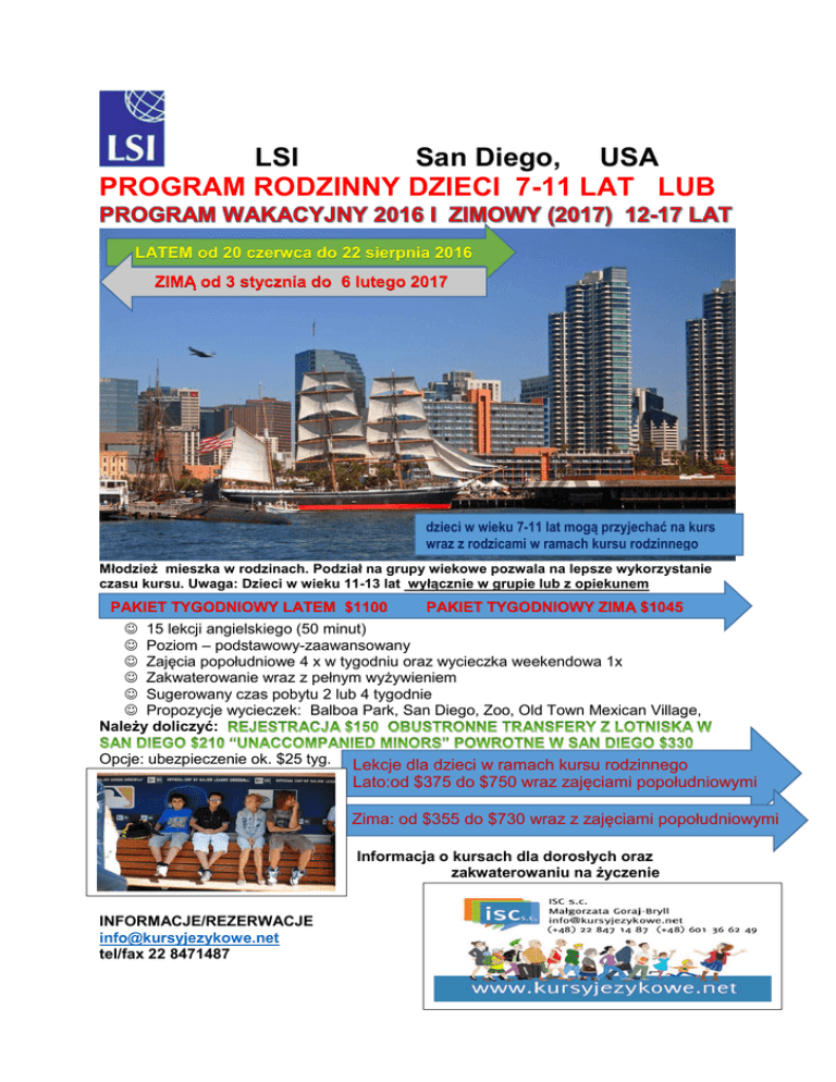 LSI San Diego, USA PROGRAM RODZINNY DZIECI 7-11 LAT LUB LATEM od 20 czerwca do 22 sierpnia 2016 ZIMĄ od 3 stycznia do 6 lutego 2017 dzieci w wieku 7-11 lat mogą przyjechać na kurs wraz z rodzicami w ramach kursu rodzinnego Młodzież mieszka w rodzinach. Podział na grupy wiekowe pozwala na lepsze wykorzystanie czasu kursu. Uwaga: Dzieci w wieku 11-13 lat wyłącznie w grupie lub z opiekunem PAKIET TYGODNIOWY LATEM $1100 PAKIET TYGODNIOWY ZIMĄ $1045 15 lekcji angielskiego (50 minut) Poziom – podstawowy-zaawansowany Zajęcia popołudniowe 4 x w tygodniu oraz wycieczka weekendowa 1x Zakwaterowanie wraz z pełnym wyżywieniem Sugerowany czas pobytu 2 lub 4 tygodnie Propozycje wycieczek: Balboa Park, San Diego, Zoo, Old Town Mexican Village, Należy doliczyć: Opcje: ubezpieczenie ok. $25 tyg. Lekcje dla dzieci w ramach kursu rodzinnego Lato:od $375 do $750 wraz zajęciami popołudniowymi Zima: od $355 do $730 wraz z zajęciami popołudniowymi Informacja o kursach dla dorosłych oraz zakwaterowaniu na życzenie INFORMACJE/REZERWACJE [email protected] tel/fax 22 8471487