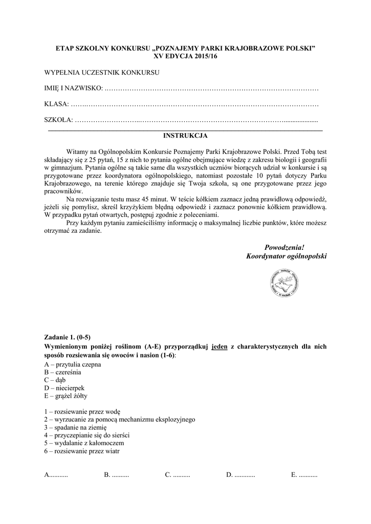 ETAP SZKOLNY KONKURSU „POZNAJEMY PARKI KRAJOBRAZOWE POLSKI” XV EDYCJA 2015/16 WYPEŁNIA UCZESTNIK KONKURSU IMIĘ I NAZWISKO: .………………………………………………………………………………… KLASA: …….………………………………………………………………………………………… SZKOŁA: ………………………..……………………………………………………….................... ________________________________________________________________________ INSTRUKCJA Witamy na Ogólnopolskim Konkursie Poznajemy Parki Krajobrazowe Polski. Przed Tobą test składający się z 25 pytań, 15 z nich to pytania ogólne obejmujące wiedzę z zakresu biologii i geografii w gimnazjum. Pytania ogólne są takie same dla wszystkich uczniów biorących udział w konkursie i są przygotowane przez koordynatora ogólnopolskiego, natomiast pozostałe 10 pytań dotyczy Parku Krajobrazowego, na terenie którego znajduje się Twoja szkoła, są one przygotowane przez jego pracowników. Na rozwiązanie testu masz 45 minut. W teście kółkiem zaznacz jedną prawidłową odpowiedź, jeżeli się pomylisz, skreśl krzyżykiem błędną odpowiedź i zaznacz ponownie kółkiem prawidłową. W przypadku pytań otwartych, postępuj zgodnie z poleceniami. Przy każdym pytaniu zamieściliśmy informację o maksymalnej liczbie punktów, które możesz otrzymać za zadanie. Powodzenia! Koordynator ogólnopolski Zadanie 1. (0-5) Wymienionym poniżej roślinom (A-E) przyporządkuj jeden z charakterystycznych dla nich sposób rozsiewania się owoców i nasion (1-6): A – przytulia czepna B – czereśnia C – dąb D – niecierpek E – grążel żółty 1 – rozsiewanie przez wodę 2 – wyrzucanie za pomocą mechanizmu eksplozyjnego 3 – spadanie na ziemię 4 – przyczepianie się do sierści 5 – wydalanie z kałomoczem 6 – rozsiewanie przez wiatr A........... B. .......... C. .......... D. ............ E. ........... Zadanie 2. (0-1) Wskaż prawidłową odpowiedź. Nerwacja (unerwienie) liścia to: a) pasma tkanek wzmacniających b) system wiązek przewodzących c) system przestrzeni międzykomórkowych d) miękisz zasadniczy wypełniający wnętrze Zadanie 3. (0-1) U roślin wyróżniamy łodygi zielne i zdrewniałe. Wskaż odpowiedź, w której zapisano tylko nazwy roślin o łodygach zielnych: a) cykoria podróżnik, mak polny, bluszcz pospolity, chaber bławatek b) stokrotka polna, konwalia majowa, cykoria podróżnik, fiołek leśny c) zawilec gajowy, borówka czernica, wrzos, śnieżyczka przebiśnieg d) groch zwyczajny, malina, agrest, koper Zadanie 4. (0-1) Wskaż prawidłową odpowiedź. Jedną z cech przystosowujących ryby do życia w wodzie jest: a) prosta budowa układu pokarmowego b) nieruchome połączenie czaszki z kręgosłupem c) wykształcenie zamkniętego układu krwionośnego d) połączenie czaszki z kręgosłupem za pomocą jednego kłykcia potylicznego Zadanie 5. (0-1) Wskaż prawidłową odpowiedź. Padalec zwyczajny to: a) niejadowity wąż b) beznoga jaszczurka c) beznogi płaz d) przedstawiciel pierścienic Zadanie 6. (0-1) Spośród podanych określeń wybierz i zaznacz następstwo ruchu obiegowego Ziemi: a) pozorny ruch słońca i innych gwiazd po sklepieniu niebieskim b) występowanie dnia i nocy c) zmienna długość trwania dnia i nocy d) różnica czasu słonecznego pomiędzy miejscami położonymi na różnych południkach Zadanie 7. (0-1) Wskaż prawidłową odpowiedź. Węgiel kamienny jest skałą: a) osadową chemiczną b) metamorficzną c) magmową d) osadową organiczną Zadanie 8. (0-1) Wskaż prawidłową odpowiedź. Kryterium i bezowodniowce jest: a) obecność błon płodowych lub ich brak b) rodzaj i funkcjonowanie łożyska lub jego brak c) wodny lub lądowy tryb życia d) obecność larw żyjących w wodzie lub na lądzie podziału strunowców na owodniowce Zadanie 9. (0-4) Do podanych niżej opisów dopasuj właściwe daty spośród podanych: 21 marca, 22 czerwca, 23 września, 22 grudnia. a) Promienie słoneczne padają pod kątem prostym na zwrotnik Raka. Na półkuli północnej dzień trwa wówczas najdłużej, a noc najkrócej w roku. …………………………………… b) Na półkuli północnej zaczyna się wówczas wiosna, a na południowej jesień. Słońce góruje w zenicie na równiku. …………………………………………………… c) Słońce góruje w zenicie na zwrotniku Koziorożca. Na półkuli północnej dzień trwa wówczas najkrócej, a noc najdłużej w roku. ………………………………………… d) Na półkuli południowej zaczyna się wówczas wiosna, a na północnej jesień. Słońce góruje w zenicie na równiku. Zadanie 10. (0-1) Włosy, paznokcie, pazury i kopyta ssaków są wytworami skóry, a dokładnie jednej z jej warstw. Wskaż której: a) oskórka b) naskórka c) warstwy gruczołowej d) skóry właściwej Zadanie 11. (0-1) Wskaż czego symbolem jest znak umieszczony obok: a) oczyszczalni ścieków b) dzikich wysypisk śmieci c) recyklingu d) skażonego terenu Zadanie 12. (0-1) Wskaż, które z poniższych grup organizmów warunkują krążenie materii i przepływ energii w ekosystemach: a) producenci, konsumenci, c) producenci, roślinożercy, reducenci drapieżcy b) roślinożercy, drapieżcy, d) bakterie, grzyby, porosty reducenci Zadanie 13. (0-2) Na podstawie opisów rozpoznaj i wpisz nazwę grupy organizmów cudzożywnych: a) Organizmy, żywiące się martwymi zwierzętami. Należą do nich sępy i hieny. ................................................................................. b) Organizmy, polujące na zdobycz. Należą do nich gepardy, lwy i krokodyle. ................................................................................. Zadanie 14. (0-4) Wpisz nazwy opisanych wiatrów: a) Zmienia swój kierunek w rytmie dobowym, jest wywołany różnym nagrzewaniem się lądu i morza........................